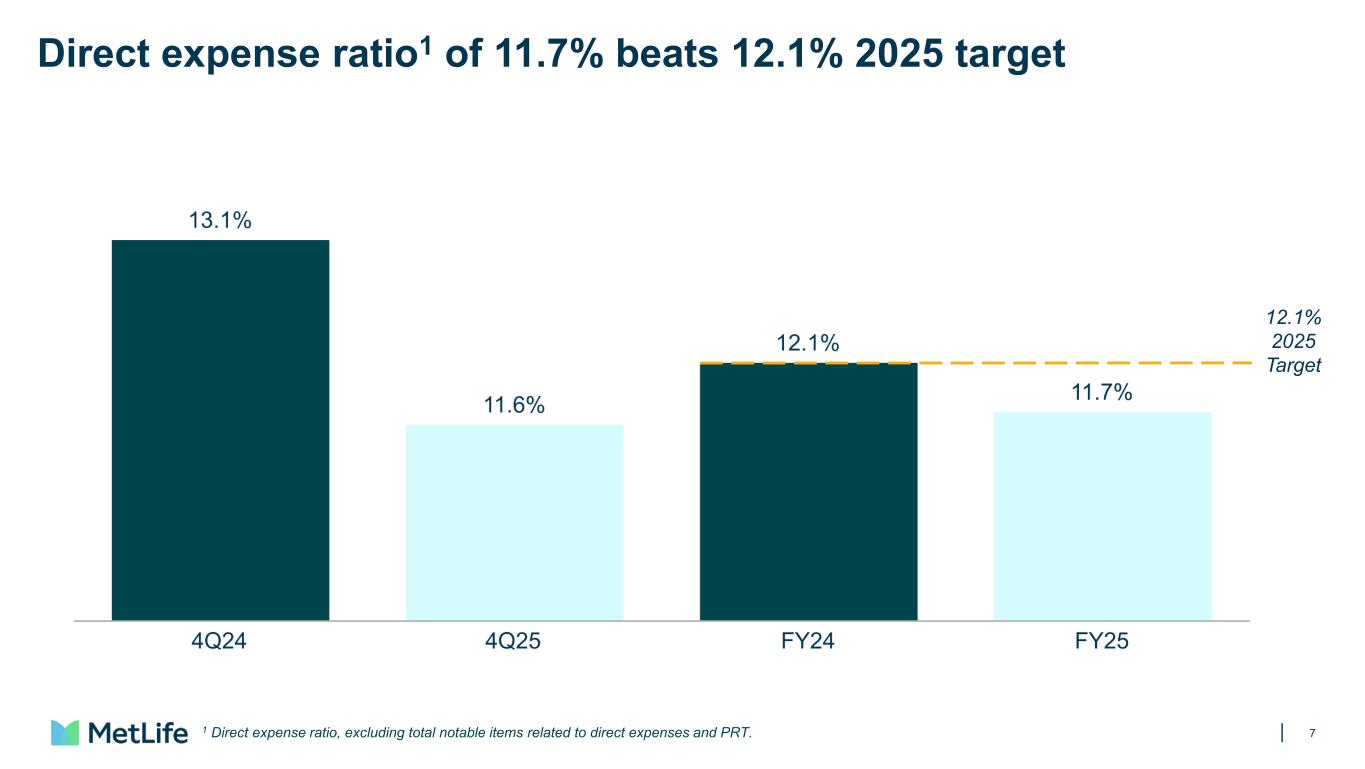 71 Direct expense ratio, excluding total notable items related to direct expenses and PRT. 12.1% 2025 Target Direct expense ratio1 of 11.7% beats 12.1% 2025 target