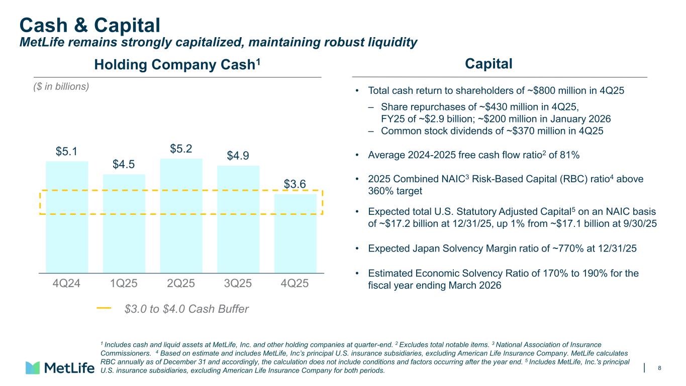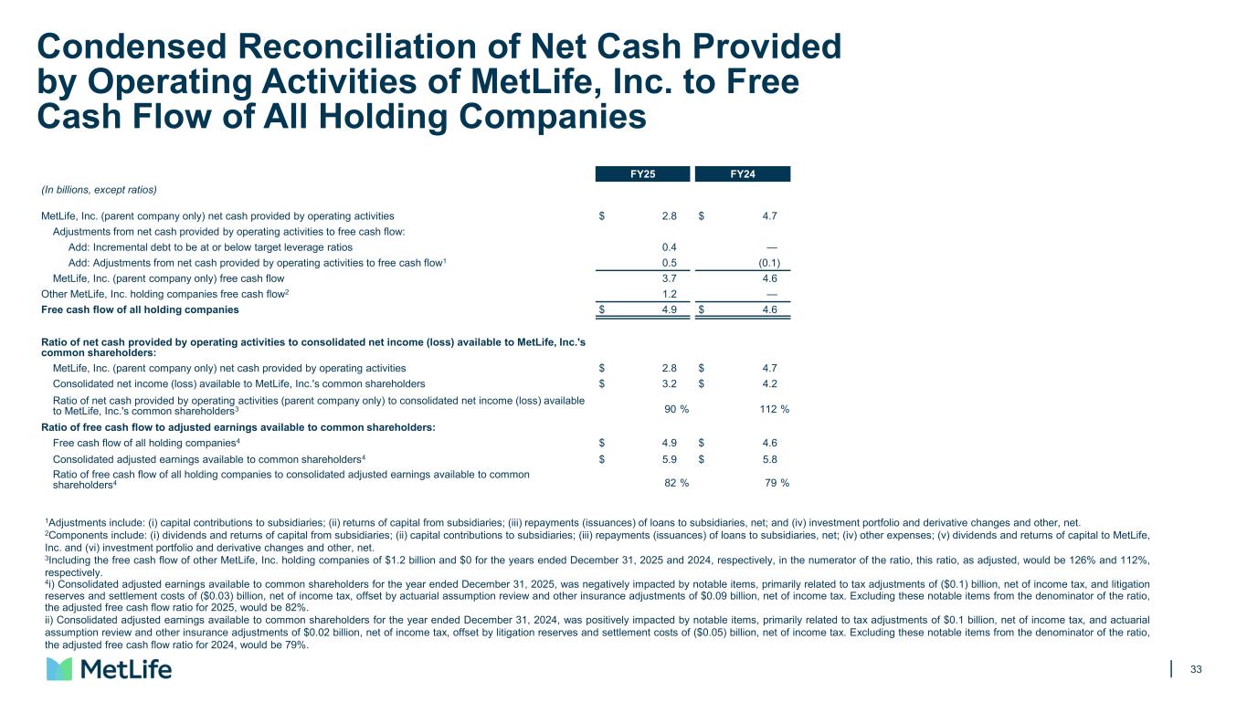 33 Condensed Reconciliation of Net Cash Provided by Operating Activities of MetLife, Inc. to Free Cash Flow of All Holding Companies FY25 FY24 (In billions, except ratios) MetLife, Inc. (parent company only) net cash provided by operating activities $ 2.8 $ 4.7 Adjustments from net cash provided by operating activities to free cash flow: Add: Incremental debt to be at or below target leverage ratios 0.4 — Add: Adjustments from net cash provided by operating activities to free cash flow1 0.5 (0.1) MetLife, Inc. (parent company only) free cash flow 3.7 4.6 Other MetLife, Inc. holding companies free cash flow2 1.2 — Free cash flow of all holding companies $ 4.9 $ 4.6 Ratio of net cash provided by operating activities to consolidated net income (loss) available to MetLife, Inc.'s common shareholders: MetLife, Inc. (parent company only) net cash provided by operating activities $ 2.8 $ 4.7 Consolidated net income (loss) available to MetLife, Inc.'s common shareholders $ 3.2 $ 4.2 Ratio of net cash provided by operating activities (parent company only) to consolidated net income (loss) available to MetLife, Inc.'s common shareholders3 90 % 112 % Ratio of free cash flow to adjusted earnings available to common shareholders: Free cash flow of all holding companies4 $ 4.9 $ 4.6 Consolidated adjusted earnings available to common shareholders4 $ 5.9 $ 5.8 Ratio of free cash flow of all holding companies to consolidated adjusted earnings available to common shareholders4 82 % 79 % 1Adjustments include: (i) capital contributions to subsidiaries; (ii) returns of capital from subsidiaries; (iii) repayments (issuances) of loans to subsidiaries, net; and (iv) investment portfolio and derivative changes and other, net. 2Components include: (i) dividends and returns of capital from subsidiaries; (ii) capital contributions to subsidiaries; (iii) repayments (issuances) of loans to subsidiaries, net; (iv) other expenses; (v) dividends and returns of capital to MetLife, Inc. and (vi) investment portfolio and derivative changes and other, net. 3Including the free cash flow of other MetLife, Inc. holding companies of $1.2 billion and $0 for the years ended December 31, 2025 and 2024, respectively, in the numerator of the ratio, this ratio, as adjusted, would be 126% and 112%, respectively. 4i) Consolidated adjusted earnings available to common shareholders for the year ended December 31, 2025, was negatively impacted by notable items, primarily related to tax adjustments of ($0.1) billion, net of income tax, and litigation reserves and settlement costs of ($0.03) billion, net of income tax, offset by actuarial assumption review and other insurance adjustments of $0.09 billion, net of income tax. Excluding these notable items from the denominator of the ratio, the adjusted free cash flow ratio for 2025, would be 82%. ii) Consolidated adjusted earnings available to common shareholders for the year ended December 31, 2024, was positively impacted by notable items, primarily related to tax adjustments of $0.1 billion, net of income tax, and actuarial assumption review and other insurance adjustments of $0.02 billion, net of income tax, offset by litigation reserves and settlement costs of ($0.05) billion, net of income tax. Excluding these notable items from the denominator of the ratio, the adjusted free cash flow ratio for 2024, would be 79%.