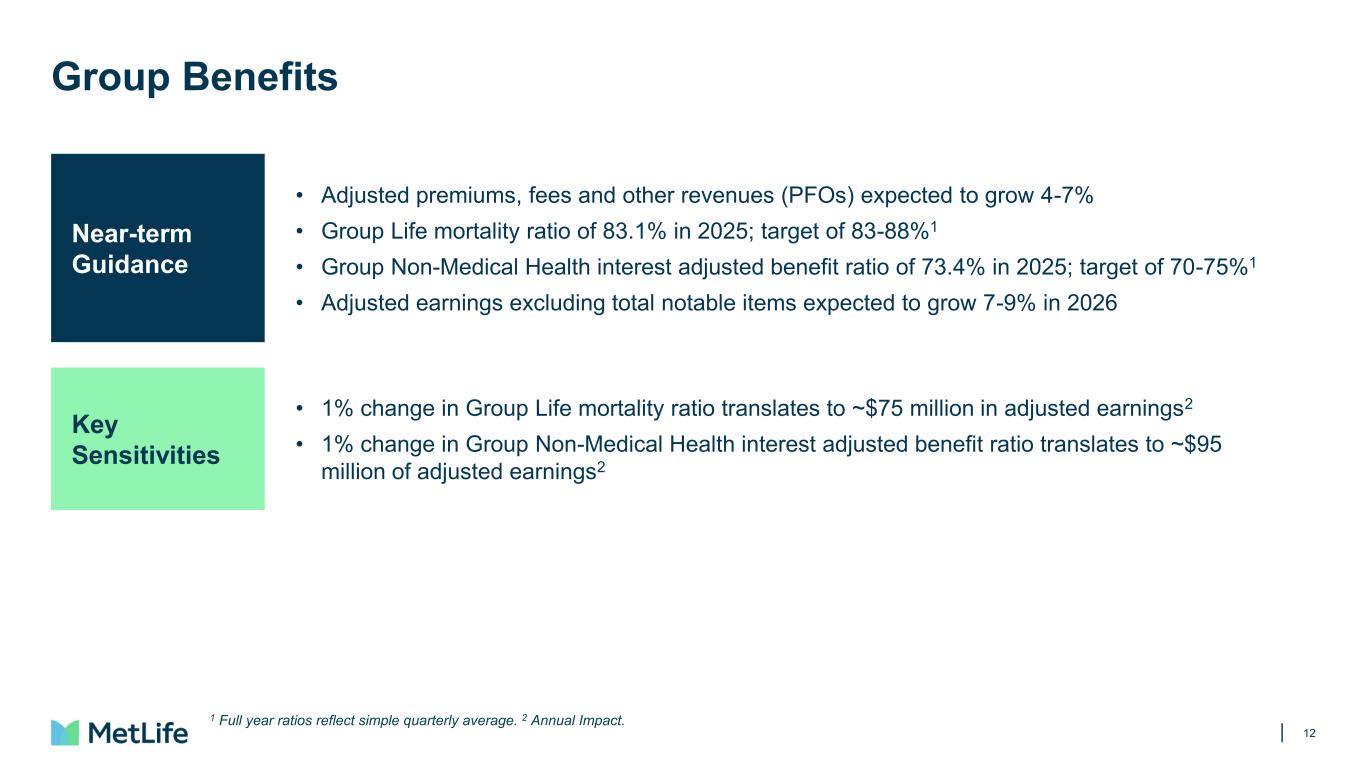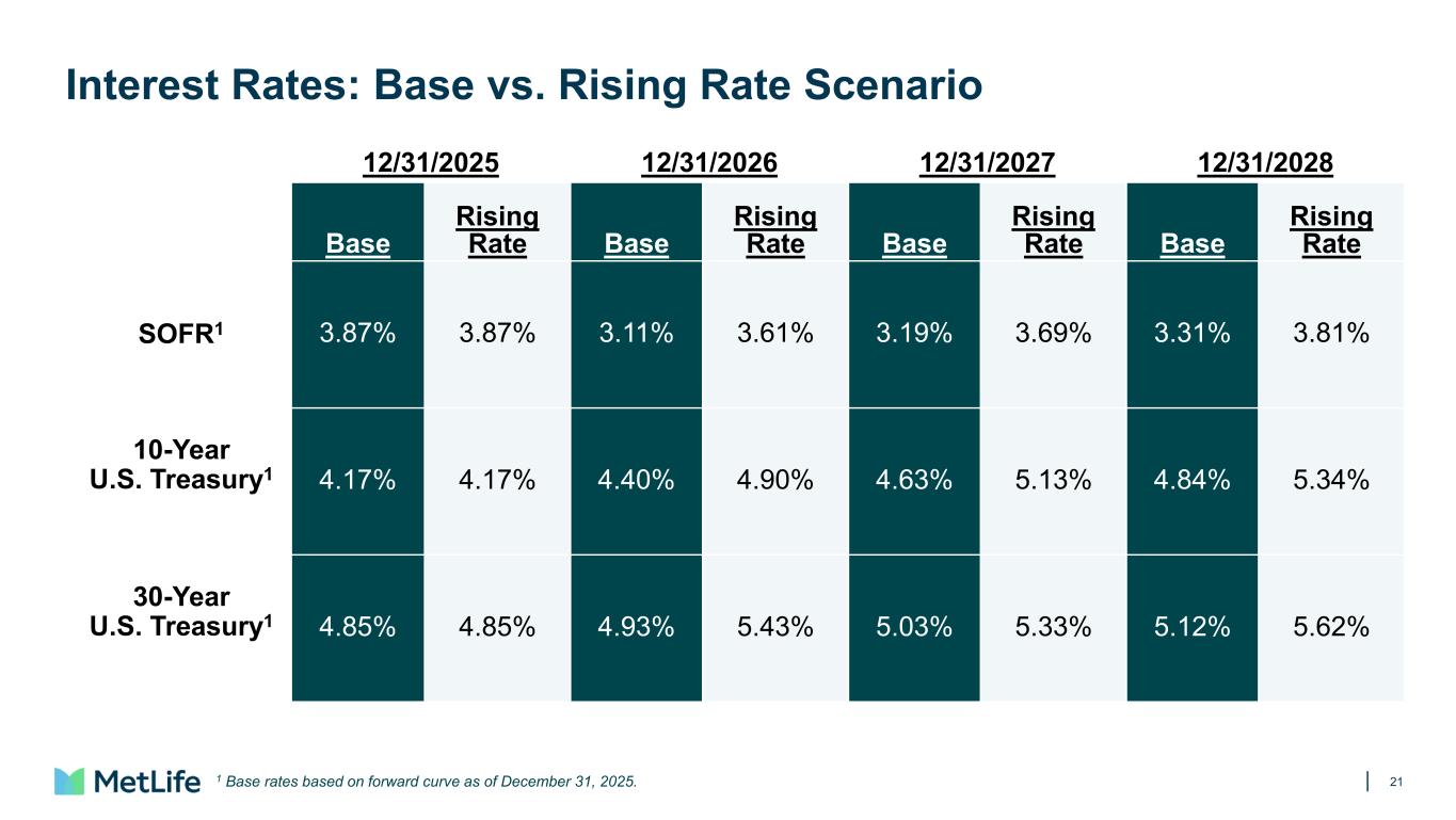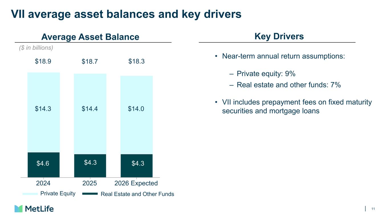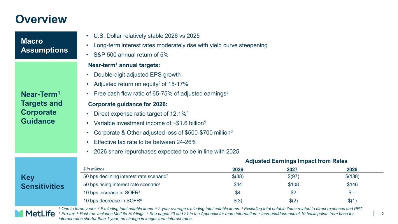 10 1 One to three years. 2 Excluding total notable items. 3 2-year average excluding total notable items. 4 Excluding total notable items related to direct expenses and PRT. 5 Pre-tax. 6 Post-tax. Includes MetLife Holdings. 7 See pages 20 and 21 in the Appendix for more information. 8 Increase/decrease of 10 basis points from base for interest rates shorter than 1 year; no change in longer-term interest rates. Overview • U.S. Dollar relatively stable 2026 vs 2025 • Long-term interest rates moderately rise with yield curve steepening • S&P 500 annual return of 5% Macro Assumptions Near-Term1 Targets and Corporate Guidance Key Sensitivities Adjusted Earnings Impact from Rates $ in millions 2026 2027 2028 50 bps declining interest rate scenario7 $(38) $(97) $(138) 50 bps rising interest rate scenario7 $44 $108 $146 10 bps increase in SOFR8 $4 $2 $— 10 bps decrease in SOFR8 $(3) $(2) $(1) Near-term1 annual targets: • Double-digit adjusted EPS growth • Adjusted return on equity2 of 15-17% • Free cash flow ratio of 65-75% of adjusted earnings3 Corporate guidance for 2026: • Direct expense ratio target of 12.1%4 • Variable investment income of ~$1.6 billion5 • Corporate & Other adjusted loss of $500-$700 million6 • Effective tax rate to be between 24-26% • 2026 share repurchases expected to be in line with 2025