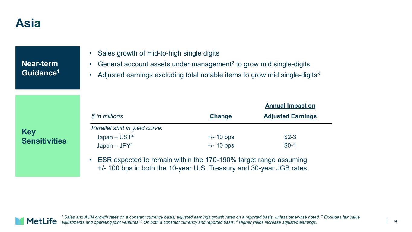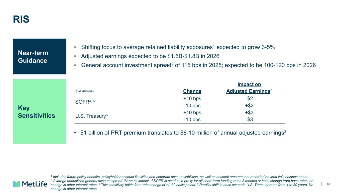 1313 RIS Near-term Guidance Key Sensitivities • $1 billion of PRT premium translates to $8-10 million of annual adjusted earnings3 Impact on $ in millions Change Adjusted Earnings3 SOFR4, 5 +10 bps -$2 -10 bps +$2 U.S. Treasury6 +10 bps +$3 -10 bps -$3 1 Includes future policy benefits, policyholder account liabilities,and separate account liabilities, as well as notional amounts not recorded on MetLife's balance sheet. 2 Average annualized general account spread. 3 Annual impact. 4 SOFR is used as a proxy for all short-term funding rates 3 months or less; change from base rates, no change in other interest rates. 5 This sensitivity holds for a rate change of +/- 50 basis points. 6 Parallel shift in base scenario U.S. Treasury rates from 1 to 30 years. No change in other interest rates. • Shifting focus to average retained liability exposures1 expected to grow 3-5% • Adjusted earnings expected to be $1.6B-$1.8B in 2026 • General account investment spread2 of 115 bps in 2025; expected to be 100-120 bps in 2026