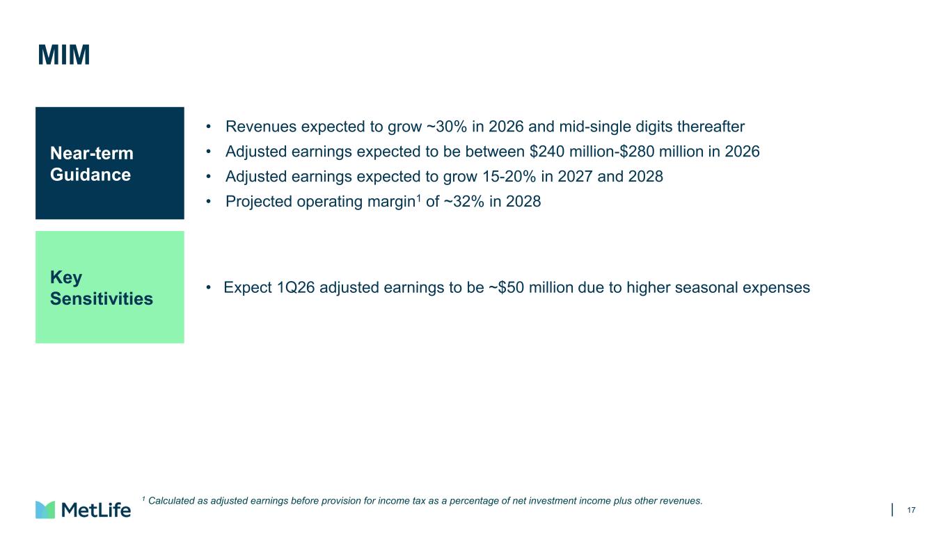 1717 MIM • Revenues expected to grow ~30% in 2026 and mid-single digits thereafter • Adjusted earnings expected to be between $240 million-$280 million in 2026 • Adjusted earnings expected to grow 15-20% in 2027 and 2028 • Projected operating margin1 of ~32% in 2028 Near-term Guidance Key Sensitivities • Expect 1Q26 adjusted earnings to be ~$50 million due to higher seasonal expenses 1 Calculated as adjusted earnings before provision for income tax as a percentage of net investment income plus other revenues.