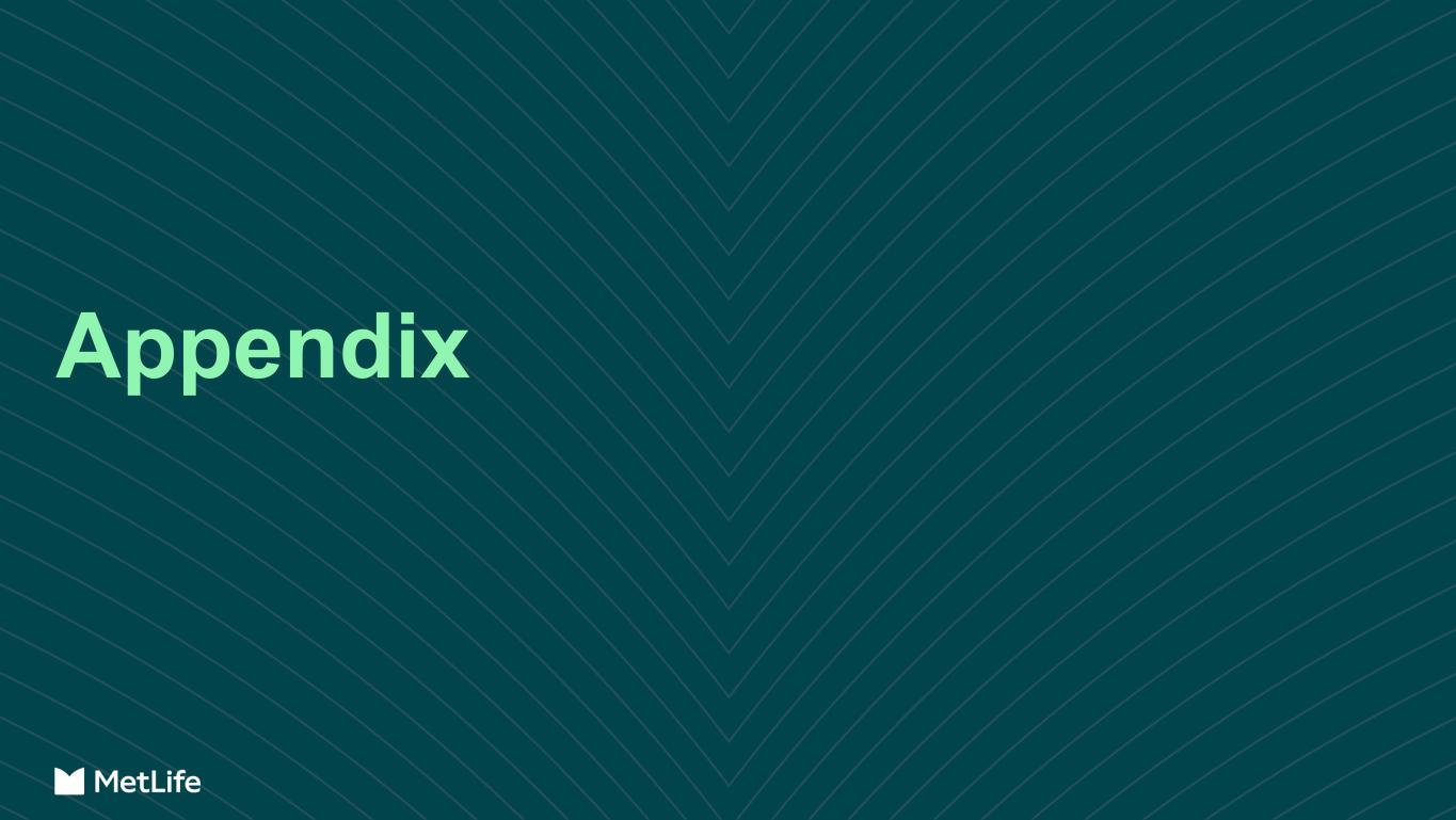 27 Explanatory Note on Non-GAAP and Other Financial Information (Continued) Assets Under Management (Continued) • Asia General Account AUM (“Asia GA AUM”) is used by MetLife to describe assets in its Asia GA investment portfolio. Asia GA AUM is stated at estimated fair value and is comprised of Asia GA total investments, the portion of the Asia GA investment portfolio classified within assets held-for-sale, cash and cash equivalents, and accrued investment income on such assets, and excludes policy loans, certain contractholder-directed equity securities, fair value option securities, mortgage loans originated for third parties, assets subject to ceded reinsurance arrangements with third parties and joint ventures, and certain other invested assets. Mortgage loans and real estate and real estate joint ventures included in Asia GA AUM (at net asset value, net of deduction for encumbering debt) have been adjusted from carrying value to estimated fair value. At the segment level, intersegment balances (intercompany activity, primarily related to investments in subsidiaries, that eliminate at the MetLife consolidated level) are excluded from Asia GA AUM. Asia GA AUM (at amortized cost) excludes the following adjustments: (i) unrealized gain (loss) on investments carried at estimated fair value and (ii) adjustments from carrying value to estimated fair value on mortgage loans and real estate and real estate joint ventures. Asia GA AUM (at amortized cost) is presented net of related allowance for credit loss. Other items The following additional information is relevant to an understanding of MetLife’s performance: • Statistical sales information: • Group Benefits: calculated using 10% of single premium deposits and 100% of annualized full-year premiums and fees from recurring premium policy sales of all products. • Retirement and Income Solutions: calculated using 10% of single premium contracts, on and off-balance sheet deposits, and the contract value for new U.K. longevity reinsurance contracts, and 100% of annualized full-year premiums and fees only from recurring premium policy sales of specialized benefit resources and corporate-owned life insurance. • Asia, Latin America and EMEA: calculated using 10% of single premium deposits (mainly from retirement products such as variable annuity, fixed annuity and pensions), 20% of single premium deposits from credit insurance and 100% of annualized full-year premiums and fees from recurring-premium policy sales of all products (mainly from risk and protection products such as individual life, accident & health and group). Sales statistics do not correspond to revenues under GAAP, but are used as relevant measures of business activity. • Volume growth, where cited, represents the change in certain measures of our segment results, including adjusted earnings, attributable to business growth, applying a model in which certain margins and factors are held constant, the most significant of which are underwriting margins, investment margins, changes in equity market performance, expense margins and the impact of changes in foreign currency exchange rates. • PRT includes U.K. funded reinsurance. • Institutional net flows reflect Institutional Client AUM total fund additions less withdrawals. • “Third-party mortgage loan activity” relates to amounts associated with mortgage loans originated and acquired for third parties, including (i) the related investment returns and expenses which are passed through to the third-party lenders and (ii) the corresponding mortgage loan assets. • We refer to observable forward yield curves as of a particular date in connection with making our estimates for future results. The observable forward yield curves at a given time are based on implied future interest rates along a range of interest rate durations. This includes the 10-year U.S. Treasury rate which we use as a benchmark rate to describe longer-term interest rates used in our estimates for future results. • Notable items reflect the unexpected impact of events that affect MetLife’s results, but that were unknown and that MetLife could not anticipate when it devised its business plan. Notable items also include certain items regardless of the extent anticipated in the business plan, to help investors have a better understanding of MetLife’s results and to evaluate and forecast those results. Notable items represent a positive (negative) impact to adjusted earnings available to common shareholders. • Holding company cash and liquid assets are held by MetLife, Inc. collectively with other MetLife holding companies and include cash and cash equivalents, short-term investments and publicly traded securities excluding assets that are pledged or otherwise committed. Assets pledged or otherwise committed include amounts received in connection with securities lending, repurchase agreements, derivatives, regulatory deposits, the collateral financing arrangement, funding agreements and secured borrowings, as well as amounts held in the closed block. • MetLife uses a measure of free cash flow to facilitate an understanding of its ability to generate cash for reinvestment into its businesses or use in non-mandatory capital actions. MetLife defines free cash flow as the sum of cash available at MetLife’s holding companies from dividends from operating subsidiaries, expenses and other net flows of the holding companies (including capital contributions to subsidiaries), and net contributions from debt to be at or below target leverage ratios. This measure of free cash flow is prior to capital actions, such as common stock dividends and repurchases, debt reduction and mergers and acquisitions. Free cash flow should not be viewed as a substitute for net cash provided by (used in) operating activities calculated in accordance with GAAP. The free cash flow ratio is typically expressed as a percentage of annual adjusted earnings available to c