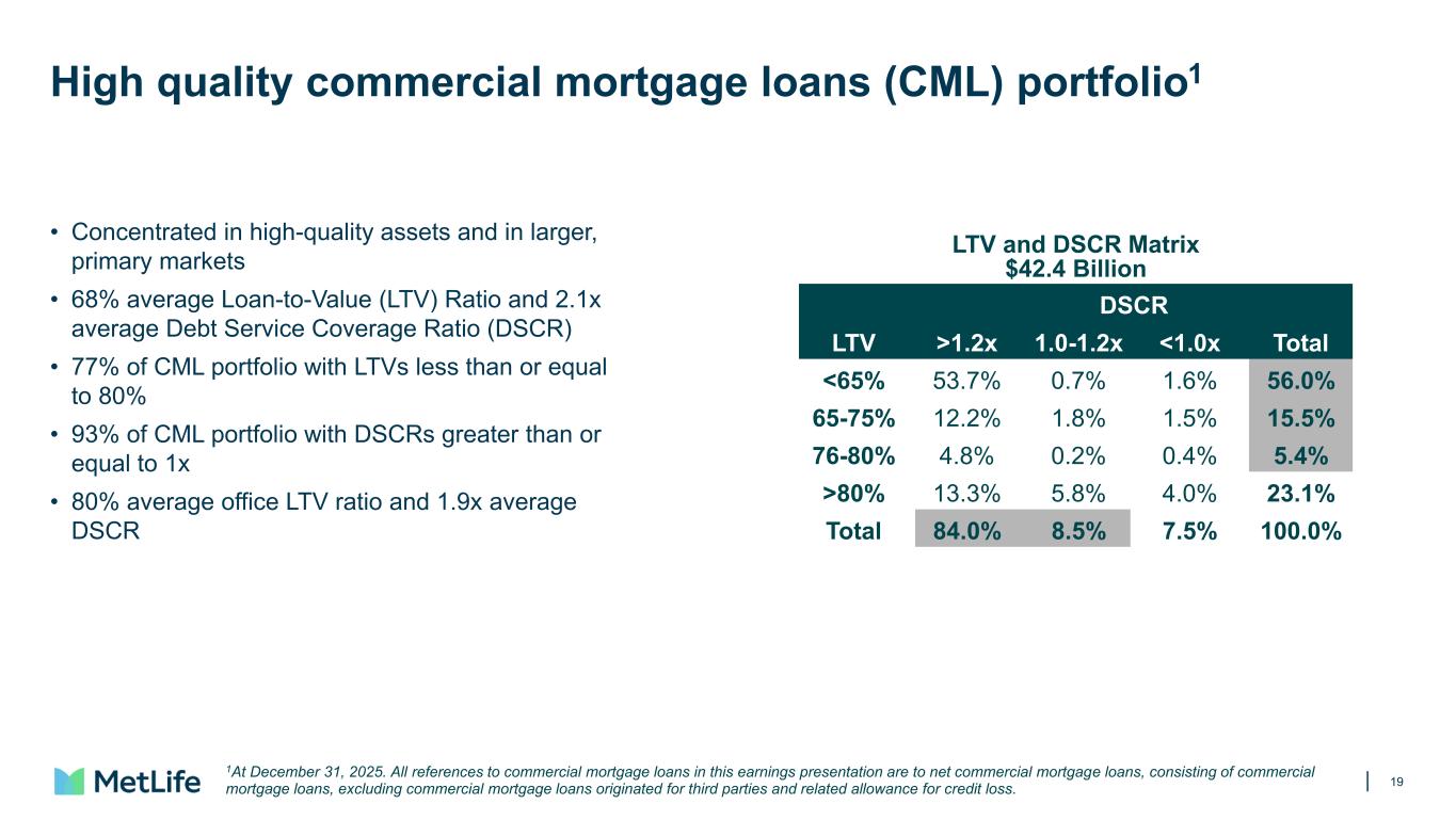 19 1At December 31, 2025. All references to commercial mortgage loans in this earnings presentation are to net commercial mortgage loans, consisting of commercial mortgage loans, excluding commercial mortgage loans originated for third parties and related allowance for credit loss. High quality commercial mortgage loans (CML) portfolio1 • Concentrated in high-quality assets and in larger, primary markets • 68% average Loan-to-Value (LTV) Ratio and 2.1x average Debt Service Coverage Ratio (DSCR) • 77% of CML portfolio with LTVs less than or equal to 80% • 93% of CML portfolio with DSCRs greater than or equal to 1x • 80% average office LTV ratio and 1.9x average DSCR LTV and DSCR Matrix $42.4 Billion DSCR LTV >1.2x 1.0-1.2x <1.0x Total <65% 53.7% 0.7% 1.6% 56.0% 65-75% 12.2% 1.8% 1.5% 15.5% 76-80% 4.8% 0.2% 0.4% 5.4% >80% 13.3% 5.8% 4.0% 23.1% Total 84.0% 8.5% 7.5% 100.0%