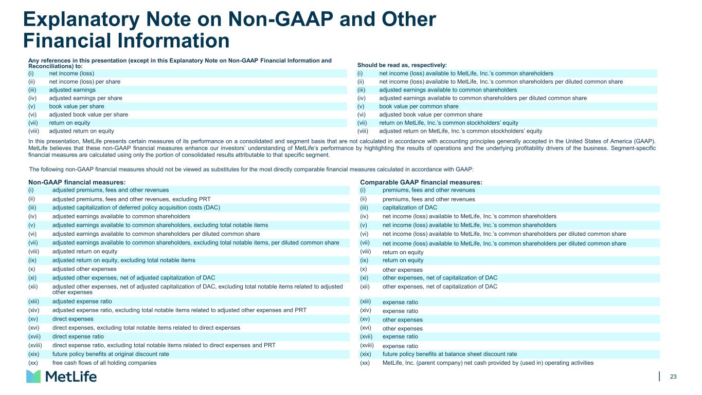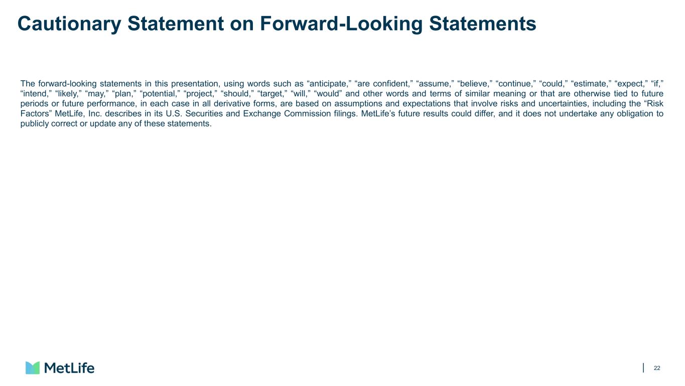 22 Cautionary Statement on Forward-Looking Statements The forward-looking statements in this presentation, using words such as “anticipate,” “are confident,” “assume,” “believe,” “continue,” “could,” “estimate,” “expect,” “if,” “intend,” “likely,” “may,” “plan,” “potential,” “project,” “should,” “target,” “will,” “would” and other words and terms of similar meaning or that are otherwise tied to future periods or future performance, in each case in all derivative forms, are based on assumptions and expectations that involve risks and uncertainties, including the “Risk Factors” MetLife, Inc. describes in its U.S. Securities and Exchange Commission filings. MetLife’s future results could differ, and it does not undertake any obligation to publicly correct or update any of these statements.