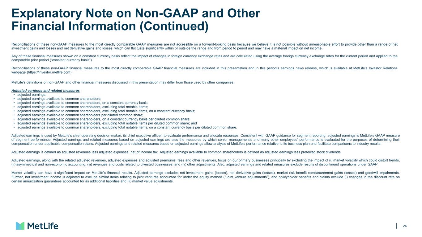 23 Explanatory Note on Non-GAAP and Other Financial Information Any references in this presentation (except in this Explanatory Note on Non-GAAP Financial Information and Reconciliations) to: Should be read as, respectively: (i) net income (loss) (i) net income (loss) available to MetLife, Inc.’s common shareholders (ii) net income (loss) per share (ii) net income (loss) available to MetLife, Inc.’s common shareholders per diluted common share (iii) adjusted earnings (iii) adjusted earnings available to common shareholders (iv) adjusted earnings per share (iv) adjusted earnings available to common shareholders per diluted common share (v) book value per share (v) book value per common share (vi) adjusted book value per share (vi) adjusted book value per common share (vii) return on equity (vii) return on MetLife, Inc.’s common stockholders’ equity (viii) adjusted return on equity (viii) adjusted return on MetLife, Inc.’s common stockholders’ equity In this presentation, MetLife presents certain measures of its performance on a consolidated and segment basis that are not calculated in accordance with accounting principles generally accepted in the United States of America (GAAP). MetLife believes that these non-GAAP financial measures enhance our investors’ understanding of MetLife’s performance by highlighting the results of operations and the underlying profitability drivers of the business. Segment-specific financial measures are calculated using only the portion of consolidated results attributable to that specific segment. The following non-GAAP financial measures should not be viewed as substitutes for the most directly comparable financial measures calculated in accordance with GAAP: Non-GAAP financial measures: Comparable GAAP financial measures: (i) adjusted premiums, fees and other revenues (i) premiums, fees and other revenues (ii) adjusted premiums, fees and other revenues, excluding PRT (ii) premiums, fees and other revenues (iii) adjusted capitalization of deferred policy acquisition costs (DAC) (iii) capitalization of DAC (iv) adjusted earnings available to common shareholders (iv) net income (loss) available to MetLife, Inc.’s common shareholders (v) adjusted earnings available to common shareholders, excluding total notable items (v) net income (loss) available to MetLife, Inc.’s common shareholders (vi) adjusted earnings available to common shareholders per diluted common share (vi) net income (loss) available to MetLife, Inc.’s common shareholders per diluted common share (vii) adjusted earnings available to common shareholders, excluding total notable items, per diluted common share (vii) net income (loss) available to MetLife, Inc.’s common shareholders per diluted common share (viii) adjusted return on equity (viii) return on equity (ix) adjusted return on equity, excluding total notable items (ix) return on equity (x) adjusted other expenses (x) other expenses (xi) adjusted other expenses, net of adjusted capitalization of DAC (xi) other expenses, net of capitalization of DAC (xii) adjusted other expenses, net of adjusted capitalization of DAC, excluding total notable items related to adjusted other expenses (xii) other expenses, net of capitalization of DAC (xiii) adjusted expense ratio (xiii) expense ratio (xiv) adjusted expense ratio, excluding total notable items related to adjusted other expenses and PRT (xiv) expense ratio (xv) direct expenses (xv) other expenses (xvi) direct expenses, excluding total notable items related to direct expenses (xvi) other expenses (xvii) direct expense ratio (xvii) expense ratio (xviii) direct expense ratio, excluding total notable items related to direct expenses and PRT (xviii) expense ratio (xix) future policy benefits at original discount rate (xix) future policy benefits at balance sheet discount rate (xx) free cash flows of all holding companies (xx) MetLife, Inc. (parent company) net cash provided by (used in) operating activities