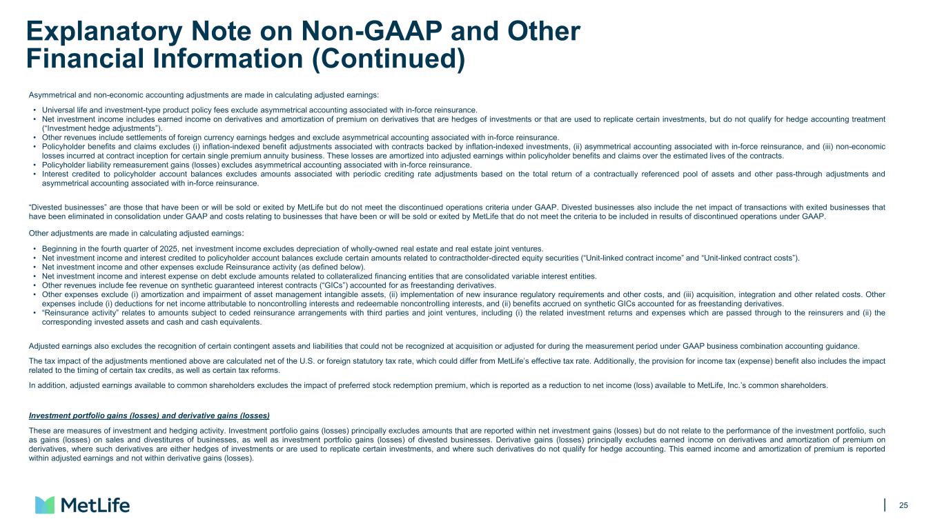 24 MetLife’s definitions of non-GAAP and other financial measures discussed in this presentation may differ from those used by other companies: Adjusted earnings and related measures • adjusted earnings; • adjusted earnings available to common shareholders; • adjusted earnings available to common shareholders, on a constant currency basis; • adjusted earnings available to common shareholders, excluding total notable items; • adjusted earnings available to common shareholders, excluding total notable items, on a constant currency basis; • adjusted earnings available to common shareholders per diluted common share; • adjusted earnings available to common shareholders, on a constant currency basis per diluted common share; • adjusted earnings available to common shareholders, excluding total notable items per diluted common share; and • adjusted earnings available to common shareholders, excluding total notable items, on a constant currency basis per diluted common share. Adjusted earnings is used by MetLife’s chief operating decision maker, its chief executive officer, to evaluate performance and allocate resources. Consistent with GAAP guidance for segment reporting, adjusted earnings is MetLife’s GAAP measure of segment performance. Adjusted earnings and related measures based on adjusted earnings are also the measures by which senior management’s and many other employees’ performance is evaluated for the purposes of determining their compensation under applicable compensation plans. Adjusted earnings and related measures based on adjusted earnings allow analysis of MetLife’s performance relative to its business plan and facilitate comparisons to industry results. Adjusted earnings is defined as adjusted revenues less adjusted expenses, net of income tax. Adjusted earnings available to common shareholders is defined as adjusted earnings less preferred stock dividends. Adjusted earnings, along with the related adjusted revenues, adjusted expenses and adjusted premiums, fees and other revenues, focus on our primary businesses principally by excluding the impact of (i) market volatility which could distort trends, (ii) asymmetrical and non-economic accounting, (iii) revenues and costs related to divested businesses, and (iv) other adjustments. Also, adjusted earnings and related measures exclude results of discontinued operations under GAAP. Market volatility can have a significant impact on MetLife’s financial results. Adjusted earnings excludes net investment gains (losses), net derivative gains (losses), market risk benefit remeasurement gains (losses) and goodwill impairments. Further, net investment income is adjusted to exclude similar items relating to joint ventures accounted for under the equity method (“Joint venture adjustments”), and policyholder benefits and claims exclude (i) changes in the discount rate on certain annuitization guarantees accounted for as additional liabilities and (ii) market value adjustments. Explanatory Note on Non-GAAP and Other Financial Information (Continued) Reconciliations of these non-GAAP measures to the most directly comparable GAAP measures are not accessible on a forward-looking basis because we believe it is not possible without unreasonable effort to provide other than a range of net investment gains and losses and net derivative gains and losses, which can fluctuate significantly within or outside the range and from period to period and may have a material impact on net income. Any of these financial measures shown on a constant currency basis reflect the impact of changes in foreign currency exchange rates and are calculated using the average foreign currency exchange rates for the current period and applied to the comparable prior period (“constant currency basis”). Reconciliations of these non-GAAP financial measures to the most directly comparable GAAP financial measures are included in this presentation and in this period’s earnings news release, which is available at MetLife’s Investor Relations webpage (https://investor.metlife.com).