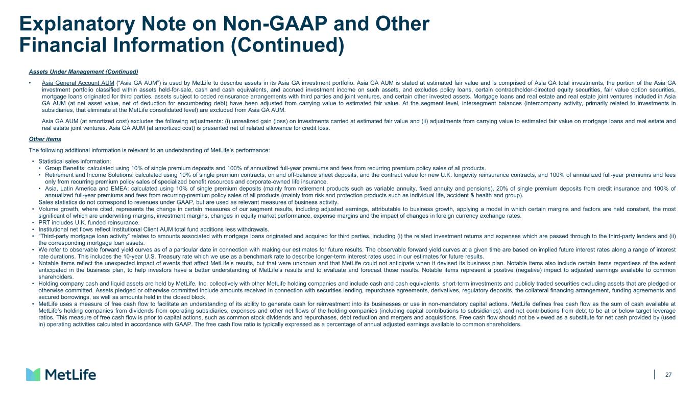 26 Explanatory Note on Non-GAAP and Other Financial Information (Continued) Return on equity and related measures • Total MetLife, Inc.’s adjusted common stockholders’ equity: total MetLife, Inc.’s common stockholders’ equity, excluding unrealized investment gains (losses), net of related offsets, deferred gains (losses) on derivatives, future policy benefits discount rate remeasurement gains (losses), market risk benefits instrument-specific credit risk remeasurement gains (losses) and defined benefit plans adjustment components of accumulated other comprehensive income (loss) (“AOCI”) and the estimated fair value of certain ceded reinsurance-related embedded derivatives, all net of income tax. • Total MetLife, Inc.’s adjusted common stockholders’ equity, excluding total notable items: total MetLife, Inc.’s common stockholders’ equity, excluding unrealized investment gains (losses), net of related offsets, deferred gains (losses) on derivatives, future policy benefits discount rate remeasurement gains (losses), market risk benefits instrument-specific credit risk remeasurement gains (losses) and defined benefit plans adjustment components of AOCI, the estimated fair value of certain ceded reinsurance-related embedded derivatives and total notable items, all net of income tax. • Return on MetLife, Inc.’s common stockholders’ equity: net income (loss) available to MetLife, Inc.’s common shareholders divided by MetLife, Inc.’s average common stockholders’ equity. • Adjusted return on MetLife, Inc.’s common stockholders’ equity: adjusted earnings available to common shareholders divided by MetLife, Inc.’s average adjusted common stockholders’ equity. • Adjusted return on MetLife, Inc.’s common stockholders’ equity, excluding total notable items: adjusted earnings available to common shareholders, excluding total notable items, divided by MetLife, Inc.’s average adjusted common stockholders’ equity, excluding total notable items. The above measures represent a level of equity that excludes most components of AOCI, such as unrealized investment gains (losses), net of related offsets, and future policy benefits discount rate remeasurement gains (losses), as well as the impact of certain ceded reinsurance-related embedded derivatives, as these amounts are primarily driven by market volatility. Expense ratio, direct expense ratio, adjusted expense ratio and related measures • Expense ratio: other expenses, net of capitalization of DAC, divided by premiums, fees and other revenues. • Direct expense ratio: direct expenses divided by adjusted premiums, fees and other revenues. Direct expenses are comprised of employee-related costs, third-party staffing costs, and general and administrative expenses. • Direct expense ratio, excluding total notable items related to direct expenses and PRT: direct expenses, excluding total notable items related to direct expenses, divided by adjusted premiums, fees and other revenues, excluding PRT. • Adjusted expense ratio: adjusted other expenses, net of adjusted capitalization of DAC, divided by adjusted premiums, fees and other revenues. • Adjusted expense ratio, excluding total notable items related to adjusted other expenses and PRT: adjusted other expenses, net of adjusted capitalization of DAC, excluding total notable items related to adjusted other expenses, divided by adjusted premiums, fees and other revenues, excluding PRT. Assets Under Management (“AUM”) • Total Assets Under Management (“Total AUM”) is comprised of MIM GA AUM plus Institutional Client AUM (each, as defined below). • MIM General Account AUM (“MIM GA AUM”) is used by MetLife to describe the portion of GA AUM (as defined below) that MetLife Investment Management, LLC and certain of its affiliates (“MIM”) manages or advises. • General Account AUM (“GA AUM”) is used by MetLife to describe assets in its general account (“GA”) investment portfolio. GA AUM is stated at estimated fair value and is comprised of GA total investments, the portion of the GA investment portfolio classified within assets held-for-sale, cash and cash equivalents, and accrued investment income on such assets, and excludes policy loans, certain contractholder-directed equity securities, fair value option securities, mortgage loans originated for third parties, assets subject to ceded reinsurance arrangements with third parties and joint ventures, and certain other invested assets. Mortgage loans and real estate and real estate joint ventures included in GA AUM (at net asset value, net of deduction for encumbering debt) have been adjusted from carrying value to estimated fair value. Classification of GA AUM by sector is based on the nature and characteristics of the underlying investments which can vary from how they are classified under GAAP. Accordingly, the underlying investments within certain real estate and real estate joint ventures that are primarily commercial mortgage loans (at net asset value, net of deduction for encumbering debt) have been reclassified to exclude them from real estate and real estate joint ventures and include them as commercial mortgage loans. • Institutional Client AUM is comprised of SA AUM plus Reinsurance AUM plus TP AUM (each, as defined below). MIM manages or advises Institutional Client AUM in accordance with client guidelines contained in each investment advisory agreement. ◦ Separate Account AUM (“SA AUM”) is comprised of separate account investment portfolios, which are managed or advised by MIM and included in MetLife, Inc.’s consolidated financial statements at estimated fair value, as well as accrued investment income on such assets. ◦ Reinsurance AUM is comprised of GA assets subject to ceded reinsurance arrangements with third parties and joint ventures, which are managed or advised by MIM and are generally included in MetLife, Inc.’s consolidated financial statements a