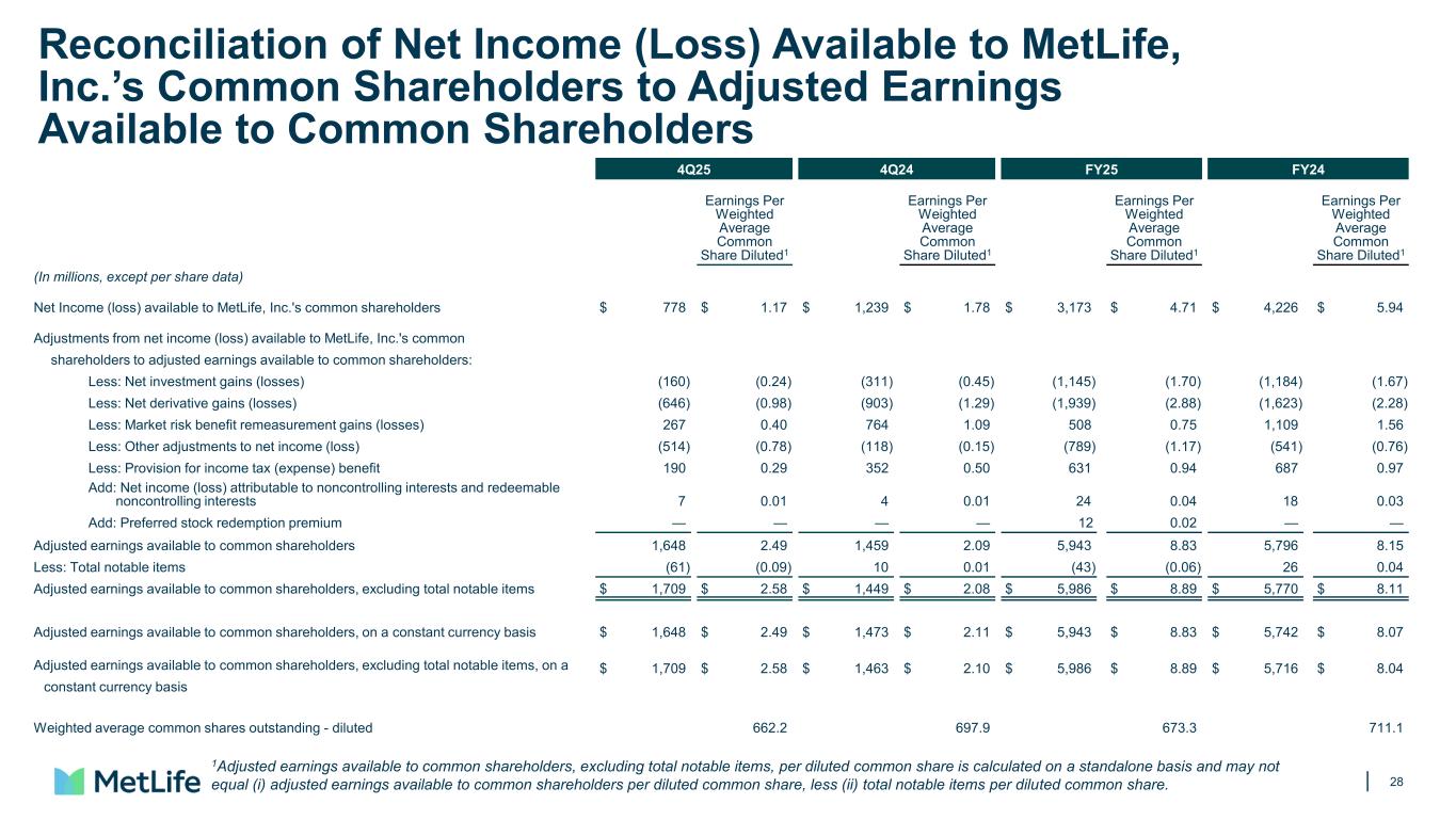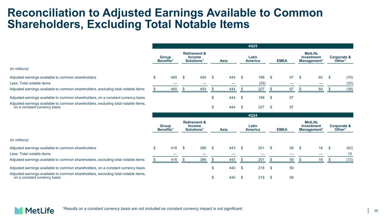 28 Reconciliation of Net Income (Loss) Available to MetLife, Inc.’s Common Shareholders to Adjusted Earnings Available to Common Shareholders 4Q25 4Q24 FY25 FY24 Earnings Per Weighted Average Common Share Diluted1 Earnings Per Weighted Average Common Share Diluted1 Earnings Per Weighted Average Common Share Diluted1 Earnings Per Weighted Average Common Share Diluted1 (In millions, except per share data) Net Income (loss) available to MetLife, Inc.'s common shareholders $ 778 $ 1.17 $ 1,239 $ 1.78 $ 3,173 $ 4.71 $ 4,226 $ 5.94 Adjustments from net income (loss) available to MetLife, Inc.'s common shareholders to adjusted earnings available to common shareholders: Less: Net investment gains (losses) (160) (0.24) (311) (0.45) (1,145) (1.70) (1,184) (1.67) Less: Net derivative gains (losses) (646) (0.98) (903) (1.29) (1,939) (2.88) (1,623) (2.28) Less: Market risk benefit remeasurement gains (losses) 267 0.40 764 1.09 508 0.75 1,109 1.56 Less: Other adjustments to net income (loss) (514) (0.78) (118) (0.15) (789) (1.17) (541) (0.76) Less: Provision for income tax (expense) benefit 190 0.29 352 0.50 631 0.94 687 0.97 Add: Net income (loss) attributable to noncontrolling interests and redeemable noncontrolling interests 7 0.01 4 0.01 24 0.04 18 0.03 Add: Preferred stock redemption premium — — — — 12 0.02 — — Adjusted earnings available to common shareholders 1,648 2.49 1,459 2.09 5,943 8.83 5,796 8.15 Less: Total notable items (61) (0.09) 10 0.01 (43) (0.06) 26 0.04 Adjusted earnings available to common shareholders, excluding total notable items $ 1,709 $ 2.58 $ 1,449 $ 2.08 $ 5,986 $ 8.89 $ 5,770 $ 8.11 Adjusted earnings available to common shareholders, on a constant currency basis $ 1,648 $ 2.49 $ 1,473 $ 2.11 $ 5,943 $ 8.83 $ 5,742 $ 8.07 Adjusted earnings available to common shareholders, excluding total notable items, on a $ 1,709 $ 2.58 $ 1,463 $ 2.10 $ 5,986 $ 8.89 $ 5,716 $ 8.04 constant currency basis Weighted average common shares outstanding - diluted 662.2 697.9 673.3 711.1 1Adjusted earnings available to common shareholders, excluding total notable items, per diluted common share is calculated on a standalone basis and may not equal (i) adjusted earnings available to common shareholders per diluted common share, less (ii) total notable items per diluted common share.