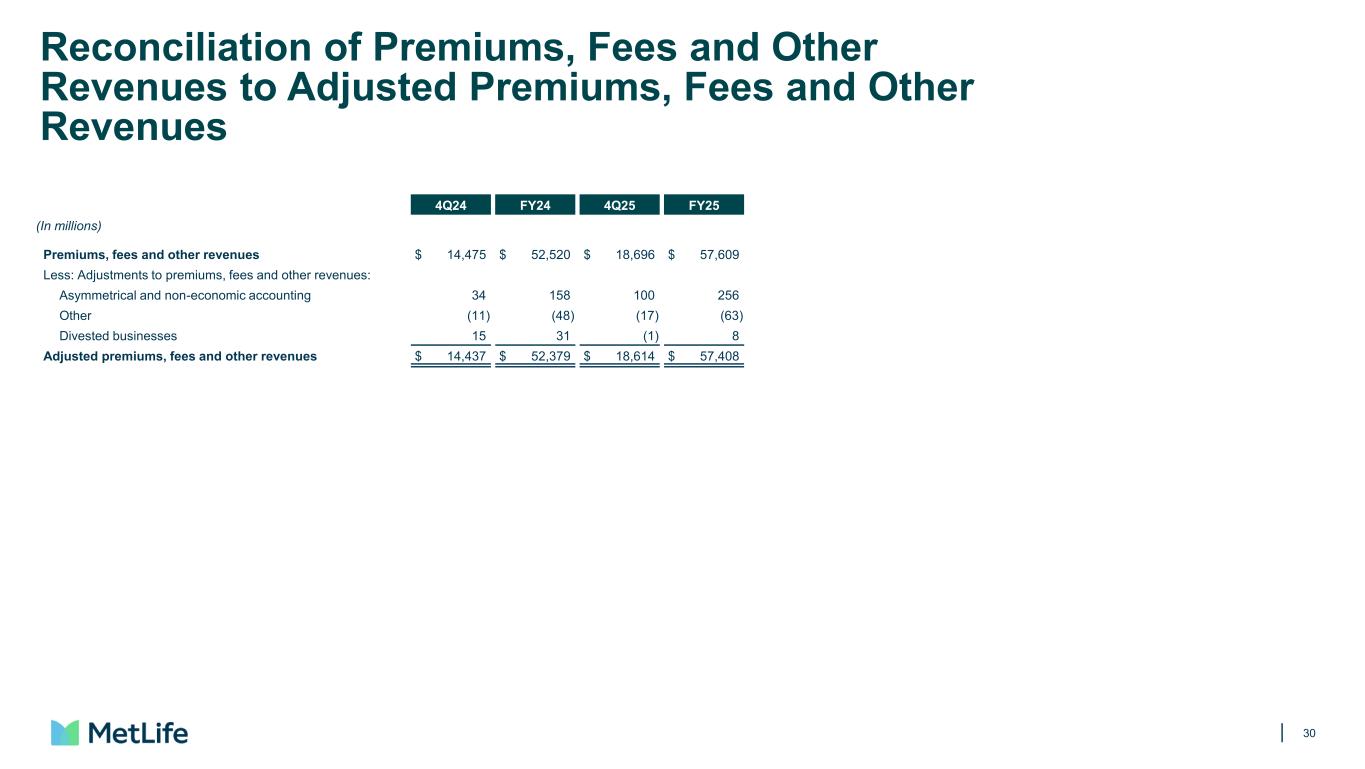 29 Reconciliation to Adjusted Earnings Available to Common Shareholders, Excluding Total Notable Items 4Q25 Group Benefits1 Retirement & Income Solutions1 Asia Latin America EMEA MetLife Investment Management1 Corporate & Other1 (In millions) Adjusted earnings available to common shareholders $ 465 $ 454 $ 444 $ 198 $ 97 $ 60 $ (70) Less: Total notable items — — — (29) — — (32) Adjusted earnings available to common shareholders, excluding total notable items $ 465 $ 454 $ 444 $ 227 $ 97 $ 60 $ (38) Adjusted earnings available to common shareholders, on a constant currency basis $ 444 $ 198 $ 97 Adjusted earnings available to common shareholders, excluding total notable items, on a constant currency basis $ 444 $ 227 $ 97 4Q24 Group Benefits1 Retirement & Income Solutions1 Asia Latin America EMEA MetLife Investment Management1 Corporate & Other1 (In millions) Adjusted earnings available to common shareholders $ 416 $ 386 $ 443 $ 201 $ 59 $ 16 $ (62) Less: Total notable items — — — — — — 10 Adjusted earnings available to common shareholders, excluding total notable items $ 416 $ 386 $ 443 $ 201 $ 59 $ 16 $ (72) Adjusted earnings available to common shareholders, on a constant currency basis $ 440 $ 218 $ 59 Adjusted earnings available to common shareholders, excluding total notable items, on a constant currency basis $ 440 $ 218 $ 59 1Results on a constant currency basis are not included as constant currency impact is not significant.