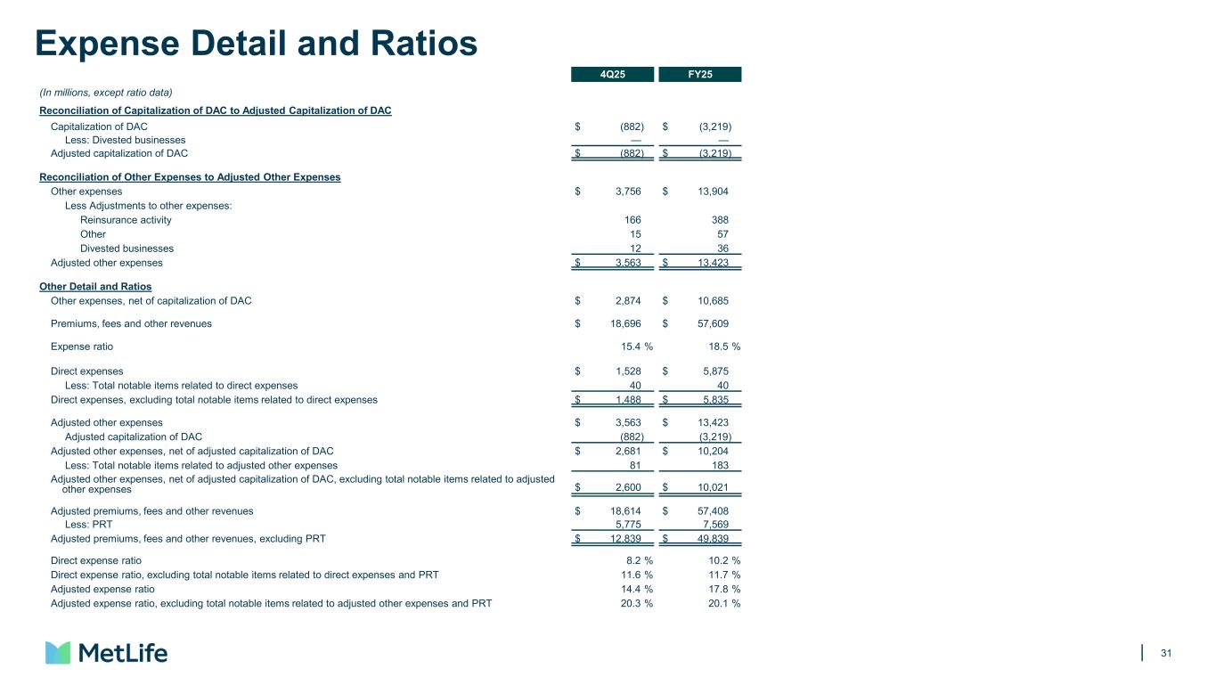 30 Reconciliation of Premiums, Fees and Other Revenues to Adjusted Premiums, Fees and Other Revenues 4Q24 FY24 4Q25 FY25 (In millions) Premiums, fees and other revenues $ 14,475 $ 52,520 $ 18,696 $ 57,609 Less: Adjustments to premiums, fees and other revenues: Asymmetrical and non-economic accounting 34 158 100 256 Other (11) (48) (17) (63) Divested businesses 15 31 (1) 8 Adjusted premiums, fees and other revenues $ 14,437 $ 52,379 $ 18,614 $ 57,408