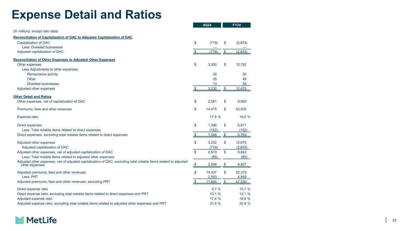 31 Expense Detail and Ratios 4Q25 FY25 (In millions, except ratio data) Reconciliation of Capitalization of DAC to Adjusted Capitalization of DAC Capitalization of DAC $ (882) $ (3,219) Less: Divested businesses — — Adjusted capitalization of DAC $ (882) $ (3,219) Reconciliation of Other Expenses to Adjusted Other Expenses Other expenses $ 3,756 $ 13,904 Less Adjustments to other expenses: Reinsurance activity 166 388 Other 15 57 Divested businesses 12 36 Adjusted other expenses $ 3,563 $ 13,423 Other Detail and Ratios Other expenses, net of capitalization of DAC $ 2,874 $ 10,685 Premiums, fees and other revenues $ 18,696 $ 57,609 Expense ratio 15.4 % 18.5 % Direct expenses $ 1,528 $ 5,875 Less: Total notable items related to direct expenses 40 40 Direct expenses, excluding total notable items related to direct expenses $ 1,488 $ 5,835 Adjusted other expenses $ 3,563 $ 13,423 Adjusted capitalization of DAC (882) (3,219) Adjusted other expenses, net of adjusted capitalization of DAC $ 2,681 $ 10,204 Less: Total notable items related to adjusted other expenses 81 183 Adjusted other expenses, net of adjusted capitalization of DAC, excluding total notable items related to adjusted other expenses $ 2,600 $ 10,021 Adjusted premiums, fees and other revenues $ 18,614 $ 57,408 Less: PRT 5,775 7,569 Adjusted premiums, fees and other revenues, excluding PRT $ 12,839 $ 49,839 Direct expense ratio 8.2 % 10.2 % Direct expense ratio, excluding total notable items related to direct expenses and PRT 11.6 % 11.7 % Adjusted expense ratio 14.4 % 17.8 % Adjusted expense ratio, excluding total notable items related to adjusted other expenses and PRT 20.3 % 20.1 %