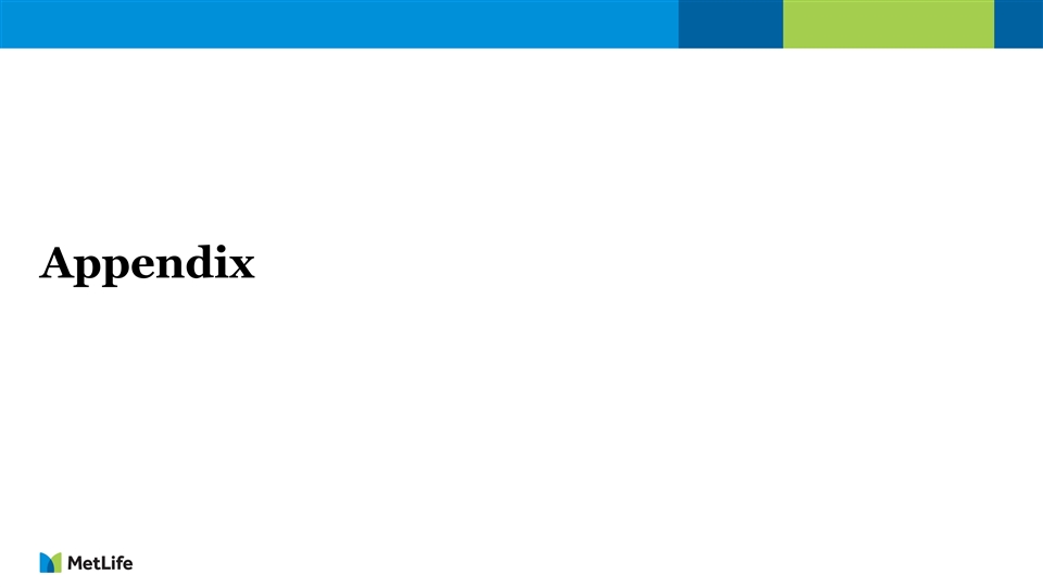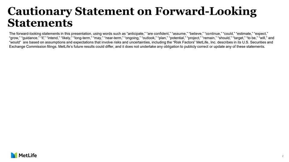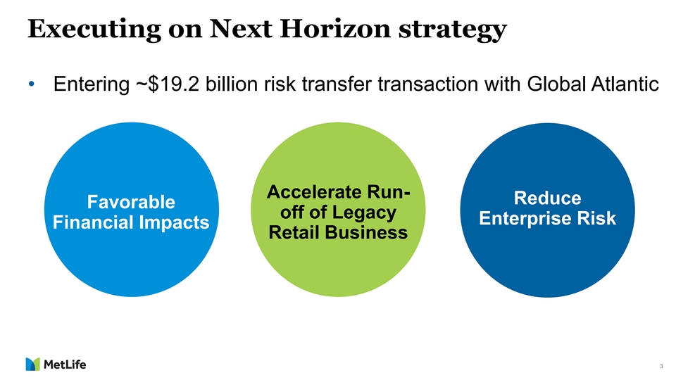 Cautionary Statement on Forward-Looking Statements The forward-looking statements in this presentation, using words such as “anticipate,” “are confident,” “assume,” “believe,” “continue,” “could,” “estimate,” “expect,” “grow,” “guidance,” “if,” “intend,” “likely,” “long-term,” “may,” “near-term,” “ongoing,” “outlook,” “plan,” “potential,” “project,” “remain,” “should,” “target,” “to be,” “will,” and “would” are based on assumptions and expectations that involve risks and uncertainties, including the “Risk Factors” MetLife, Inc. describes in its U.S. Securities and Exchange Commission filings. MetLife’s future results could differ, and it does not undertake any obligation to publicly correct or update any of these statements. 2