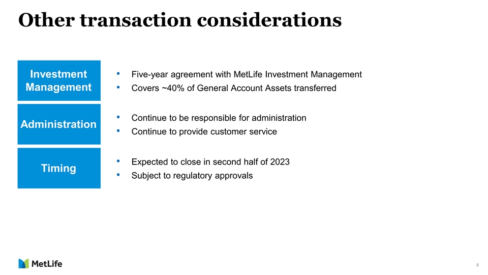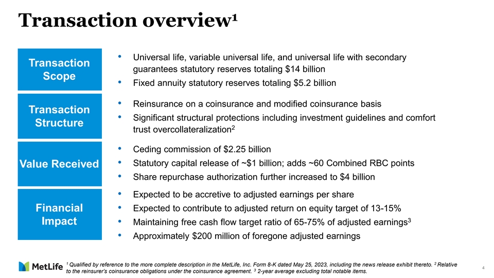 1 Transaction overview • Universal life, variable universal life, and universal life with secondary Transaction guarantees statutory reserves totaling $14 billion Scope • Fixed annuity statutory reserves totaling $5.2 billion • Reinsurance on a coinsurance and modified coinsurance basis Transaction • Significant structural protections including investment guidelines and comfort Structure 2 trust overcollateralization • Ceding commission of $2.25 billion • Statutory capital release of ~$1 billion; adds ~60 Combined RBC points Value Received • Share repurchase authorization further increased to $4 billion • Expected to be accretive to adjusted earnings per share Financial • Expected to contribute to adjusted return on equity target of 13-15% 3 Impact • Maintaining free cash flow target ratio of 65-75% of adjusted earnings • Approximately $200 million of foregone adjusted earnings 1 2 Qualified by reference to the more complete description in the MetLife, Inc. Form 8-K dated May 25, 2023, including the news release exhibit thereto. Relative 4 3 to the reinsurer’s coinsurance obligations under the coinsurance agreement. 2-year average excluding total notable items.