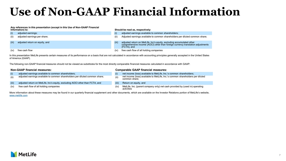 Use of Non-GAAP Financial Information Any references in this presentation (except in this Use of Non-GAAP Financial Information) to: Should be read as, respectively: (i) adjusted earnings; (i) adjusted earnings available to common shareholders; (ii) adjusted earnings per share; (ii) Adjusted earnings available to common shareholders per diluted common share; (iii) adjusted return on equity, and (iii) adjusted return on MetLife, Inc’s equity, excluding accumulated other comprehensive income (AOCI) other than foreign currency translation adjustments (FCTA), and (iv) free cash flow (iv) free cash flow of all holding companies In this presentation MetLife presents certain measures of its performance on a basis that are not calculated in accordance with accounting principles generally accepted in the United States of America (GAAP). The following non-GAAP financial measures should not be viewed as substitutes for the most directly comparable financial measures calculated in accordance with GAAP: Non-GAAP financial measures: Comparable GAAP financial measures: (i) adjusted earnings available to common shareholders; (i) net income (loss) available to MetLife, Inc.’s common shareholders; adjusted earnings available to common shareholders per diluted common share; net income (loss) available to MetLife, Inc.’s common shareholders per diluted (ii) (ii) common share; (iii) adjusted return on MetLife, Inc’s equity, excluding AOCI other than FCTA, and (iii) Return on equity, and (iv) free cash flow of all holding companies (iv) MetLife, Inc. (parent company only) net cash provided by (used in) operating activities More information about these measures may be found in our quarterly financial supplement and other documents, which are available on the Investor Relations portion of MetLife’s website, www.metlife.com 7