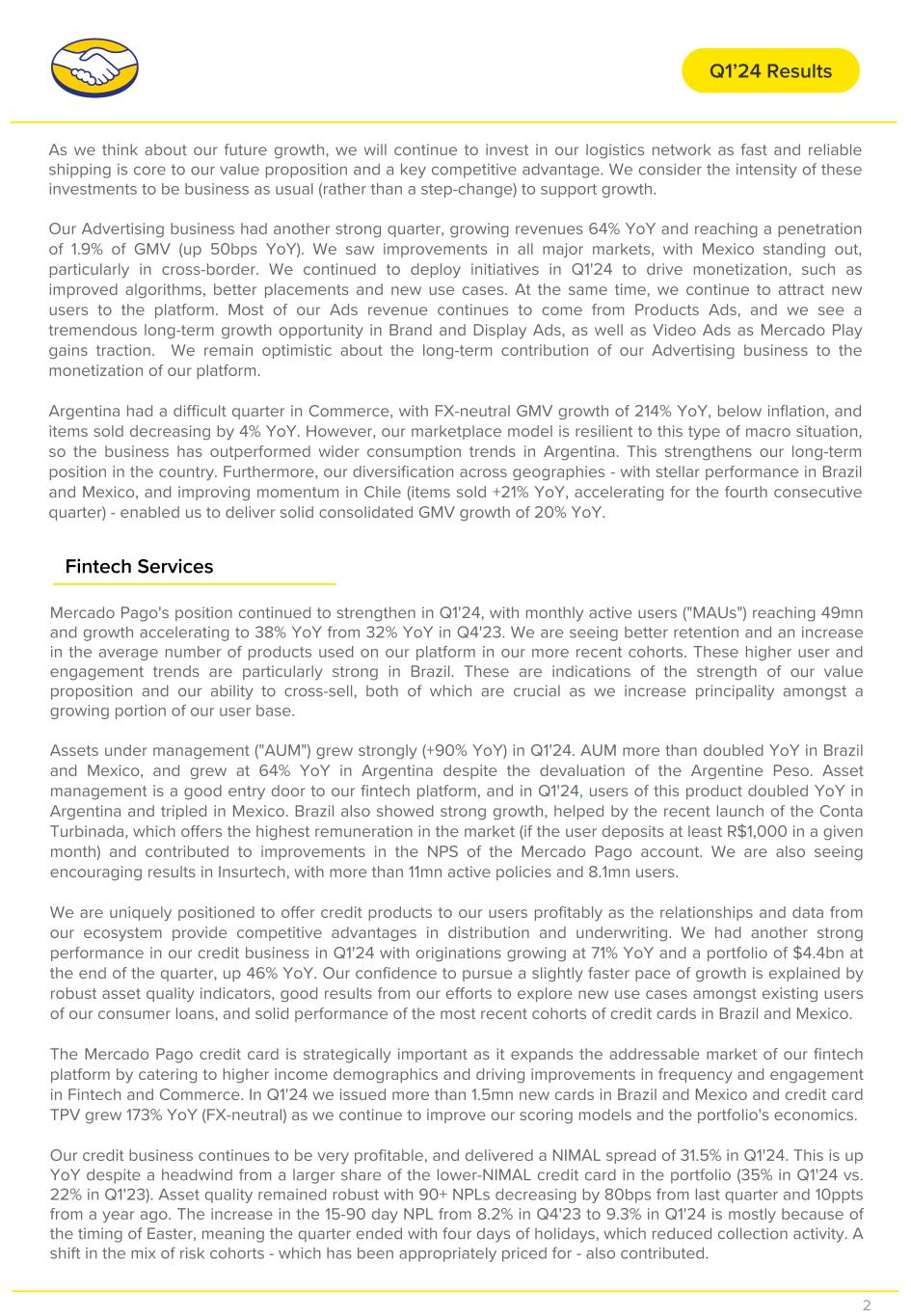 Fintech Services Mercado Pago's position continued to strengthen in Q1'24, with monthly active users ("MAUs") reaching 49mn and growth accelerating to 38% YoY from 32% YoY in Q4'23. We are seeing better retention and an increase in the average number of products used on our platform in our more recent cohorts. These higher user and engagement trends are particularly strong in Brazil. These are indications of the strength of our value proposition and our ability to cross-sell, both of which are crucial as we increase principality amongst a growing portion of our user base. Assets under management ("AUM") grew strongly (+90% YoY) in Q1'24. AUM more than doubled YoY in Brazil and Mexico, and grew at 64% YoY in Argentina despite the devaluation of the Argentine Peso. Asset management is a good entry door to our fintech platform, and in Q1'24, users of this product doubled YoY in Argentina and tripled in Mexico. Brazil also showed strong growth, helped by the recent launch of the Conta Turbinada, which offers the highest remuneration in the market (if the user deposits at least R$1,000 in a given month) and contributed to improvements in the NPS of the Mercado Pago account. We are also seeing encouraging results in Insurtech, with more than 11mn active policies and 8.1mn users. We are uniquely positioned to offer credit products to our users profitably as the relationships and data from our ecosystem provide competitive advantages in distribution and underwriting. We had another strong performance in our credit business in Q1'24 with originations growing at 71% YoY and a portfolio of $4.4bn at the end of the quarter, up 46% YoY. Our confidence to pursue a slightly faster pace of growth is explained by robust asset quality indicators, good results from our efforts to explore new use cases amongst existing users of our consumer loans, and solid performance of the most recent cohorts of credit cards in Brazil and Mexico. The Mercado Pago credit card is strategically important as it expands the addressable market of our fintech platform by catering to higher income demographics and driving improvements in frequency and engagement in Fintech and Commerce. In Q1'24 we issued more than 1.5mn new cards in Brazil and Mexico and credit card TPV grew 173% YoY (FX-neutral) as we continue to improve our scoring models and the portfolio's economics. Our credit business continues to be very profitable, and delivered a NIMAL spread of 31.5% in Q1'24. This is up YoY despite a headwind from a larger share of the lower-NIMAL credit card in the portfolio (35% in Q1'24 vs. 22% in Q1'23). Asset quality remained robust with 90+ NPLs decreasing by 80bps from last quarter and 10ppts from a year ago. The increase in the 15-90 day NPL from 8.2% in Q4'23 to 9.3% in Q1'24 is mostly because of the timing of Easter, meaning the quarter ended with four days of holidays, which reduced collection activity. A shift in the mix of risk cohorts - which has been appropriately priced for - also contributed. 2 As we think about our future growth, we will continue to invest in our logistics network as fast and reliable shipping is core to our value proposition and a key competitive advantage. We consider the intensity of these investments to be business as usual (rather than a step-change) to support growth. Our Advertising business had another strong quarter, growing revenues 64% YoY and reaching a penetration of 1.9% of GMV (up 50bps YoY). We saw improvements in all major markets, with Mexico standing out, particularly in cross-border. We continued to deploy initiatives in Q1'24 to drive monetization, such as improved algorithms, better placements and new use cases. At the same time, we continue to attract new users to the platform. Most of our Ads revenue continues to come from Products Ads, and we see a tremendous long-term growth opportunity in Brand and Display Ads, as well as Video Ads as Mercado Play gains traction. We remain optimistic about the long-term contribution of our Advertising business to the monetization of our platform. Argentina had a difficult quarter in Commerce, with FX-neutral GMV growth of 214% YoY, below inflation, and items sold decreasing by 4% YoY. However, our marketplace model is resilient to this type of macro situation, so the business has outperformed wider consumption trends in Argentina. This strengthens our long-term position in the country. Furthermore, our diversification across geographies - with stellar performance in Brazil and Mexico, and improving momentum in Chile (items sold +21% YoY, accelerating for the fourth consecutive quarter) - enabled us to deliver solid consolidated GMV growth of 20% YoY. Q1’24 Results