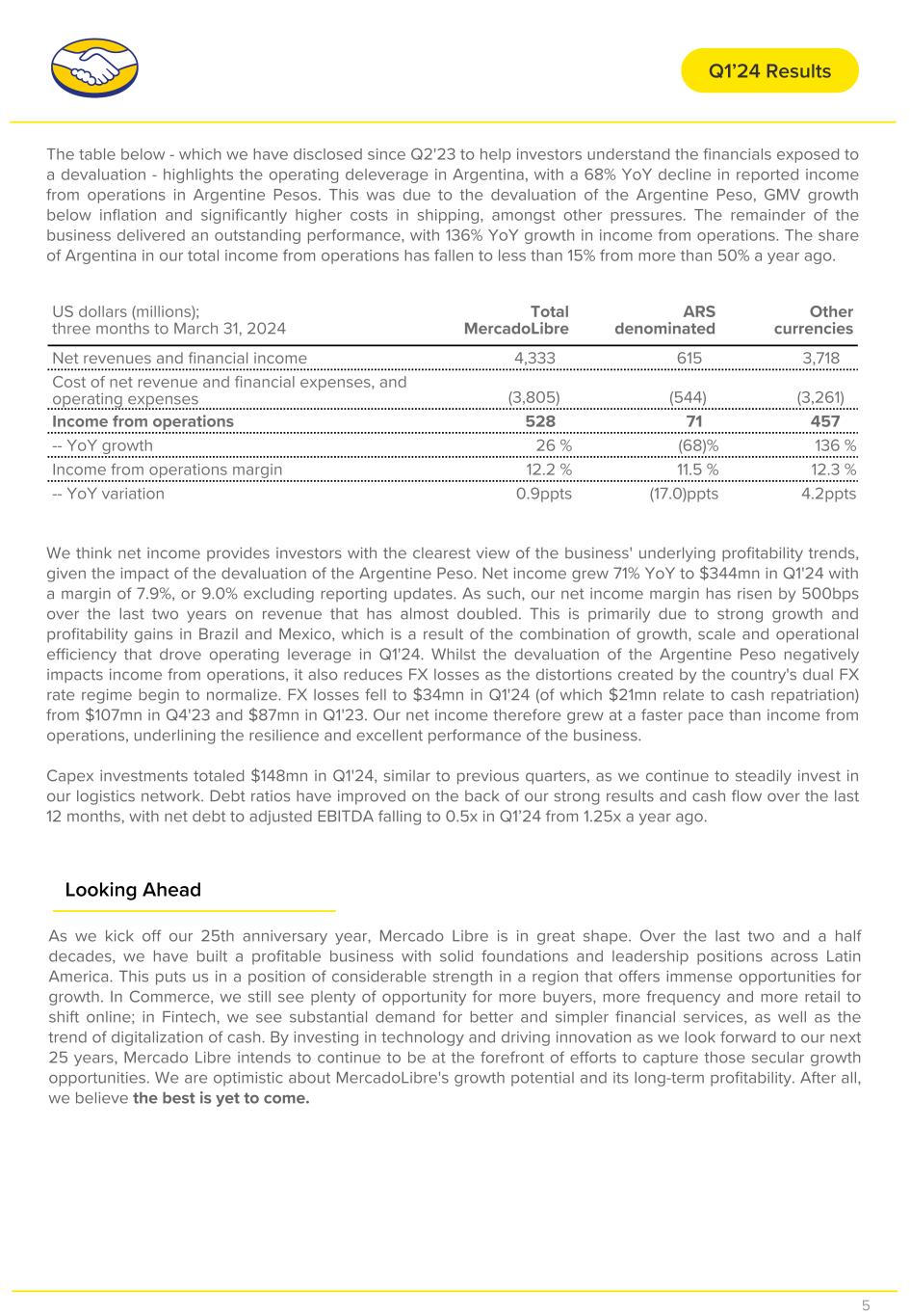 5 Q1’24 Results Looking Ahead As we kick off our 25th anniversary year, Mercado Libre is in great shape. Over the last two and a half decades, we have built a profitable business with solid foundations and leadership positions across Latin America. This puts us in a position of considerable strength in a region that offers immense opportunities for growth. In Commerce, we still see plenty of opportunity for more buyers, more frequency and more retail to shift online; in Fintech, we see substantial demand for better and simpler financial services, as well as the trend of digitalization of cash. By investing in technology and driving innovation as we look forward to our next 25 years, Mercado Libre intends to continue to be at the forefront of efforts to capture those secular growth opportunities. We are optimistic about MercadoLibre's growth potential and its long-term profitability. After all, we believe the best is yet to come. US dollars (millions); three months to March 31, 2024 Total MercadoLibre ARS denominated Other currencies Net revenues and financial income 4,333 615 3,718 Cost of net revenue and financial expenses, and operating expenses (3,805) (544) (3,261) Income from operations 528 71 457 -- YoY growth 26 % (68) % 136 % Income from operations margin 12.2 % 11.5 % 12.3 % -- YoY variation 0.9ppts (17.0)ppts 4.2ppts The table below - which we have disclosed since Q2'23 to help investors understand the financials exposed to a devaluation - highlights the operating deleverage in Argentina, with a 68% YoY decline in reported income from operations in Argentine Pesos. This was due to the devaluation of the Argentine Peso, GMV growth below inflation and significantly higher costs in shipping, amongst other pressures. The remainder of the business delivered an outstanding performance, with 136% YoY growth in income from operations. The share of Argentina in our total income from operations has fallen to less than 15% from more than 50% a year ago. We think net income provides investors with the clearest view of the business' underlying profitability trends, given the impact of the devaluation of the Argentine Peso. Net income grew 71% YoY to $344mn in Q1'24 with a margin of 7.9%, or 9.0% excluding reporting updates. As such, our net income margin has risen by 500bps over the last two years on revenue that has almost doubled. This is primarily due to strong growth and profitability gains in Brazil and Mexico, which is a result of the combination of growth, scale and operational efficiency that drove operating leverage in Q1'24. Whilst the devaluation of the Argentine Peso negatively impacts income from operations, it also reduces FX losses as the distortions created by the country's dual FX rate regime begin to normalize. FX losses fell to $34mn in Q1'24 (of which $21mn relate to cash repatriation) from $107mn in Q4'23 and $87mn in Q1'23. Our net income therefore grew at a faster pace than income from operations, underlining the resilience and excellent performance of the business. Capex investments totaled $148mn in Q1'24, similar to previous quarters, as we continue to steadily invest in our logistics network. Debt ratios have improved on the back of our strong results and cash flow over the last 12 months, with net debt to adjusted EBITDA falling to 0.5x in Q1’24 from 1.25x a year ago.
