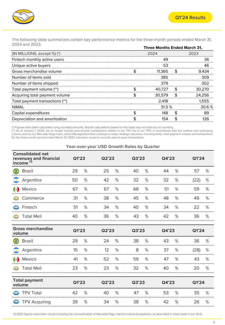 The following table summarizes certain key performance metrics for the three-month periods ended March 31, 2024 and 2023. Year-over-year USD Growth Rates by Quarter Consolidated net revenues and financial income (1) Q1’23 Q2’23 Q3’23 Q4’23 Q1’24 Brazil   29 % 25 % 40 % 44 % 57 % Argentina   50 % 42 % 32 % 32 % (22) % Mexico   67 % 67 % 68 % 51 % 59 % Commerce 31 % 38 % 45 % 48 % 49 % Fintech 51 % 34 % 40 % 34 % 22 % Total Meli 40 % 36 % 43 % 42 % 36 % Gross merchandise volume Q1’23 Q2’23 Q3’23 Q4’23 Q1’24 Brazil   29 % 24 % 38 % 43 % 36 % Argentina   15 % 12 % 8 % 37 % (28) % Mexico   41 % 52 % 59 % 47 % 43 % Total Meli 23 % 23 % 32 % 40 % 20 % Total payment volume Q1’23 Q2’23 Q3’23 Q4’23 Q1’24 TPV Total 42 % 40 % 47 % 53 % 35 % TPV Acquiring 39 % 34 % 38 % 42 % 26 % Three Months Ended March 31, (IN MILLIONS, except %) (*) 2024 2023 Fintech monthly active users     49     36 Unique active buyers 53 46 Gross merchandise volume     $ 11,365     $ 9,434 Number of items sold     385     309 Number of items shipped 379 302 Total payment volume (**)     $ 40,727     $ 30,270 Acquiring total payment volume     $ 30,579 $ 24,256 Total payment transactions (**) 2,418 1,555 NIMAL 31.5 % 30.6 % Capital expenditures     $ 148     $ 89 Depreciation and amortization     $ 154     $ 126 6 (*) Figures have been calculated using rounded amounts. Growth calculations based on this table may not total due to rounding. (**) As of January 1, 2024, we no longer include peer-to-peer transactions neither in our TPV nor in our TPN, in accordance with the metrics and underlying criteria used by our Mercado Pago team, which Management then employs to make strategic decisions. Consequently, total payment volume and transactions for the three-month period ended March 31, 2023, has been recast to exclude peer-to-peer transactions Q1’24 Results (1) 2023 figures have been recast including the reclassification of Mercado Pago interest income & expenses, as described in more detail in our 10-Q.