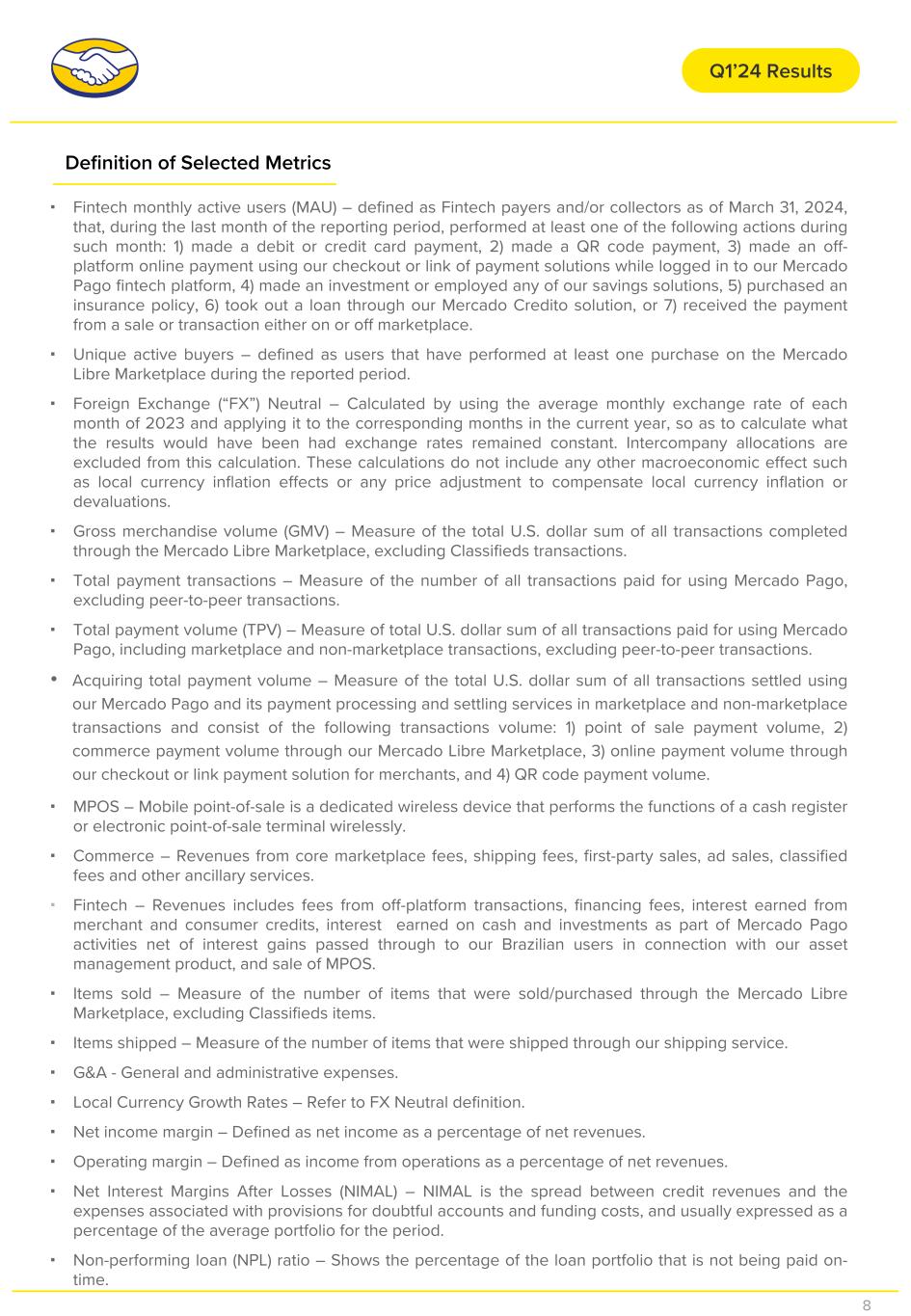 8 ▪ Fintech monthly active users (MAU) – defined as Fintech payers and/or collectors as of March 31, 2024, that, during the last month of the reporting period, performed at least one of the following actions during such month: 1) made a debit or credit card payment, 2) made a QR code payment, 3) made an off- platform online payment using our checkout or link of payment solutions while logged in to our Mercado Pago fintech platform, 4) made an investment or employed any of our savings solutions, 5) purchased an insurance policy, 6) took out a loan through our Mercado Credito solution, or 7) received the payment from a sale or transaction either on or off marketplace. ▪ Unique active buyers – defined as users that have performed at least one purchase on the Mercado Libre Marketplace during the reported period. ▪ Foreign Exchange (“FX”) Neutral – Calculated by using the average monthly exchange rate of each month of 2023 and applying it to the corresponding months in the current year, so as to calculate what the results would have been had exchange rates remained constant. Intercompany allocations are excluded from this calculation. These calculations do not include any other macroeconomic effect such as local currency inflation effects or any price adjustment to compensate local currency inflation or devaluations. ▪ Gross merchandise volume (GMV) – Measure of the total U.S. dollar sum of all transactions completed through the Mercado Libre Marketplace, excluding Classifieds transactions. ▪ Total payment transactions – Measure of the number of all transactions paid for using Mercado Pago, excluding peer-to-peer transactions. ▪ Total payment volume (TPV) – Measure of total U.S. dollar sum of all transactions paid for using Mercado Pago, including marketplace and non-marketplace transactions, excluding peer-to-peer transactions. • Acquiring total payment volume – Measure of the total U.S. dollar sum of all transactions settled using our Mercado Pago and its payment processing and settling services in marketplace and non-marketplace transactions and consist of the following transactions volume: 1) point of sale payment volume, 2) commerce payment volume through our Mercado Libre Marketplace, 3) online payment volume through our checkout or link payment solution for merchants, and 4) QR code payment volume. ▪ MPOS – Mobile point-of-sale is a dedicated wireless device that performs the functions of a cash register or electronic point-of-sale terminal wirelessly. ▪ Commerce – Revenues from core marketplace fees, shipping fees, first-party sales, ad sales, classified fees and other ancillary services. ▪ Fintech – Revenues includes fees from off-platform transactions, financing fees, interest earned from merchant and consumer credits, interest earned on cash and investments as part of Mercado Pago activities net of interest gains passed through to our Brazilian users in connection with our asset management product, and sale of MPOS. ▪ Items sold – Measure of the number of items that were sold/purchased through the Mercado Libre Marketplace, excluding Classifieds items. ▪ Items shipped – Measure of the number of items that were shipped through our shipping service. ▪ G&A - General and administrative expenses. ▪ Local Currency Growth Rates – Refer to FX Neutral definition. ▪ Net income margin – Defined as net income as a percentage of net revenues. ▪ Operating margin – Defined as income from operations as a percentage of net revenues. ▪ Net Interest Margins After Losses (NIMAL) – NIMAL is the spread between credit revenues and the expenses associated with provisions for doubtful accounts and funding costs, and usually expressed as a percentage of the average portfolio for the period. ▪ Non-performing loan (NPL) ratio – Shows the percentage of the loan portfolio that is not being paid on- time. Q1’24 Results Definition of Selected Metrics