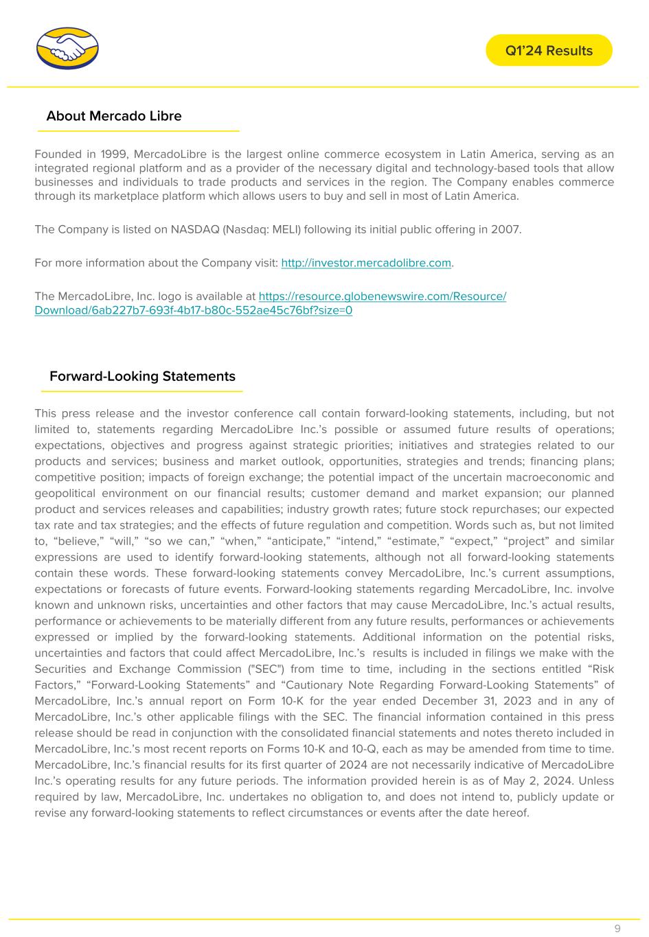 Founded in 1999, MercadoLibre is the largest online commerce ecosystem in Latin America, serving as an integrated regional platform and as a provider of the necessary digital and technology-based tools that allow businesses and individuals to trade products and services in the region. The Company enables commerce through its marketplace platform which allows users to buy and sell in most of Latin America. The Company is listed on NASDAQ (Nasdaq: MELI) following its initial public offering in 2007. For more information about the Company visit: http://investor.mercadolibre.com. The MercadoLibre, Inc. logo is available at https://resource.globenewswire.com/Resource/ Download/6ab227b7-693f-4b17-b80c-552ae45c76bf?size=0 This press release and the investor conference call contain forward-looking statements, including, but not limited to, statements regarding MercadoLibre Inc.’s possible or assumed future results of operations; expectations, objectives and progress against strategic priorities; initiatives and strategies related to our products and services; business and market outlook, opportunities, strategies and trends; financing plans; competitive position; impacts of foreign exchange; the potential impact of the uncertain macroeconomic and geopolitical environment on our financial results; customer demand and market expansion; our planned product and services releases and capabilities; industry growth rates; future stock repurchases; our expected tax rate and tax strategies; and the effects of future regulation and competition. Words such as, but not limited to, “believe,” “will,” “so we can,” “when,” “anticipate,” “intend,” “estimate,” “expect,” “project” and similar expressions are used to identify forward-looking statements, although not all forward-looking statements contain these words. These forward-looking statements convey MercadoLibre, Inc.’s current assumptions, expectations or forecasts of future events. Forward-looking statements regarding MercadoLibre, Inc. involve known and unknown risks, uncertainties and other factors that may cause MercadoLibre, Inc.’s actual results, performance or achievements to be materially different from any future results, performances or achievements expressed or implied by the forward-looking statements. Additional information on the potential risks, uncertainties and factors that could affect MercadoLibre, Inc.’s results is included in filings we make with the Securities and Exchange Commission ("SEC") from time to time, including in the sections entitled “Risk Factors,” “Forward-Looking Statements” and “Cautionary Note Regarding Forward-Looking Statements” of MercadoLibre, Inc.’s annual report on Form 10-K for the year ended December 31, 2023 and in any of MercadoLibre, Inc.’s other applicable filings with the SEC. The financial information contained in this press release should be read in conjunction with the consolidated financial statements and notes thereto included in MercadoLibre, Inc.’s most recent reports on Forms 10-K and 10-Q, each as may be amended from time to time. MercadoLibre, Inc.’s financial results for its first quarter of 2024 are not necessarily indicative of MercadoLibre Inc.’s operating results for any future periods. The information provided herein is as of May 2, 2024. Unless required by law, MercadoLibre, Inc. undertakes no obligation to, and does not intend to, publicly update or revise any forward-looking statements to reflect circumstances or events after the date hereof. 9 Q1’24 Results About Mercado Libre Forward-Looking Statements