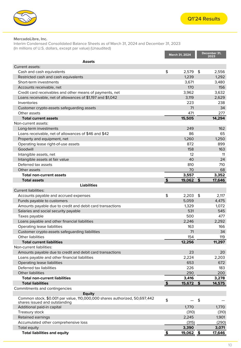 MercadoLibre, Inc. Interim Condensed Consolidated Balance Sheets as of March 31, 2024 and December 31, 2023 (In millions of U.S. dollars, except par value) (Unaudited) 10 March 31, 2024 December 31, 2023 Assets Current assets: Cash and cash equivalents $ 2,579 $ 2,556 Restricted cash and cash equivalents 1,239 1,292 Short-term investments 3,671 3,480 Accounts receivable, net 170 156 Credit card receivables and other means of payments, net 3,962 3,632 Loans receivable, net of allowances of $1,197 and $1,042 3,119 2,629 Inventories 223 238 Customer crypto-assets safeguarding assets 71 34 Other assets 471 277 Total current assets 15,505 14,294 Non-current assets: Long-term investments 249 162 Loans receivable, net of allowances of $46 and $42 86 65 Property and equipment, net 1,260 1,250 Operating lease right-of-use assets 872 899 Goodwill 158 163 Intangible assets, net 12 11 Intangible assets at fair value 40 24 Deferred tax assets 810 710 Other assets 70 68 Total non-current assets 3,557 3,352 Total assets $ 19,062 $ 17,646 Liabilities Current liabilities: Accounts payable and accrued expenses $ 2,203 $ 2,117 Funds payable to customers 5,059 4,475 Amounts payable due to credit and debit card transactions 1,329 1,072 Salaries and social security payable 531 545 Taxes payable 500 477 Loans payable and other financial liabilities 2,246 2,292 Operating lease liabilities 163 166 Customer crypto-assets safeguarding liabilities 71 34 Other liabilities 154 119 Total current liabilities 12,256 11,297 Non-current liabilities: Amounts payable due to credit and debit card transactions 23 20 Loans payable and other financial liabilities 2,224 2,203 Operating lease liabilities 653 672 Deferred tax liabilities 226 183 Other liabilities 290 200 Total non-current liabilities 3,416 3,278 Total liabilities $ 15,672 $ 14,575 Commitments and contingencies Equity Common stock, $0.001 par value, 110,000,000 shares authorized, 50,697,442 shares issued and outstanding $ — $ — Additional paid-in capital 1,770 1,770 Treasury stock (310) (310) Retained earnings 2,245 1,901 Accumulated other comprehensive loss (315) (290) Total equity 3,390 3,071 Total liabilities and equity $ 19,062 $ 17,646 Q1’24 Results