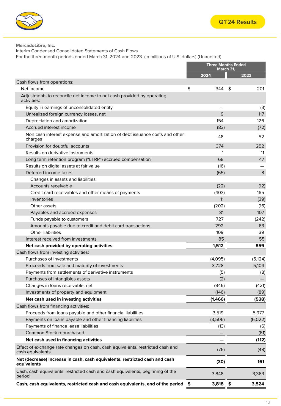MercadoLibre, Inc. Interim Condensed Consolidated Statements of Cash Flows For the three-month periods ended March 31, 2024 and 2023 (In millions of U.S. dollars) (Unaudited) 12 Three Months Ended March 31, 2024 2023 Cash flows from operations: Net income $ 344 $ 201 Adjustments to reconcile net income to net cash provided by operating activities: Equity in earnings of unconsolidated entity — (3) Unrealized foreign currency losses, net 9 117 Depreciation and amortization 154 126 Accrued interest income (83) (72) Non cash interest expense and amortization of debt issuance costs and other charges 48 52 Provision for doubtful accounts 374 252 Results on derivative instruments 1 11 Long term retention program (“LTRP”) accrued compensation 68 47 Results on digital assets at fair value (16) — Deferred income taxes (65) 8 Changes in assets and liabilities: Accounts receivable (22) (12) Credit card receivables and other means of payments (403) 165 Inventories 11 (39) Other assets (202) (16) Payables and accrued expenses 81 107 Funds payable to customers 727 (242) Amounts payable due to credit and debit card transactions 292 63 Other liabilities 109 39 Interest received from investments 85 55 Net cash provided by operating activities 1,512 859 Cash flows from investing activities: Purchases of investments (4,095) (5,124) Proceeds from sale and maturity of investments 3,728 5,104 Payments from settlements of derivative instruments (5) (8) Purchases of intangibles assets (2) — Changes in loans receivable, net (946) (421) Investments of property and equipment (146) (89) Net cash used in investing activities (1,466) (538) Cash flows from financing activities: Proceeds from loans payable and other financial liabilities 3,519 5,977 Payments on loans payable and other financing liabilities (3,506) (6,022) Payments of finance lease liabilities (13) (6) Common Stock repurchased — (61) Net cash used in financing activities — (112) Effect of exchange rate changes on cash, cash equivalents, restricted cash and cash equivalents (76) (48) Net (decrease) increase in cash, cash equivalents, restricted cash and cash equivalents (30) 161 Cash, cash equivalents, restricted cash and cash equivalents, beginning of the period 3,848 3,363 Cash, cash equivalents, restricted cash and cash equivalents, end of the period $ 3,818 $ 3,524 Q1’24 Results