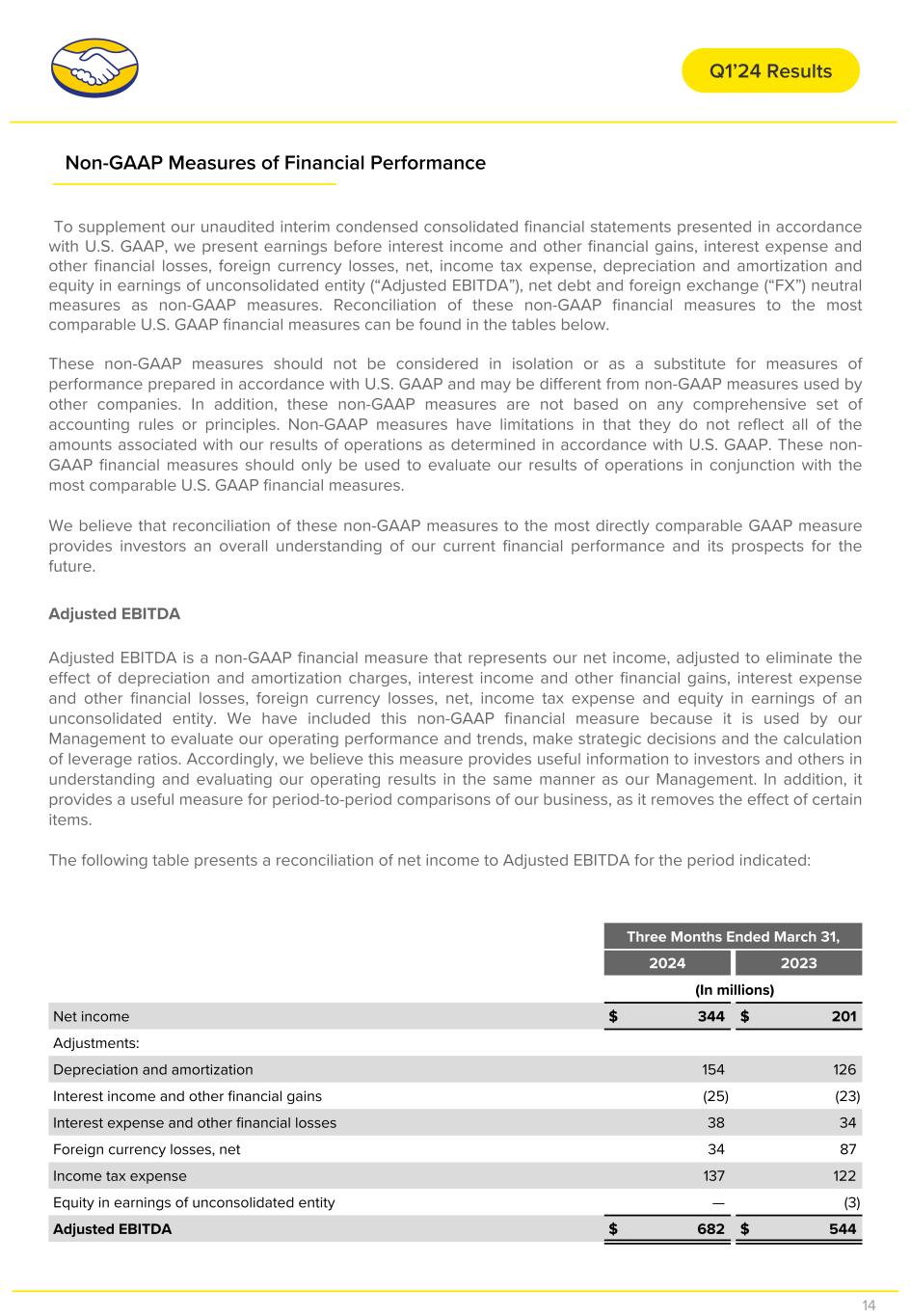 To supplement our unaudited interim condensed consolidated financial statements presented in accordance with U.S. GAAP, we present earnings before interest income and other financial gains, interest expense and other financial losses, foreign currency losses, net, income tax expense, depreciation and amortization and equity in earnings of unconsolidated entity (“Adjusted EBITDA”), net debt and foreign exchange (“FX”) neutral measures as non-GAAP measures. Reconciliation of these non-GAAP financial measures to the most comparable U.S. GAAP financial measures can be found in the tables below. These non-GAAP measures should not be considered in isolation or as a substitute for measures of performance prepared in accordance with U.S. GAAP and may be different from non-GAAP measures used by other companies. In addition, these non-GAAP measures are not based on any comprehensive set of accounting rules or principles. Non-GAAP measures have limitations in that they do not reflect all of the amounts associated with our results of operations as determined in accordance with U.S. GAAP. These non- GAAP financial measures should only be used to evaluate our results of operations in conjunction with the most comparable U.S. GAAP financial measures. We believe that reconciliation of these non-GAAP measures to the most directly comparable GAAP measure provides investors an overall understanding of our current financial performance and its prospects for the future. Adjusted EBITDA Adjusted EBITDA is a non-GAAP financial measure that represents our net income, adjusted to eliminate the effect of depreciation and amortization charges, interest income and other financial gains, interest expense and other financial losses, foreign currency losses, net, income tax expense and equity in earnings of an unconsolidated entity. We have included this non-GAAP financial measure because it is used by our Management to evaluate our operating performance and trends, make strategic decisions and the calculation of leverage ratios. Accordingly, we believe this measure provides useful information to investors and others in understanding and evaluating our operating results in the same manner as our Management. In addition, it provides a useful measure for period-to-period comparisons of our business, as it removes the effect of certain items. The following table presents a reconciliation of net income to Adjusted EBITDA for the period indicated: 14 Three Months Ended March 31, 2024 2023 (In millions) Net income $ 344 $ 201 Adjustments: Depreciation and amortization 154 126 Interest income and other financial gains (25) (23) Interest expense and other financial losses 38 34 Foreign currency losses, net 34 87 Income tax expense 137 122 Equity in earnings of unconsolidated entity — (3) Adjusted EBITDA $ 682 $ 544 Q1’24 Results Non-GAAP Measures of Financial Performance