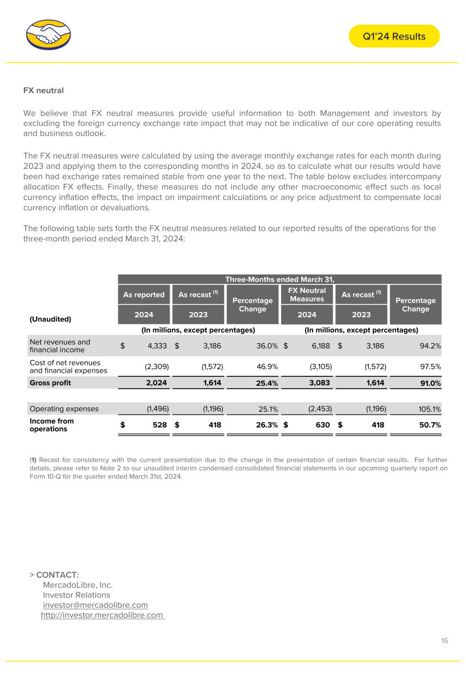> CONTACT: MercadoLibre, Inc. Investor Relations investor@mercadolibre.com http://investor.mercadolibre.com FX neutral We believe that FX neutral measures provide useful information to both Management and investors by excluding the foreign currency exchange rate impact that may not be indicative of our core operating results and business outlook. The FX neutral measures were calculated by using the average monthly exchange rates for each month during 2023 and applying them to the corresponding months in 2024, so as to calculate what our results would have been had exchange rates remained stable from one year to the next. The table below excludes intercompany allocation FX effects. Finally, these measures do not include any other macroeconomic effect such as local currency inflation effects, the impact on impairment calculations or any price adjustment to compensate local currency inflation or devaluations. The following table sets forth the FX neutral measures related to our reported results of the operations for the three-month period ended March 31, 2024: 16 Three-Months ended ͏March 31, As reported As recast (1) Percentage Change FX Neutral Measures As recast (1) Percentage Change (Unaudited) 2024 2023 2024 2023 (In millions, except percentages) (In millions, except percentages) Net revenues and financial income $ 4,333 $ 3,186 36.0 % $ 6,188 $ 3,186 94.2 % Cost of net revenues and financial expenses (2,309) (1,572) 46.9 % (3,105) (1,572) 97.5 % Gross profit 2,024 1,614 25.4 % 3,083 1,614 91.0 % Operating expenses (1,496) (1,196) 25.1 % (2,453) (1,196) 105.1 % Income from operations $ 528 $ 418 26.3 % $ 630 $ 418 50.7 % Q1’24 Results (1) Recast for consistency with the current presentation due to the change in the presentation of certain financial results. For further details, please refer to Note 2 to our unaudited interim condensed consolidated financial statements in our upcoming quarterly report on Form 10-Q for the quarter ended March 31st, 2024.