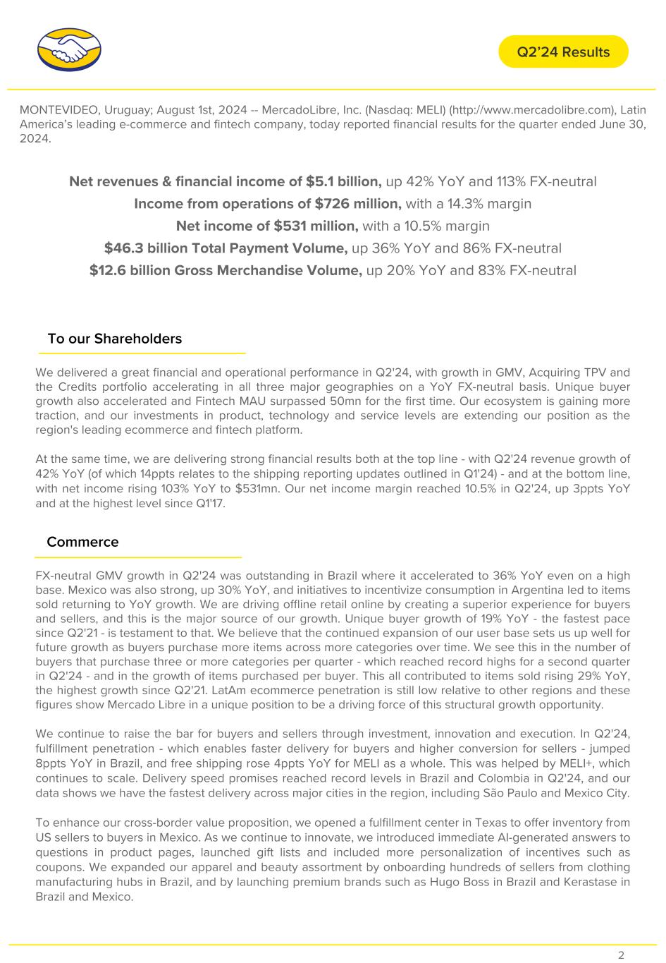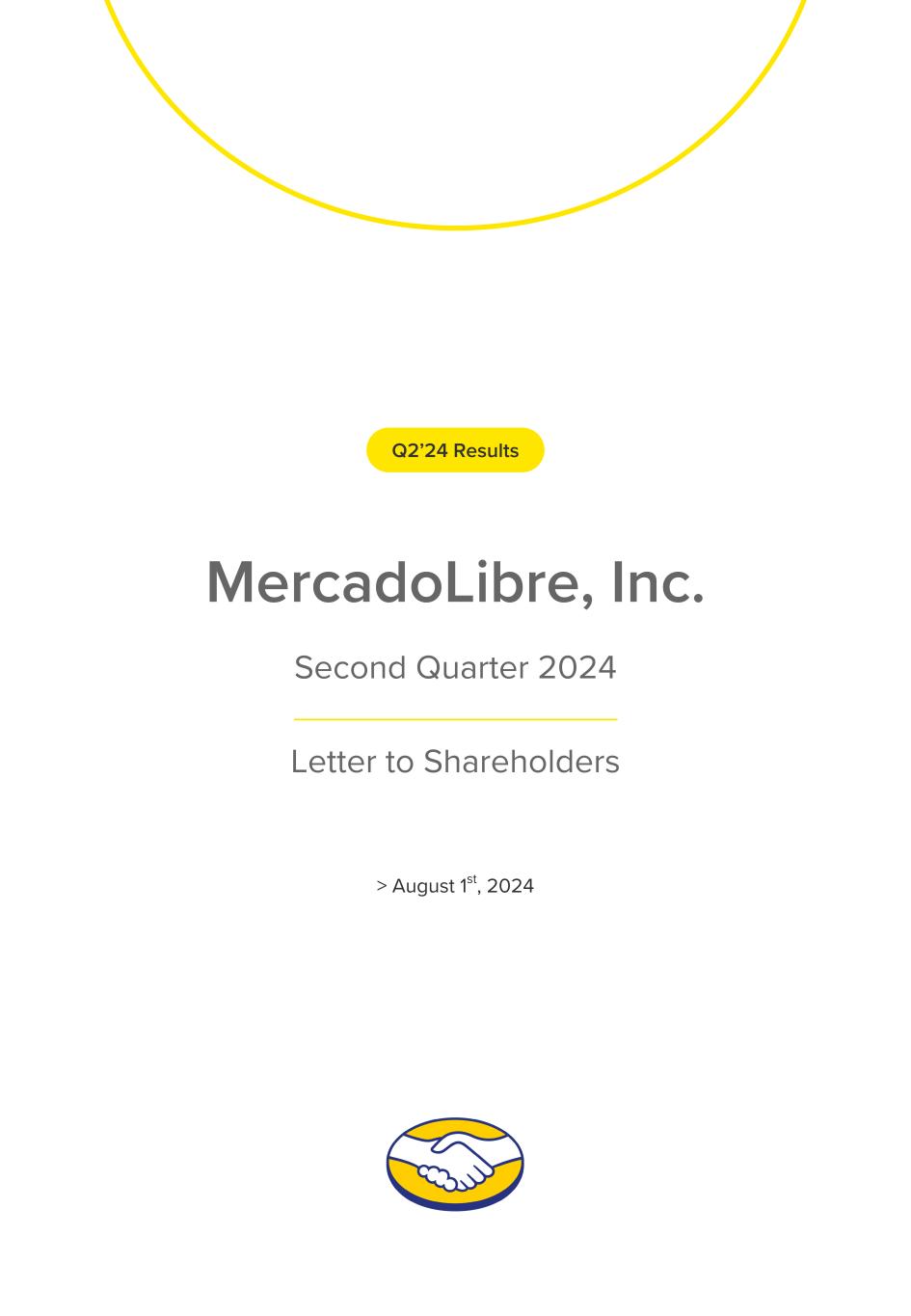 To our Shareholders Q2’24 Results We delivered a great financial and operational performance in Q2'24, with growth in GMV, Acquiring TPV and the Credits portfolio accelerating in all three major geographies on a YoY FX-neutral basis. Unique buyer growth also accelerated and Fintech MAU surpassed 50mn for the first time. Our ecosystem is gaining more traction, and our investments in product, technology and service levels are extending our position as the region's leading ecommerce and fintech platform. At the same time, we are delivering strong financial results both at the top line - with Q2'24 revenue growth of 42% YoY (of which 14ppts relates to the shipping reporting updates outlined in Q1'24) - and at the bottom line, with net income rising 103% YoY to $531mn. Our net income margin reached 10.5% in Q2'24, up 3ppts YoY and at the highest level since Q1'17. Net revenues & financial income of $5.1 billion, up 42% YoY and 113% FX-neutral Income from operations of $726 million, with a 14.3% margin Net income of $531 million, with a 10.5% margin $46.3 billion Total Payment Volume, up 36% YoY and 86% FX-neutral $12.6 billion Gross Merchandise Volume, up 20% YoY and 83% FX-neutral ͏MONTEVIDEO, Uruguay; August 1st, 2024 -- MercadoLibre, Inc. (Nasdaq: MELI) (http://www.mercadolibre.com), Latin America’s leading e-commerce and fintech company, today reported financial results for the quarter ended June 30, 2024. Commerce FX-neutral GMV growth in Q2'24 was outstanding in Brazil where it accelerated to 36% YoY even on a high base. Mexico was also strong, up 30% YoY, and initiatives to incentivize consumption in Argentina led to items sold returning to YoY growth. We are driving offline retail online by creating a superior experience for buyers and sellers, and this is the major source of our growth. Unique buyer growth of 19% YoY - the fastest pace since Q2'21 - is testament to that. We believe that the continued expansion of our user base sets us up well for future growth as buyers purchase more items across more categories over time. We see this in the number of buyers that purchase three or more categories per quarter - which reached record highs for a second quarter in Q2'24 - and in the growth of items purchased per buyer. This all contributed to items sold rising 29% YoY, the highest growth since Q2'21. LatAm ecommerce penetration is still low relative to other regions and these figures show Mercado Libre in a unique position to be a driving force of this structural growth opportunity. We continue to raise the bar for buyers and sellers through investment, innovation and execution. In Q2'24, fulfillment penetration - which enables faster delivery for buyers and higher conversion for sellers - jumped 8ppts YoY in Brazil, and free shipping rose 4ppts YoY for MELI as a whole. This was helped by MELI+, which continues to scale. Delivery speed promises reached record levels in Brazil and Colombia in Q2'24, and our data shows we have the fastest delivery across major cities in the region, including São Paulo and Mexico City. To enhance our cross-border value proposition, we opened a fulfillment center in Texas to offer inventory from US sellers to buyers in Mexico. As we continue to innovate, we introduced immediate AI-generated answers to questions in product pages, launched gift lists and included more personalization of incentives such as coupons. We expanded our apparel and beauty assortment by onboarding hundreds of sellers from clothing manufacturing hubs in Brazil, and by launching premium brands such as Hugo Boss in Brazil and Kerastase in Brazil and Mexico. 2