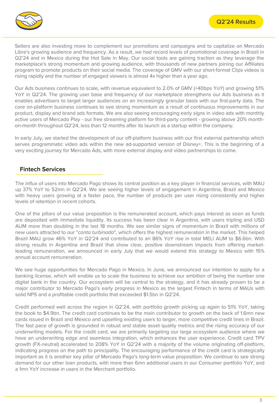 Fintech Services The influx of users into Mercado Pago shows its central position as a key player in financial services, with MAU up 37% YoY to 52mn in Q2'24. We are seeing higher levels of engagement in Argentina, Brazil and Mexico with heavy users growing at a faster pace, the number of products per user rising consistently and higher levels of retention in recent cohorts. One of the pillars of our value proposition is the remunerated account, which pays interest as soon as funds are deposited with immediate liquidity. Its success has been clear in Argentina, with users tripling and USD AUM more than doubling in the last 18 months. We see similar signs of momentum in Brazil with millions of new users attracted to our "conta turbinada", which offers the highest remuneration in the market. This helped Brazil MAU grow 46% YoY in Q2'24 and contributed to an 86% YoY rise in total MELI AUM to $6.6bn. With strong results in Argentina and Brazil that show clear, positive downstream impacts from offering market- leading remuneration, we announced in early July that we would extend this strategy to Mexico with 15% annual account remuneration. We see huge opportunities for Mercado Pago in Mexico. In June, we announced our intention to apply for a banking license, which will enable us to scale the business to achieve our ambition of being the number one digital bank in the country. Our ecosystem will be central to the strategy, and it has already proven to be a major contributor to Mercado Pago's early progress in Mexico as the largest Fintech in terms of MAUs with solid NPS and a profitable credit portfolio that exceeded $1.5bn in Q2'24. Credit performed well across the region in Q2’24, with portfolio growth picking up again to 51% YoY, taking the book to $4.9bn. The credit card continues to be the main contributor to growth on the back of 1.6mn new cards issued in Brazil and Mexico and upselling existing users to larger, more competitive credit lines in Brazil. The fast pace of growth is grounded in robust and stable asset quality metrics and the rising accuracy of our underwriting models. For the credit card, we are primarily targeting our large ecosystem audience where we have an underwriting edge and seamless integration, which enhances the user experience. Credit card TPV growth (FX-neutral) accelerated to 208% YoY in Q2'24 with a majority of the volume originating off-platform, indicating progress on the path to principality. The encouraging performance of the credit card is strategically important as it is another key pillar of Mercado Pago's long-term value proposition. We continue to see strong demand for our other loan products, with more than 6mn additional users in our Consumer portfolio YoY, and a 1mn YoY increase in users in the Merchant portfolio. Sellers are also investing more to complement our promotions and campaigns and to capitalize on Mercado Libre's growing audience and frequency. As a result, we had record levels of promotional coverage in Brazil in Q2'24 and in Mexico during the Hot Sale in May. Our social tools are gaining traction as they leverage the marketplace's strong momentum and growing audience, with thousands of new partners joining our Affiliates program to promote products on their social media. The coverage of GMV with our short-format Clips videos is rising rapidly and the number of engaged viewers is almost 4x higher than a year ago. Our Ads business continues to scale, with revenue equivalent to 2.0% of GMV (+40bps YoY) and growing 51% YoY in Q2'24. The growing user base and frequency of our marketplace strengthens our Ads business as it enables advertisers to target larger audiences on an increasingly granular basis with our first-party data. The core on-platform business continues to see strong momentum as a result of continuous improvements in our product, display and brand ads formats. We are also seeing encouraging early signs in video ads with monthly active users of Mercado Play - our free streaming platform for third-party content - growing above 20% month- on-month throughout Q2'24, less than 12 months after its launch as a startup within the company. In early July, we started the development of our off-platform business with our first external partnership which serves programmatic video ads within the new ad-supported version of Disney+. This is the beginning of a very exciting journey for Mercado Ads, with more external display and video partnerships to come. Q2’24 Results 3