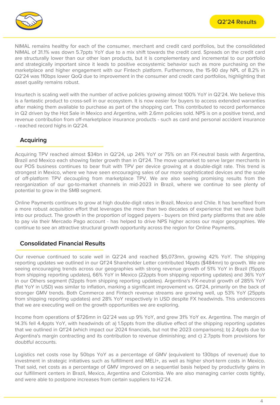 Acquiring Acquiring TPV reached almost $34bn in Q2'24, up 24% YoY or 75% on an FX-neutral basis with Argentina, Brazil and Mexico each showing faster growth than in Q1'24. The move upmarket to serve larger merchants in our POS business continues to bear fruit with TPV per device growing at a double-digit rate. This trend is strongest in Mexico, where we have seen encouraging sales of our more sophisticated devices and the scale of off-platform TPV decoupling from marketplace TPV. We are also seeing promising results from the reorganization of our go-to-market channels in mid-2023 in Brazil, where we continue to see plenty of potential to grow in the SMB segment. Online Payments continues to grow at high double-digit rates in Brazil, Mexico and Chile. It has benefited from a more robust acquisition effort that leverages the more than two decades of experience that we have built into our product. The growth in the proportion of logged payers - buyers on third party platforms that are able to pay via their Mercado Pago account - has helped to drive NPS higher across our major geographies. We continue to see an attractive structural growth opportunity across the region for Online Payments. Q2’24 Results Consolidated Financial Results Our revenue continued to scale well in Q2'24 and reached $5,073mn, growing 42% YoY. The shipping reporting updates we outlined in our Q1'24 Shareholder Letter contributed 14ppts ($484mn) to growth. We are seeing encouraging trends across our geographies with strong revenue growth of 51% YoY in Brazil (15ppts from shipping reporting updates), 66% YoY in Mexico (22ppts from shipping reporting updates) and 36% YoY in our Others segment (12ppts from shipping reporting updates). Argentina's FX-neutral growth of 285% YoY (flat YoY in USD) was similar to inflation, marking a significant improvement vs. Q1'24, primarily on the back of stronger GMV trends. Both Commerce and Fintech revenue streams are growing well, up 53% YoY (25ppts from shipping reporting updates) and 28% YoY respectively in USD despite FX headwinds. This underscores that we are executing well on the growth opportunities we are exploring. Income from operations of $726mn in Q2’24 was up 9% YoY, and grew 31% YoY ex. Argentina. The margin of 14.3% fell 4.4ppts YoY, with headwinds of: a) 1.5ppts from the dilutive effect of the shipping reporting updates that we outlined in Q1'24 (which impact our 2024 financials, but not the 2023 comparisons); b) 2.4ppts due to Argentina's margin contracting and its contribution to revenue diminishing; and c) 2.7ppts from provisions for doubtful accounts. Logistics net costs rose by 50bps YoY as a percentage of GMV (equivalent to 130bps of revenue) due to investment in strategic initiatives such as fulfillment and MELI+, as well as higher short-term costs in Mexico. That said, net costs as a percentage of GMV improved on a sequential basis helped by productivity gains in our fulfillment centers in Brazil, Mexico, Argentina and Colombia. We are also managing carrier costs tightly, and were able to postpone increases from certain suppliers to H2'24. NIMAL remains healthy for each of the consumer, merchant and credit card portfolios, but the consolidated NIMAL of 31.1% was down 5.7ppts YoY due to a mix shift towards the credit card. Spreads on the credit card are structurally lower than our other loan products, but it is complementary and incremental to our portfolio and strategically important since it leads to positive ecosystemic behavior such as more purchasing on the marketplace and higher engagement with our Fintech platform. Furthermore, the 15-90 day NPL of 8.2% in Q2'24 was 110bps lower QoQ due to improvement in the consumer and credit card portfolios, highlighting that asset quality remains robust. Insurtech is scaling well with the number of active policies growing almost 100% YoY in Q2'24. We believe this is a fantastic product to cross-sell in our ecosystem. It is now easier for buyers to access extended warranties after making them available to purchase as part of the shopping cart. This contributed to record performance in Q2 driven by the Hot Sale in Mexico and Argentina, with 2.6mn policies sold. NPS is on a positive trend, and revenue contribution from off-marketplace insurance products - such as card and personal accident insurance - reached record highs in Q2'24. 4