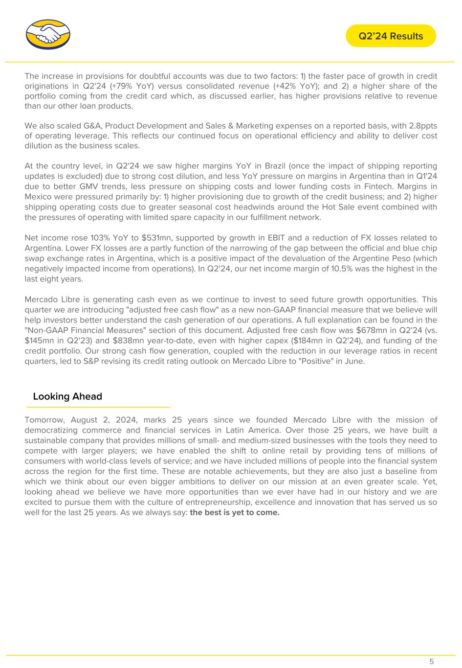Q2’24 Results The increase in provisions for doubtful accounts was due to two factors: 1) the faster pace of growth in credit originations in Q2'24 (+79% YoY) versus consolidated revenue (+42% YoY); and 2) a higher share of the portfolio coming from the credit card which, as discussed earlier, has higher provisions relative to revenue than our other loan products. We also scaled G&A, Product Development and Sales & Marketing expenses on a reported basis, with 2.8ppts of operating leverage. This reflects our continued focus on operational efficiency and ability to deliver cost dilution as the business scales. At the country level, in Q2'24 we saw higher margins YoY in Brazil (once the impact of shipping reporting updates is excluded) due to strong cost dilution, and less YoY pressure on margins in Argentina than in Q1'24 due to better GMV trends, less pressure on shipping costs and lower funding costs in Fintech. Margins in Mexico were pressured primarily by: 1) higher provisioning due to growth of the credit business; and 2) higher shipping operating costs due to greater seasonal cost headwinds around the Hot Sale event combined with the pressures of operating with limited spare capacity in our fulfillment network. Net income rose 103% YoY to $531mn, supported by growth in EBIT and a reduction of FX losses related to Argentina. Lower FX losses are a partly function of the narrowing of the gap between the official and blue chip swap exchange rates in Argentina, which is a positive impact of the devaluation of the Argentine Peso (which negatively impacted income from operations). In Q2'24, our net income margin of 10.5% was the highest in the last eight years. Mercado Libre is generating cash even as we continue to invest to seed future growth opportunities. This quarter we are introducing "adjusted free cash flow" as a new non-GAAP financial measure that we believe will help investors better understand the cash generation of our operations. A full explanation can be found in the "Non-GAAP Financial Measures" section of this document. Adjusted free cash flow was $678mn in Q2'24 (vs. $145mn in Q2'23) and $838mn year-to-date, even with higher capex ($184mn in Q2'24), and funding of the credit portfolio. Our strong cash flow generation, coupled with the reduction in our leverage ratios in recent quarters, led to S&P revising its credit rating outlook on Mercado Libre to "Positive" in June. Looking Ahead Tomorrow, August 2, 2024, marks 25 years since we founded Mercado Libre with the mission of democratizing commerce and financial services in Latin America. Over those 25 years, we have built a sustainable company that provides millions of small- and medium-sized businesses with the tools they need to compete with larger players; we have enabled the shift to online retail by providing tens of millions of consumers with world-class levels of service; and we have included millions of people into the financial system across the region for the first time. These are notable achievements, but they are also just a baseline from which we think about our even bigger ambitions to deliver on our mission at an even greater scale. Yet, looking ahead we believe we have more opportunities than we ever have had in our history and we are excited to pursue them with the culture of entrepreneurship, excellence and innovation that has served us so well for the last 25 years. As we always say: the best is yet to come. 5
