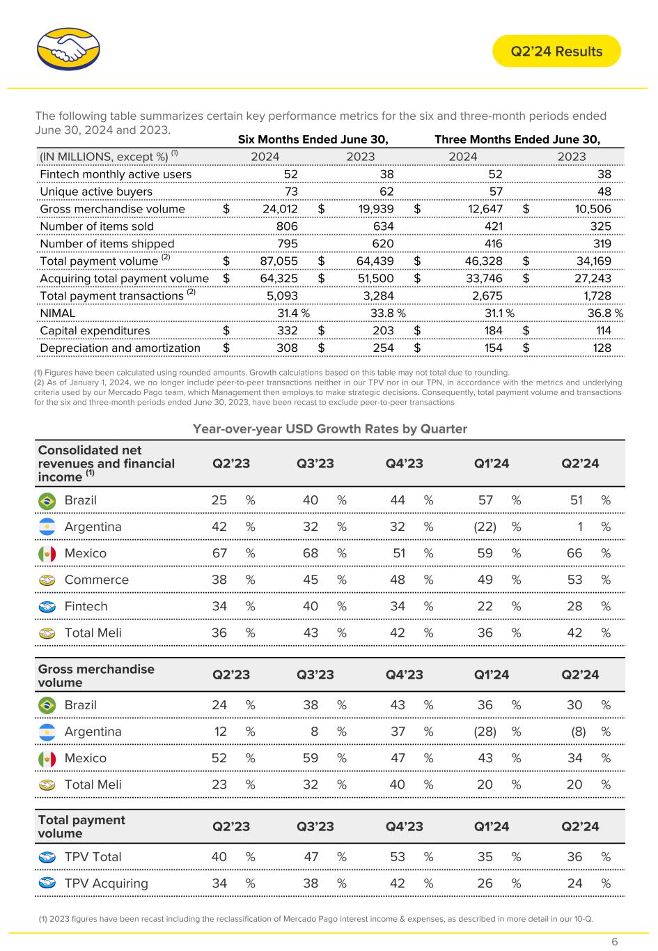 The following table summarizes certain key performance metrics for the six and three-month periods ended June 30, 2024 and 2023. Year-over-year USD Growth Rates by Quarter Consolidated net revenues and financial income (1) Q2’23 Q3’23 Q4’23 Q1’24 Q2’24 Brazil   25 % 40 % 44 % 57 % 51 % Argentina   42 % 32 % 32 % (22) % 1 % Mexico   67 % 68 % 51 % 59 % 66 % Commerce 38 % 45 % 48 % 49 % 53 % Fintech 34 % 40 % 34 % 22 % 28 % Total Meli 36 % 43 % 42 % 36 % 42 % Gross merchandise volume Q2’23 Q3’23 Q4’23 Q1’24 Q2’24 Brazil   24 % 38 % 43 % 36 % 30 % Argentina   12 % 8 % 37 % (28) % (8) % Mexico   52 % 59 % 47 % 43 % 34 % Total Meli 23 % 32 % 40 % 20 % 20 % Total payment volume Q2’23 Q3’23 Q4’23 Q1’24 Q2’24 TPV Total 40 % 47 % 53 % 35 % 36 % TPV Acquiring 34 % 38 % 42 % 26 % 24 % Six Months Ended June 30, Three Months Ended June 30, (IN MILLIONS, except %) (1) 2024 2023 2024 2023 Fintech monthly active users 52     38     52     38 Unique active buyers 73 62 57 48 Gross merchandise volume $ 24,012     $ 19,939     $ 12,647     $ 10,506 Number of items sold 806     634     421     325 Number of items shipped 795 620 416 319 Total payment volume (2) $ 87,055     $ 64,439     $ 46,328     $ 34,169 Acquiring total payment volume $ 64,325     $ 51,500     $ 33,746 $ 27,243 Total payment transactions (2) 5,093 3,284 2,675 1,728 NIMAL 31.4 % 33.8 % 31.1 % 36.8 % Capital expenditures $ 332     $ 203     $ 184     $ 114 Depreciation and amortization $ 308     $ 254     $ 154     $ 128 (1) Figures have been calculated using rounded amounts. Growth calculations based on this table may not total due to rounding. (2) As of January 1, 2024, we no longer include peer-to-peer transactions neither in our TPV nor in our TPN, in accordance with the metrics and underlying criteria used by our Mercado Pago team, which Management then employs to make strategic decisions. Consequently, total payment volume and transactions for the six and three-month periods ended June 30, 2023, have been recast to exclude peer-to-peer transactions Q2’24 Results (1) 2023 figures have been recast including the reclassification of Mercado Pago interest income & expenses, as described in more detail in our 10-Q. 6