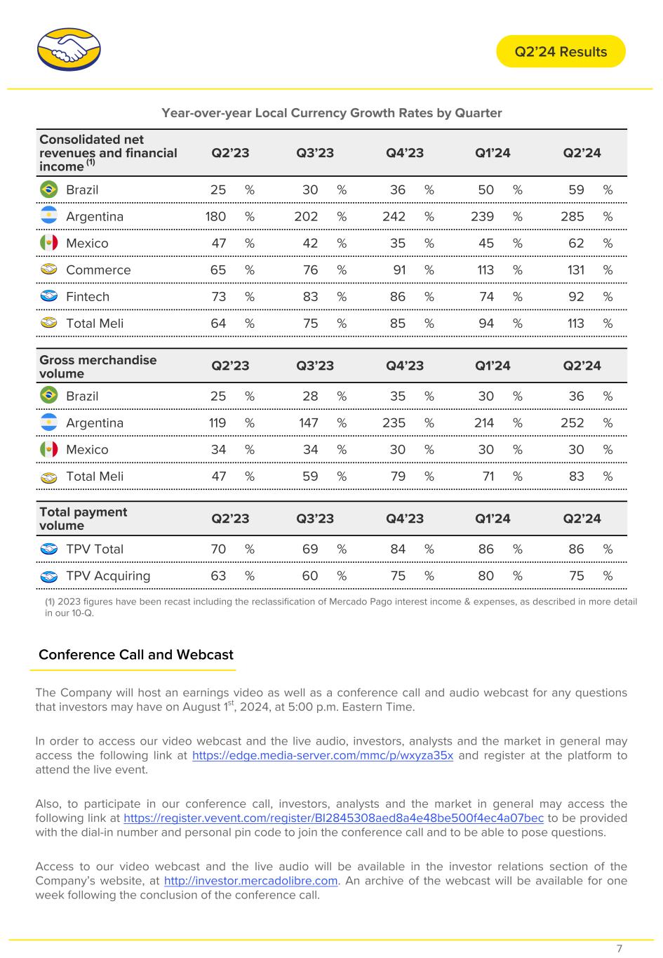 The Company will host an earnings video as well as a conference call and audio webcast for any questions that investors may have on August 1st, 2024, at 5:00 p.m. Eastern Time. In order to access our video webcast and the live audio, investors, analysts and the market in general may access the following link at https://edge.media-server.com/mmc/p/wxyza35x and register at the platform to attend the live event. Also, to participate in our conference call, investors, analysts and the market in general may access the following link at https://register.vevent.com/register/BI2845308aed8a4e48be500f4ec4a07bec to be provided with the dial-in number and personal pin code to join the conference call and to be able to pose questions. Access to our video webcast and the live audio will be available in the investor relations section of the Company’s website, at http://investor.mercadolibre.com. An archive of the webcast will be available for one week following the conclusion of the conference call. Year-over-year Local Currency Growth Rates by Quarter Consolidated net revenues and financial income (1) Q2’23 Q3’23 Q4’23 Q1’24 Q2’24 Brazil 25 % 30 % 36 % 50 % 59 % Argentina 180 % 202 % 242 % 239 % 285 % Mexico 47 % 42 % 35 % 45 % 62 % Commerce 65 % 76 % 91 % 113 % 131 % Fintech 73 % 83 % 86 % 74 % 92 % Total Meli 64 % 75 % 85 % 94 % 113 % Gross merchandise volume Q2’23 Q3’23 Q4’23 Q1’24 Q2’24 Brazil 25 % 28 % 35 % 30 % 36 % Argentina 119 % 147 % 235 % 214 % 252 % Mexico 34 % 34 % 30 % 30 % 30 % Total Meli 47 % 59 % 79 % 71 % 83 % Total payment volume Q2’23 Q3’23 Q4’23 Q1’24 Q2’24 TPV Total 70 % 69 % 84 % 86 % 86 % TPV Acquiring 63 % 60 % 75 % 80 % 75 % Q2’24 Results Conference Call and Webcast (1) 2023 figures have been recast including the reclassification of Mercado Pago interest income & expenses, as described in more detail in our 10-Q. 7