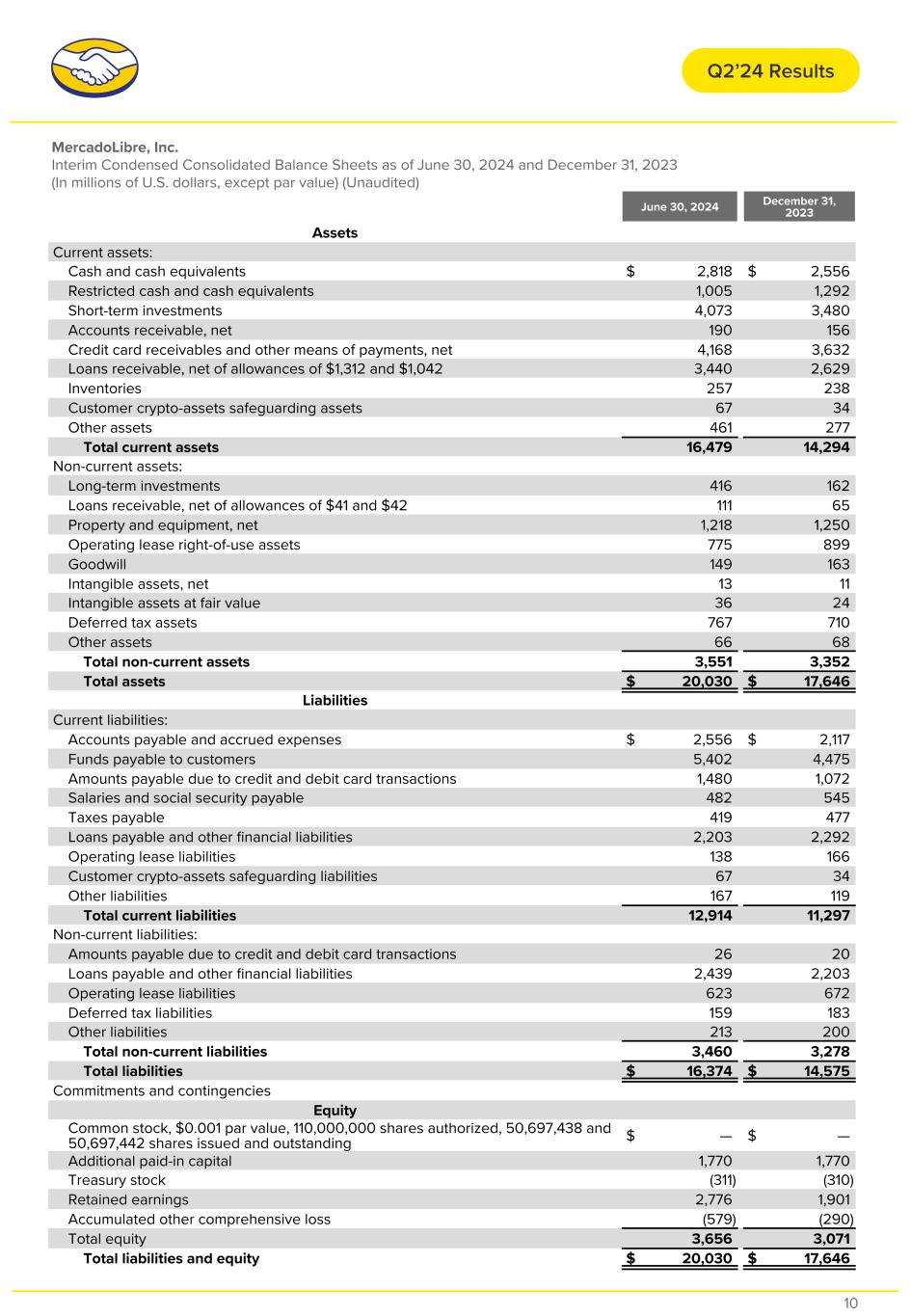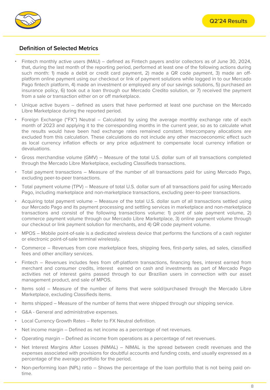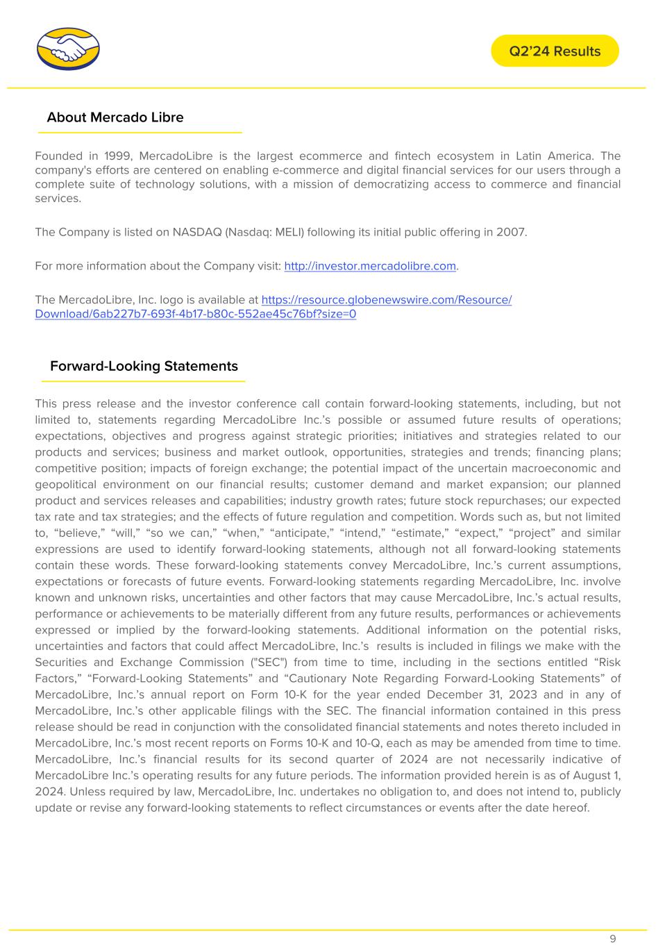 Founded in 1999, MercadoLibre is the largest ecommerce and fintech ecosystem in Latin America. The company's efforts are centered on enabling e-commerce and digital financial services for our users through a complete suite of technology solutions, with a mission of democratizing access to commerce and financial services. The Company is listed on NASDAQ (Nasdaq: MELI) following its initial public offering in 2007. For more information about the Company visit: http://investor.mercadolibre.com. The MercadoLibre, Inc. logo is available at https://resource.globenewswire.com/Resource/ Download/6ab227b7-693f-4b17-b80c-552ae45c76bf?size=0 This press release and the investor conference call contain forward-looking statements, including, but not limited to, statements regarding MercadoLibre Inc.’s possible or assumed future results of operations; expectations, objectives and progress against strategic priorities; initiatives and strategies related to our products and services; business and market outlook, opportunities, strategies and trends; financing plans; competitive position; impacts of foreign exchange; the potential impact of the uncertain macroeconomic and geopolitical environment on our financial results; customer demand and market expansion; our planned product and services releases and capabilities; industry growth rates; future stock repurchases; our expected tax rate and tax strategies; and the effects of future regulation and competition. Words such as, but not limited to, “believe,” “will,” “so we can,” “when,” “anticipate,” “intend,” “estimate,” “expect,” “project” and similar expressions are used to identify forward-looking statements, although not all forward-looking statements contain these words. These forward-looking statements convey MercadoLibre, Inc.’s current assumptions, expectations or forecasts of future events. Forward-looking statements regarding MercadoLibre, Inc. involve known and unknown risks, uncertainties and other factors that may cause MercadoLibre, Inc.’s actual results, performance or achievements to be materially different from any future results, performances or achievements expressed or implied by the forward-looking statements. Additional information on the potential risks, uncertainties and factors that could affect MercadoLibre, Inc.’s results is included in filings we make with the Securities and Exchange Commission ("SEC") from time to time, including in the sections entitled “Risk Factors,” “Forward-Looking Statements” and “Cautionary Note Regarding Forward-Looking Statements” of MercadoLibre, Inc.’s annual report on Form 10-K for the year ended December 31, 2023 and in any of MercadoLibre, Inc.’s other applicable filings with the SEC. The financial information contained in this press release should be read in conjunction with the consolidated financial statements and notes thereto included in MercadoLibre, Inc.’s most recent reports on Forms 10-K and 10-Q, each as may be amended from time to time. MercadoLibre, Inc.’s financial results for its second quarter of 2024 are not necessarily indicative of MercadoLibre Inc.’s operating results for any future periods. The information provided herein is as of August 1, 2024. Unless required by law, MercadoLibre, Inc. undertakes no obligation to, and does not intend to, publicly update or revise any forward-looking statements to reflect circumstances or events after the date hereof. Q2’24 Results About Mercado Libre Forward-Looking Statements 9