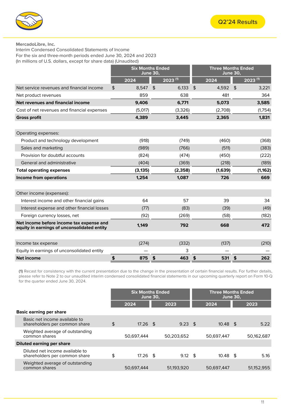MercadoLibre, Inc. Interim Condensed Consolidated Balance Sheets as of June 30, 2024 and December 31, 2023 (In millions of U.S. dollars, except par value) (Unaudited) June 30, 2024 December 31, 2023 Assets Current assets: Cash and cash equivalents $ 2,818 $ 2,556 Restricted cash and cash equivalents 1,005 1,292 Short-term investments 4,073 3,480 Accounts receivable, net 190 156 Credit card receivables and other means of payments, net 4,168 3,632 Loans receivable, net of allowances of $1,312 and $1,042 3,440 2,629 Inventories 257 238 Customer crypto-assets safeguarding assets 67 34 Other assets 461 277 Total current assets 16,479 14,294 Non-current assets: Long-term investments 416 162 Loans receivable, net of allowances of $41 and $42 111 65 Property and equipment, net 1,218 1,250 Operating lease right-of-use assets 775 899 Goodwill 149 163 Intangible assets, net 13 11 Intangible assets at fair value 36 24 Deferred tax assets 767 710 Other assets 66 68 Total non-current assets 3,551 3,352 Total assets $ 20,030 $ 17,646 Liabilities Current liabilities: Accounts payable and accrued expenses $ 2,556 $ 2,117 Funds payable to customers 5,402 4,475 Amounts payable due to credit and debit card transactions 1,480 1,072 Salaries and social security payable 482 545 Taxes payable 419 477 Loans payable and other financial liabilities 2,203 2,292 Operating lease liabilities 138 166 Customer crypto-assets safeguarding liabilities 67 34 Other liabilities 167 119 Total current liabilities 12,914 11,297 Non-current liabilities: Amounts payable due to credit and debit card transactions 26 20 Loans payable and other financial liabilities 2,439 2,203 Operating lease liabilities 623 672 Deferred tax liabilities 159 183 Other liabilities 213 200 Total non-current liabilities 3,460 3,278 Total liabilities $ 16,374 $ 14,575 Commitments and contingencies Equity Common stock, $0.001 par value, 110,000,000 shares authorized, 50,697,438 and 50,697,442 shares issued and outstanding $ — $ — Additional paid-in capital 1,770 1,770 Treasury stock (311) (310) Retained earnings 2,776 1,901 Accumulated other comprehensive loss (579) (290) Total equity 3,656 3,071 Total liabilities and equity $ 20,030 $ 17,646 Q2’24 Results 10