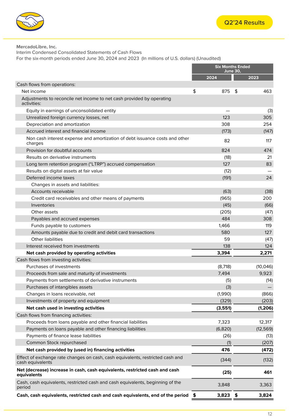 MercadoLibre, Inc. Interim Condensed Consolidated Statements of Cash Flows For the six-month periods ended June 30, 2024 and 2023 (In millions of U.S. dollars) (Unaudited) Six Months Ended June 30, 2024 2023 Cash flows from operations: Net income $ 875 $ 463 Adjustments to reconcile net income to net cash provided by operating activities: Equity in earnings of unconsolidated entity — (3) Unrealized foreign currency losses, net 123 305 Depreciation and amortization 308 254 Accrued interest and financial income (173) (147) Non cash interest expense and amortization of debt issuance costs and other charges 82 117 Provision for doubtful accounts 824 474 Results on derivative instruments (18) 21 Long term retention program (“LTRP”) accrued compensation 127 83 Results on digital assets at fair value (12) — Deferred income taxes (191) 24 Changes in assets and liabilities: Accounts receivable (63) (38) Credit card receivables and other means of payments (965) 200 Inventories (45) (66) Other assets (205) (47) Payables and accrued expenses 484 308 Funds payable to customers 1,466 119 Amounts payable due to credit and debit card transactions 580 127 Other liabilities 59 (47) Interest received from investments 138 124 Net cash provided by operating activities 3,394 2,271 Cash flows from investing activities: Purchases of investments (8,718) (10,046) Proceeds from sale and maturity of investments 7,494 9,923 Payments from settlements of derivative instruments (5) (14) Purchases of intangibles assets (3) — Changes in loans receivable, net (1,990) (866) Investments of property and equipment (329) (203) Net cash used in investing activities (3,551) (1,206) Cash flows from financing activities: Proceeds from loans payable and other financial liabilities 7,323 12,317 Payments on loans payable and other financing liabilities (6,820) (12,569) Payments of finance lease liabilities (26) (13) Common Stock repurchased (1) (207) Net cash provided by (used in) financing activities 476 (472) Effect of exchange rate changes on cash, cash equivalents, restricted cash and cash equivalents (344) (132) Net (decrease) increase in cash, cash equivalents, restricted cash and cash equivalents (25) 461 Cash, cash equivalents, restricted cash and cash equivalents, beginning of the period 3,848 3,363 Cash, cash equivalents, restricted cash and cash equivalents, end of the period $ 3,823 $ 3,824 Q2’24 Results 12
