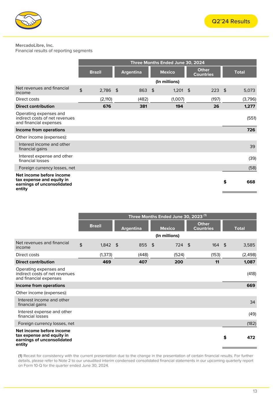 MercadoLibre, Inc. Financial results of reporting segments Three Months Ended June 30, 2024 Brazil Argentina Mexico Other Countries Total (In millions) Net revenues and financial income $ 2,786 $ 863 $ 1,201 $ 223 $ 5,073 Direct costs (2,110) (482) (1,007) (197) (3,796) Direct contribution 676 381 194 26 1,277 Operating expenses and indirect costs of net revenues and financial expenses (551) Income from operations 726 Other income (expenses): Interest income and other financial gains 39 Interest expense and other financial losses (39) Foreign currency losses, net (58) Net income before income tax expense and equity in earnings of unconsolidated entity $ 668 Three Months Ended June 30, 2023 (1) Brazil Argentina Mexico Other Countries Total (In millions) Net revenues and financial income $ 1,842 $ 855 $ 724 $ 164 $ 3,585 Direct costs (1,373) (448) (524) (153) (2,498) Direct contribution 469 407 200 11 1,087 Operating expenses and indirect costs of net revenues and financial expenses (418) Income from operations 669 Other income (expenses): Interest income and other financial gains 34 Interest expense and other financial losses (49) Foreign currency losses, net (182) Net income before income tax expense and equity in earnings of unconsolidated entity $ 472 Q2’24 Results (1) Recast for consistency with the current presentation due to the change in the presentation of certain financial results. For further details, please refer to Note 2 to our unaudited interim condensed consolidated financial statements in our upcoming quarterly report on Form 10-Q for the quarter ended June 30, 2024. 13
