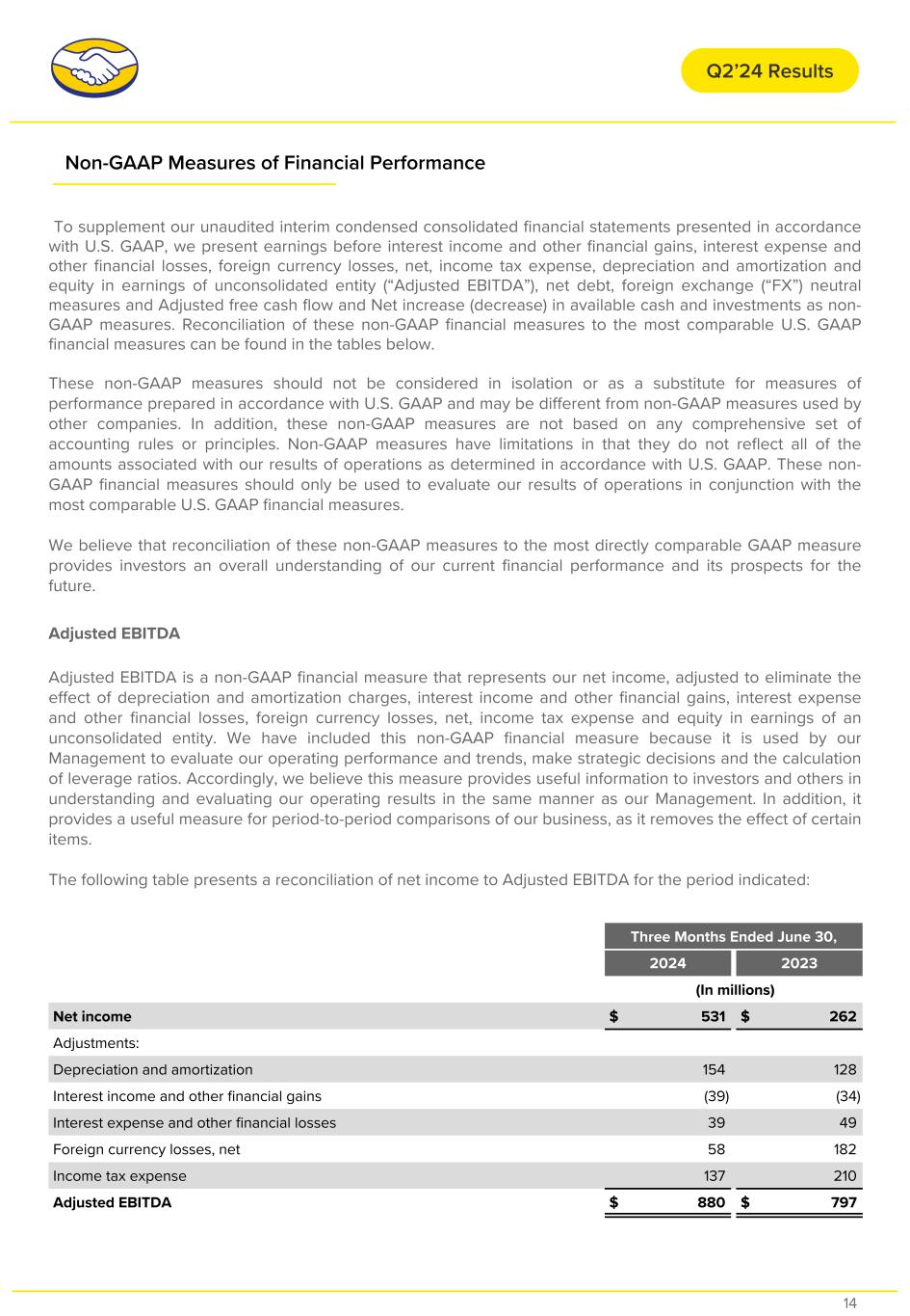To supplement our unaudited interim condensed consolidated financial statements presented in accordance with U.S. GAAP, we present earnings before interest income and other financial gains, interest expense and other financial losses, foreign currency losses, net, income tax expense, depreciation and amortization and equity in earnings of unconsolidated entity (“Adjusted EBITDA”), net debt, foreign exchange (“FX”) neutral measures and Adjusted free cash flow and Net increase (decrease) in available cash and investments as non- GAAP measures. Reconciliation of these non-GAAP financial measures to the most comparable U.S. GAAP financial measures can be found in the tables below. These non-GAAP measures should not be considered in isolation or as a substitute for measures of performance prepared in accordance with U.S. GAAP and may be different from non-GAAP measures used by other companies. In addition, these non-GAAP measures are not based on any comprehensive set of accounting rules or principles. Non-GAAP measures have limitations in that they do not reflect all of the amounts associated with our results of operations as determined in accordance with U.S. GAAP. These non- GAAP financial measures should only be used to evaluate our results of operations in conjunction with the most comparable U.S. GAAP financial measures. We believe that reconciliation of these non-GAAP measures to the most directly comparable GAAP measure provides investors an overall understanding of our current financial performance and its prospects for the future. Adjusted EBITDA Adjusted EBITDA is a non-GAAP financial measure that represents our net income, adjusted to eliminate the effect of depreciation and amortization charges, interest income and other financial gains, interest expense and other financial losses, foreign currency losses, net, income tax expense and equity in earnings of an unconsolidated entity. We have included this non-GAAP financial measure because it is used by our Management to evaluate our operating performance and trends, make strategic decisions and the calculation of leverage ratios. Accordingly, we believe this measure provides useful information to investors and others in understanding and evaluating our operating results in the same manner as our Management. In addition, it provides a useful measure for period-to-period comparisons of our business, as it removes the effect of certain items. The following table presents a reconciliation of net income to Adjusted EBITDA for the period indicated: Three Months Ended June 30, 2024 2023 (In millions) Net income $ 531 $ 262 Adjustments: Depreciation and amortization 154 128 Interest income and other financial gains (39) (34) Interest expense and other financial losses 39 49 Foreign currency losses, net 58 182 Income tax expense 137 210 Adjusted EBITDA $ 880 $ 797 Q2’24 Results Non-GAAP Measures of Financial Performance 14