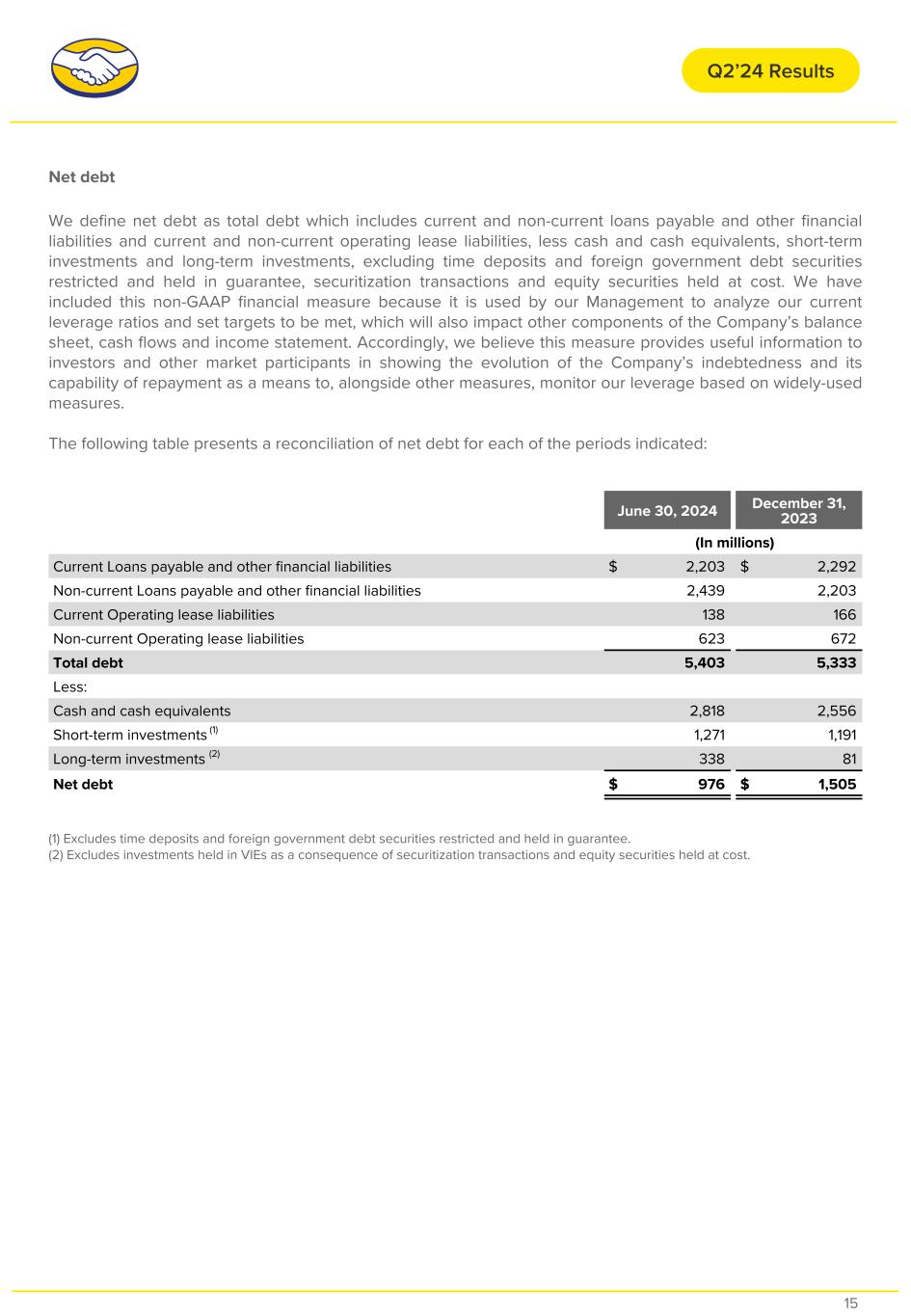 Net debt We define net debt as total debt which includes current and non-current loans payable and other financial liabilities and current and non-current operating lease liabilities, less cash and cash equivalents, short-term investments and long-term investments, excluding time deposits and foreign government debt securities restricted and held in guarantee, securitization transactions and equity securities held at cost. We have included this non-GAAP financial measure because it is used by our Management to analyze our current leverage ratios and set targets to be met, which will also impact other components of the Company’s balance sheet, cash flows and income statement. Accordingly, we believe this measure provides useful information to investors and other market participants in showing the evolution of the Company’s indebtedness and its capability of repayment as a means to, alongside other measures, monitor our leverage based on widely-used measures. The following table presents a reconciliation of net debt for each of the periods indicated: (1) Excludes time deposits and foreign government debt securities restricted and held in guarantee. (2) Excludes investments held in VIEs as a consequence of securitization transactions and equity securities held at cost. June 30, 2024 December 31, 2023 (In millions) Current Loans payable and other financial liabilities $ 2,203 $ 2,292 Non-current Loans payable and other financial liabilities 2,439 2,203 Current Operating lease liabilities 138 166 Non-current Operating lease liabilities 623 672 Total debt 5,403 5,333 Less: Cash and cash equivalents 2,818 2,556 Short-term investments (1) 1,271 1,191 Long-term investments (2) 338 81 Net debt $ 976 $ 1,505 Q2’24 Results 15