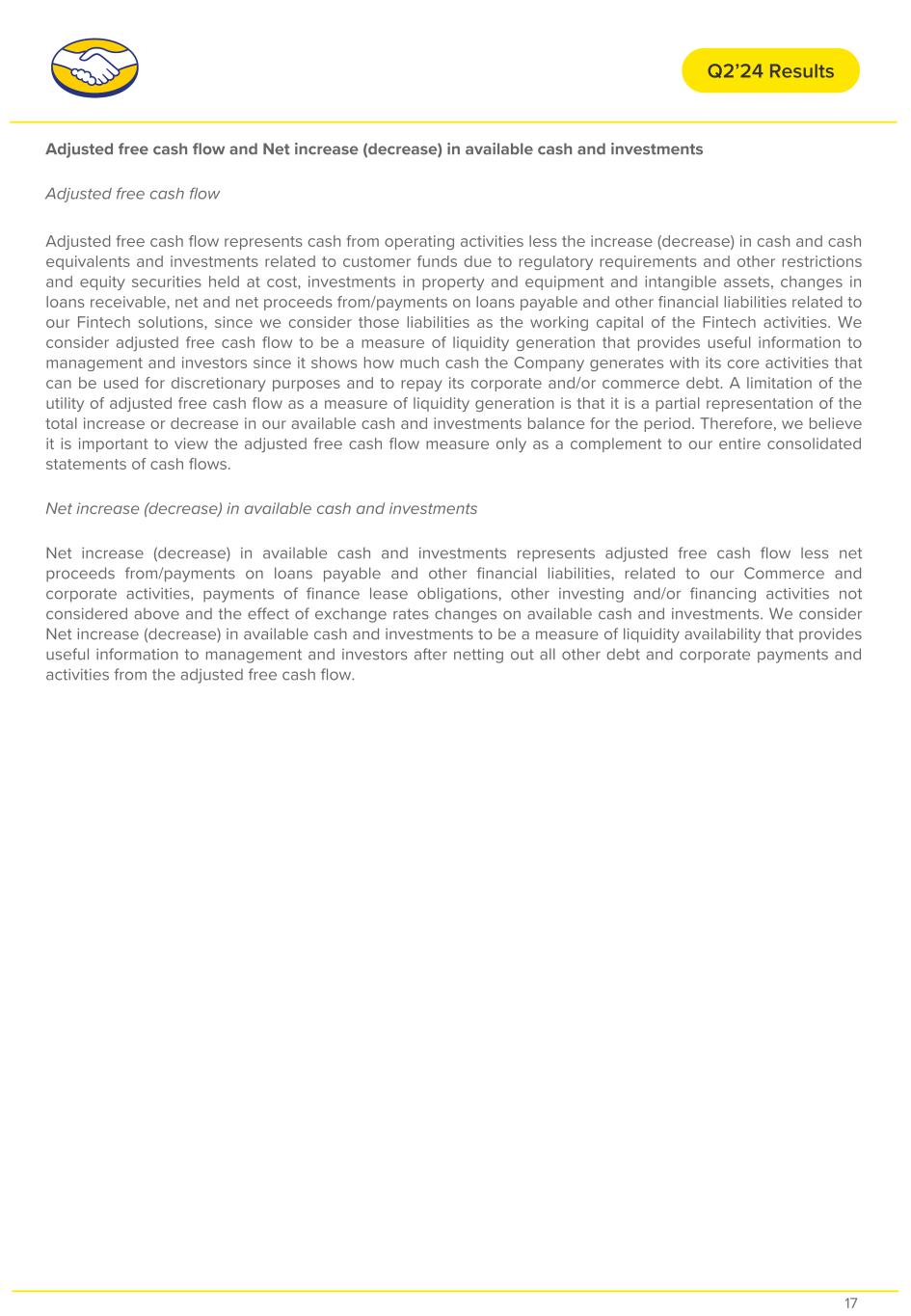 Adjusted free cash flow and Net increase (decrease) in available cash and investments Adjusted free cash flow Adjusted free cash flow represents cash from operating activities less the increase (decrease) in cash and cash equivalents and investments related to customer funds due to regulatory requirements and other restrictions and equity securities held at cost, investments in property and equipment and intangible assets, changes in loans receivable, net and net proceeds from/payments on loans payable and other financial liabilities related to our Fintech solutions, since we consider those liabilities as the working capital of the Fintech activities. We consider adjusted free cash flow to be a measure of liquidity generation that provides useful information to management and investors since it shows how much cash the Company generates with its core activities that can be used for discretionary purposes and to repay its corporate and/or commerce debt. A limitation of the utility of adjusted free cash flow as a measure of liquidity generation is that it is a partial representation of the total increase or decrease in our available cash and investments balance for the period. Therefore, we believe it is important to view the adjusted free cash flow measure only as a complement to our entire consolidated statements of cash flows. Net increase (decrease) in available cash and investments Net increase (decrease) in available cash and investments represents adjusted free cash flow less net proceeds from/payments on loans payable and other financial liabilities, related to our Commerce and corporate activities, payments of finance lease obligations, other investing and/or financing activities not considered above and the effect of exchange rates changes on available cash and investments. We consider Net increase (decrease) in available cash and investments to be a measure of liquidity availability that provides useful information to management and investors after netting out all other debt and corporate payments and activities from the adjusted free cash flow. Q2’24 Results 17