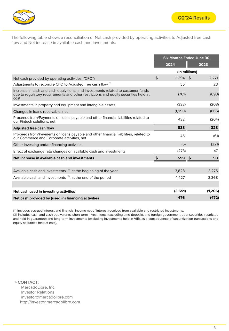 > CONTACT: MercadoLibre, Inc. Investor Relations investor@mercadolibre.com http://investor.mercadolibre.com The following table shows a reconciliation of Net cash provided by operating activities to Adjusted free cash flow and Net increase in available cash and investments: Q2’24 Results Six Months Ended June 30, 2024 2023 (In millions) Net cash provided by operating activities ("CFO") $ 3,394 $ 2,271 Adjustments to reconcile CFO to Adjusted free cash flow (1) 35 23 Increase in cash and cash equivalents and investments related to customer funds due to regulatory requirements and other restrictions and equity securities held at cost (701) (693) Investments in property and equipment and intangible assets (332) (203) Changes in loans receivable, net (1,990) (866) Proceeds from/Payments on loans payable and other financial liabilities related to our Fintech solutions, net 432 (204) Adjusted free cash flow 838 328 Proceeds from/Payments on loans payable and other financial liabilities, related to our Commerce and Corporate activities, net 45 (61) Other investing and/or financing activities (6) (221) Effect of exchange rate changes on available cash and investments (278) 47 Net increase in available cash and investments $ 599 $ 93 Available cash and investments (2), at the beginning of the year 3,828 3,275 Available cash and investments (2), at the end of the period 4,427 3,368 Net cash used in investing activities (3,551) (1,206) Net cash provided by (used in) financing activities 476 (472) (1) Includes accrued interest and financial income net of interest received from available and restricted investments. (2) Includes cash and cash equivalents, short-term investments (excluding time deposits and foreign government debt securities restricted and held in guarantee) and long-term investments (excluding investments held in VIEs as a consequence of securitization transactions and equity securities held at cost). 18