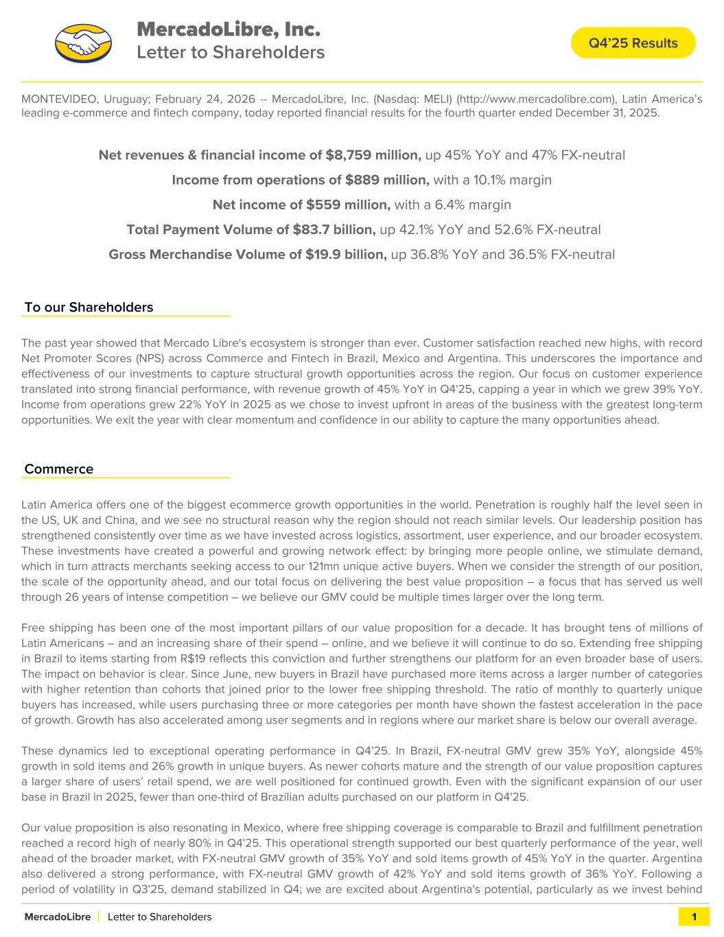 MONTEVIDEO, Uruguay; February  24, 2026 -- MercadoLibre, Inc. (Nasdaq: MELI) (http://www.mercadolibre.com), Latin America’s leading e-commerce and fintech company, today reported financial results for the fourth quarter ended December 31, 2025. Net revenues & financial income of $8,759 million, up 45% YoY and 47% FX-neutral Income from operations of $889 million, with a 10.1% margin Net income of $559 million, with a 6.4% margin Total Payment Volume of $83.7 billion, up 42.1% YoY and 52.6% FX-neutral Gross Merchandise Volume of $19.9 billion, up 36.8% YoY and 36.5% FX-neutral To our Shareholders The past year showed that Mercado Libre's ecosystem is stronger than ever. Customer satisfaction reached new highs, with record Net Promoter Scores (NPS) across Commerce and Fintech in Brazil, Mexico and Argentina. This underscores the importance and effectiveness of our investments to capture structural growth opportunities across the region. Our focus on customer experience translated into strong financial performance, with revenue growth of 45% YoY in Q4'25, capping a year in which we grew 39% YoY. Income from operations grew 22% YoY in 2025 as we chose to invest upfront in areas of the business with the greatest long-term opportunities. We exit the year with clear momentum and confidence in our ability to capture the many opportunities ahead. Commerce Latin America offers one of the biggest ecommerce growth opportunities in the world. Penetration is roughly half the level seen in the US, UK and China, and we see no structural reason why the region should not reach similar levels. Our leadership position has strengthened consistently over time as we have invested across logistics, assortment, user experience, and our broader ecosystem. These investments have created a powerful and growing network effect: by bringing more people online, we stimulate demand, which in turn attracts merchants seeking access to our 121mn unique active buyers. When we consider the strength of our position, the scale of the opportunity ahead, and our total focus on delivering the best value proposition – a focus that has served us well through 26 years of intense competition – we believe our GMV could be multiple times larger over the long term. Free shipping has been one of the most important pillars of our value proposition for a decade. It has brought tens of millions of Latin Americans – and an increasing share of their spend – online, and we believe it will continue to do so. Extending free shipping in Brazil to items starting from R$19 reflects this conviction and further strengthens our platform for an even broader base of users. The impact on behavior is clear. Since June, new buyers in Brazil have purchased more items across a larger number of categories with higher retention than cohorts that joined prior to the lower free shipping threshold. The ratio of monthly to quarterly unique buyers has increased, while users purchasing three or more categories per month have shown the fastest acceleration in the pace of growth. Growth has also accelerated among user segments and in regions where our market share is below our overall average. These dynamics led to exceptional operating performance in Q4’25. In Brazil, FX-neutral GMV grew 35% YoY, alongside 45% growth in sold items and 26% growth in unique buyers. As newer cohorts mature and the strength of our value proposition captures a larger share of users’ retail spend, we are well positioned for continued growth. Even with the significant expansion of our user base in Brazil in 2025, fewer than one-third of Brazilian adults purchased on our platform in Q4'25. Our value proposition is also resonating in Mexico, where free shipping coverage is comparable to Brazil and fulfillment penetration reached a record high of nearly 80% in Q4'25. This operational strength supported our best quarterly performance of the year, well ahead of the broader market, with FX-neutral GMV growth of 35% YoY and sold items growth of 45% YoY in the quarter. Argentina also delivered a strong performance, with FX-neutral GMV growth of 42% YoY and sold items growth of 36% YoY. Following a period of volatility in Q3'25, demand stabilized in Q4; we are excited about Argentina's potential, particularly as we invest behind MercadoLibre, Inc. Letter to Shareholders MercadoLibre Letter to Shareholders 1 Q4’25 Results
