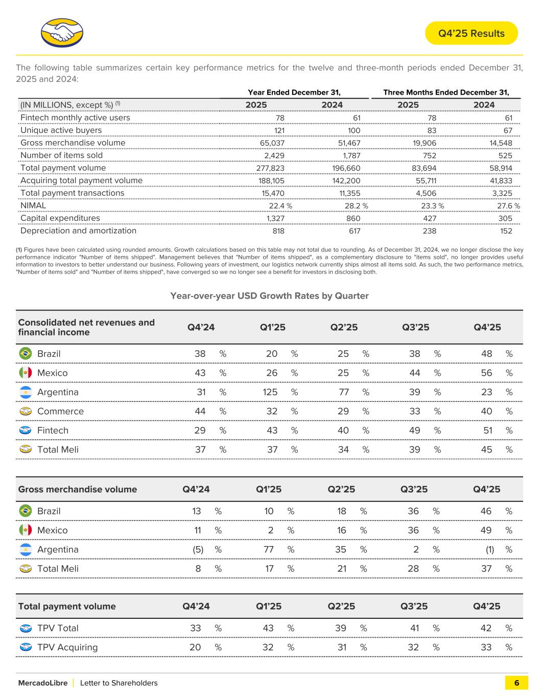 The following table summarizes certain key performance metrics for the twelve and three-month periods ended December  31, 2025 and 2024: (1) Figures have been calculated using rounded amounts. Growth calculations based on this table may not total due to rounding. As of December 31, 2024, we no longer disclose the key performance indicator "Number of items shipped". Management believes that "Number of items shipped", as a complementary disclosure to "items sold", no longer provides useful information to investors to better understand our business. Following years of investment, our logistics network currently ships almost all items sold. As such, the two performance metrics, "Number of items sold" and "Number of items shipped", have converged so we no longer see a benefit for investors in disclosing both. Year-over-year USD Growth Rates by Quarter Consolidated net revenues and financial income Q4’24 Q1’25 Q2’25 Q3’25 Q4’25 Brazil 38 % 20 % 25 % 38 % 48 % Mexico 43 % 26 % 25 % 44 % 56 % Argentina 31 % 125 % 77 % 39 % 23 % Commerce 44 % 32 % 29 % 33 % 40 % Fintech 29 % 43 % 40 % 49 % 51 % Total Meli 37 % 37 % 34 % 39 % 45 % Gross merchandise volume Q4’24 Q1’25 Q2’25 Q3’25 Q4’25 Brazil 13 % 10 % 18 % 36 % 46 % Mexico 11 % 2 % 16 % 36 % 49 % Argentina (5) % 77 % 35 % 2 % (1) % Total Meli 8 % 17 % 21 % 28 % 37 % Total payment volume Q4’24 Q1’25 Q2’25 Q3’25 Q4’25 TPV Total 33 % 43 % 39 % 41 % 42 % TPV Acquiring 20 % 32 % 31 % 32 % 33 % MercadoLibre Letter to Shareholders 6 Year Ended December 31, Three Months Ended December 31, (IN MILLIONS, except %) (1) 2025 2024 2025 2024 Fintech monthly active users 78 61 78 61 Unique active buyers 121 100 83 67 Gross merchandise volume 65,037 51,467 19,906 14,548 Number of items sold 2,429 1,787 752 525 Total payment volume 277,823 196,660 83,694 58,914 Acquiring total payment volume 188,105 142,200 55,711 41,833 Total payment transactions 15,470 11,355 4,506 3,325 NIMAL 22.4 % 28.2 % 23.3 % 27.6 % Capital expenditures 1,327 860 427 305 Depreciation and amortization 818 617 238 152 Q4’25 Results
