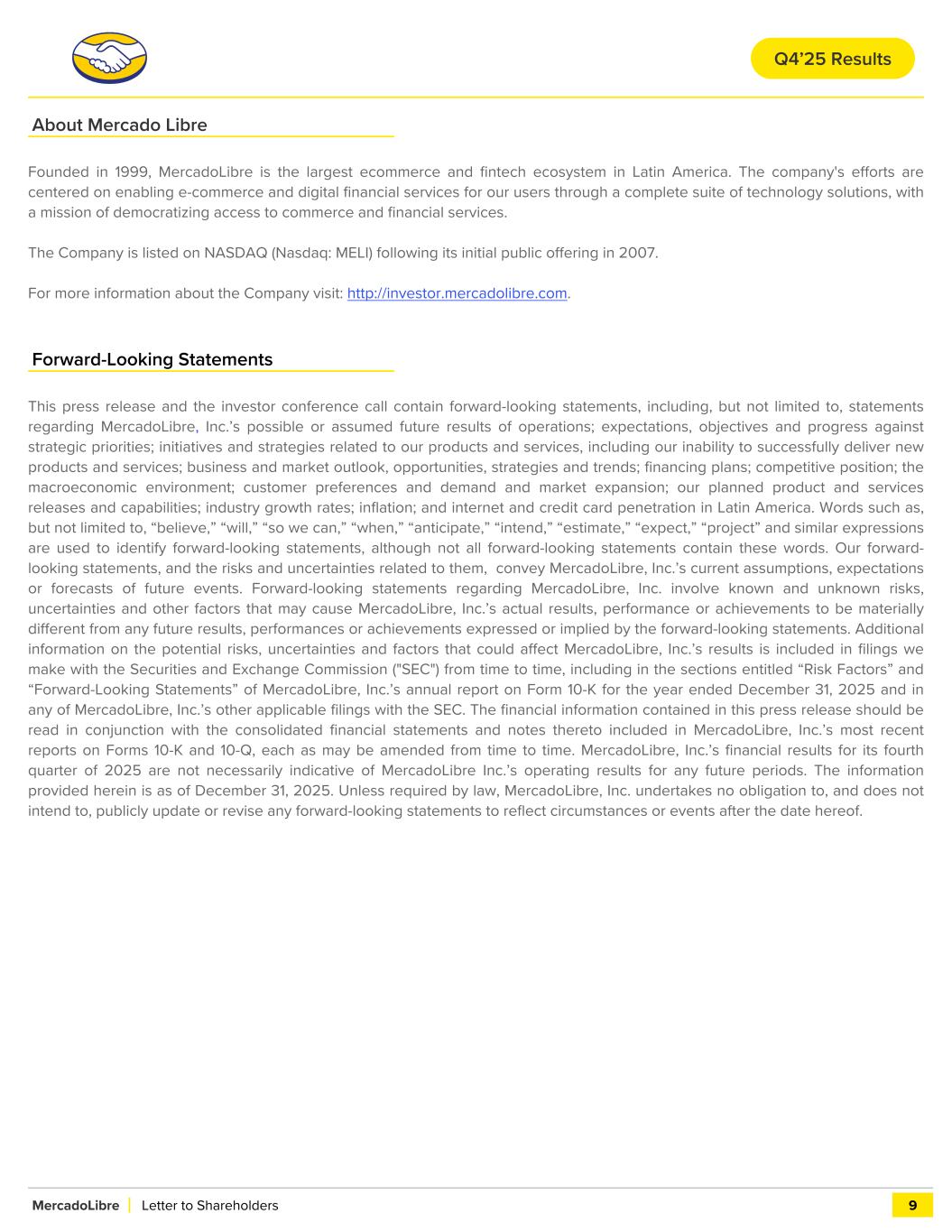 About Mercado Libre Founded in 1999, MercadoLibre is the largest ecommerce and fintech ecosystem in Latin America. The company's efforts are centered on enabling e-commerce and digital financial services for our users through a complete suite of technology solutions, with a mission of democratizing access to commerce and financial services. The Company is listed on NASDAQ (Nasdaq: MELI) following its initial public offering in 2007. For more information about the Company visit: http://investor.mercadolibre.com. Forward-Looking Statements This press release and the investor conference call contain forward-looking statements, including, but not limited to, statements regarding MercadoLibre, Inc.’s possible or assumed future results of operations; expectations, objectives and progress against strategic priorities; initiatives and strategies related to our products and services, including our inability to successfully deliver new products and services; business and market outlook, opportunities, strategies and trends; financing plans; competitive position; the macroeconomic environment; customer preferences and demand and market expansion; our planned product and services releases and capabilities; industry growth rates; inflation; and internet and credit card penetration in Latin America. Words such as, but not limited to, “believe,” “will,” “so we can,” “when,” “anticipate,” “intend,” “estimate,” “expect,” “project” and similar expressions are used to identify forward-looking statements, although not all forward-looking statements contain these words. Our forward- looking statements, and the risks and uncertainties related to them, convey MercadoLibre, Inc.’s current assumptions, expectations or forecasts of future events. Forward-looking statements regarding MercadoLibre, Inc. involve known and unknown risks, uncertainties and other factors that may cause MercadoLibre, Inc.’s actual results, performance or achievements to be materially different from any future results, performances or achievements expressed or implied by the forward-looking statements. Additional information on the potential risks, uncertainties and factors that could affect MercadoLibre, Inc.’s results is included in filings we make with the Securities and Exchange Commission ("SEC") from time to time, including in the sections entitled “Risk Factors” and “Forward-Looking Statements” of MercadoLibre, Inc.’s annual report on Form 10-K for the year ended December 31, 2025 and in any of MercadoLibre, Inc.’s other applicable filings with the SEC. The financial information contained in this press release should be read in conjunction with the consolidated financial statements and notes thereto included in MercadoLibre, Inc.’s most recent reports on Forms 10-K and 10-Q, each as may be amended from time to time. MercadoLibre, Inc.’s financial results for its fourth quarter of 2025 are not necessarily indicative of MercadoLibre Inc.’s operating results for any future periods. The information provided herein is as of December 31, 2025. Unless required by law, MercadoLibre, Inc. undertakes no obligation to, and does not intend to, publicly update or revise any forward-looking statements to reflect circumstances or events after the date hereof. MercadoLibre Letter to Shareholders 9 Q4’25 Results