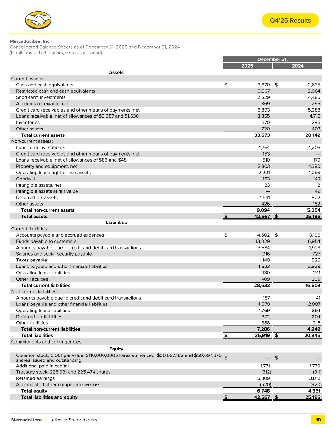 MercadoLibre, Inc. Consolidated Balance Sheets as of December 31, 2025 and December 31, 2024 (In millions of U.S. dollars, except par value) December 31, 2025 2024 Assets Current assets: Cash and cash equivalents $ 3,670 $ 2,635 Restricted cash and cash equivalents 9,867 2,064 Short-term investments 2,629 4,485 Accounts receivable, net 369 255 Credit card receivables and other means of payments, net 6,893 5,288 Loans receivable, net of allowances of $3,057 and $1,630 8,855 4,716 Inventories 570 296 Other assets 720 403 Total current assets 33,573 20,142 Non-current assets: Long-term investments 1,764 1,203 Credit card receivables and other means of payments, net 153 — Loans receivable, net of allowances of $86 and $48 510 179 Property and equipment, net 2,303 1,380 Operating lease right-of-use assets 2,201 1,098 Goodwill 163 149 Intangible assets, net 33 12 Intangible assets at fair value — 49 Deferred tax assets 1,541 802 Other assets 426 182 Total non-current assets 9,094 5,054 Total assets $ 42,667 $ 25,196 Liabilities Current liabilities: Accounts payable and accrued expenses $ 4,502 $ 3,196 Funds payable to customers 13,029 6,954 Amounts payable due to credit and debit card transactions 3,584 1,923 Salaries and social security payable 916 727 Taxes payable 1,140 525 Loans payable and other financial liabilities 4,623 2,828 Operating lease liabilities 430 241 Other liabilities 409 209 Total current liabilities 28,633 16,603 Non-current liabilities: Amounts payable due to credit and debit card transactions 187 41 Loans payable and other financial liabilities 4,570 2,887 Operating lease liabilities 1,769 894 Deferred tax liabilities 372 204 Other liabilities 388 216 Total non-current liabilities 7,286 4,242 Total liabilities $ 35,919 $ 20,845 Commitments and contingencies Equity Common stock, 0.001 par value, $110,000,000 shares authorized, $50,697,182 and $50,697,375 shares issued and outstanding $ — $ — Additional paid-in capital 1,771 1,770 Treasury stock, 225,931 and 225,474 shares (312) (311) Retained earnings 5,809 3,812 Accumulated other comprehensive loss (520) (920) Total equity 6,748 4,351 Total liabilities and equity $ 42,667 $ 25,196 MercadoLibre Letter to Shareholders 10 Q4’25 Results