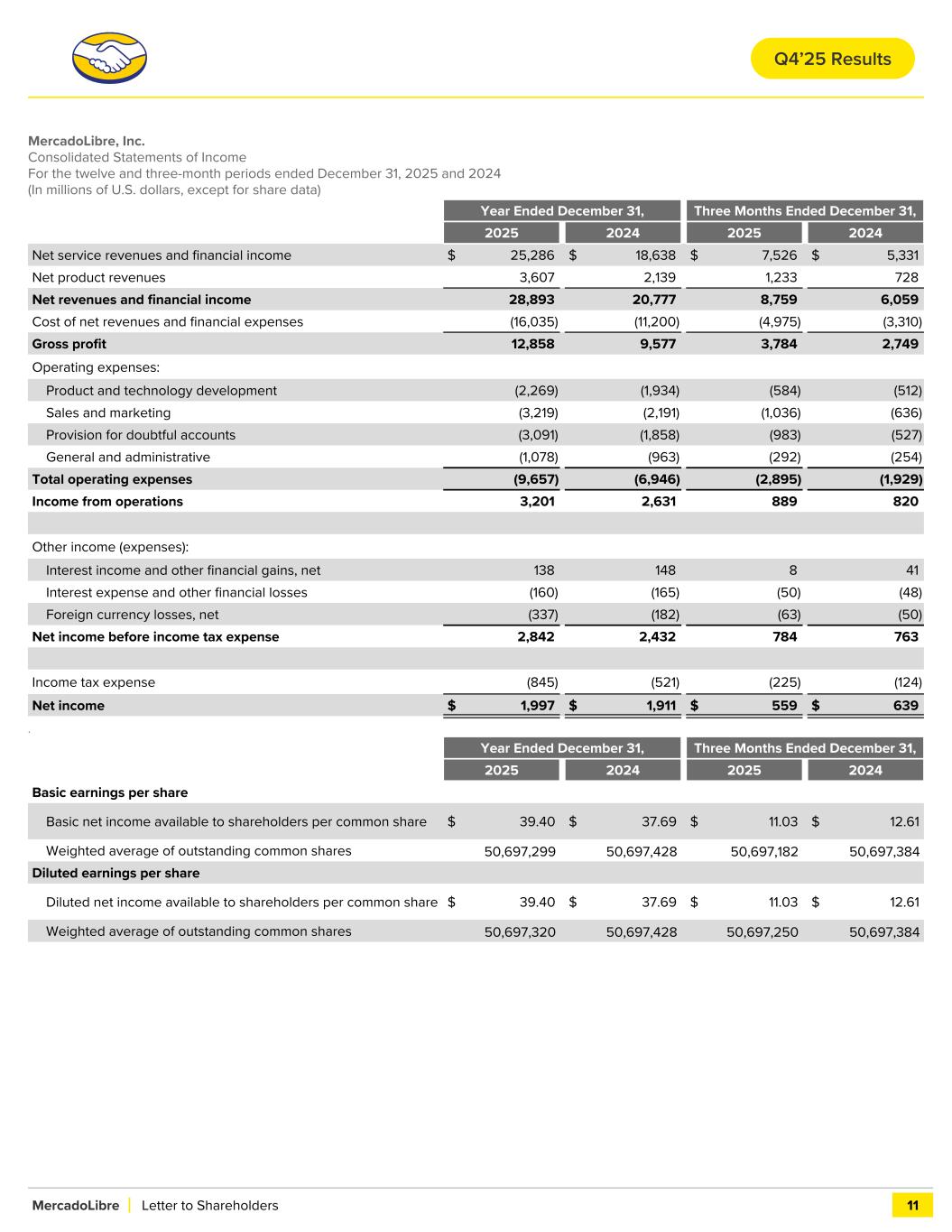 MercadoLibre, Inc. Consolidated Statements of Income For the twelve and three-month periods ended December 31, 2025 and 2024 (In millions of U.S. dollars, except for share data) Year Ended December 31, Three Months Ended December 31, 2025 2024 2025 2024 Net service revenues and financial income $ 25,286 $ 18,638 $ 7,526 $ 5,331 Net product revenues 3,607 2,139 1,233 728 Net revenues and financial income 28,893 20,777 8,759 6,059 Cost of net revenues and financial expenses (16,035) (11,200) (4,975) (3,310) Gross profit 12,858 9,577 3,784 2,749 Operating expenses: Product and technology development (2,269) (1,934) (584) (512) Sales and marketing (3,219) (2,191) (1,036) (636) Provision for doubtful accounts (3,091) (1,858) (983) (527) General and administrative (1,078) (963) (292) (254) Total operating expenses (9,657) (6,946) (2,895) (1,929) Income from operations 3,201 2,631 889 820 Other income (expenses): Interest income and other financial gains, net 138 148 8 41 Interest expense and other financial losses (160) (165) (50) (48) Foreign currency losses, net (337) (182) (63) (50) Net income before income tax expense 2,842 2,432 784 763 Income tax expense (845) (521) (225) (124) Net income $ 1,997 $ 1,911 $ 559 $ 639 . Year Ended December 31, Three Months Ended December 31, 2025 2024 2025 2024 Basic earnings per share Basic net income available to shareholders per common share $ 39.40 $ 37.69 $ 11.03 $ 12.61 Weighted average of outstanding common shares 50,697,299 50,697,428 50,697,182 50,697,384 Diluted earnings per share Diluted net income available to shareholders per common share $ 39.40 $ 37.69 $ 11.03 $ 12.61 Weighted average of outstanding common shares 50,697,320 50,697,428 50,697,250 50,697,384 MercadoLibre Letter to Shareholders 11 Q4’25 Results