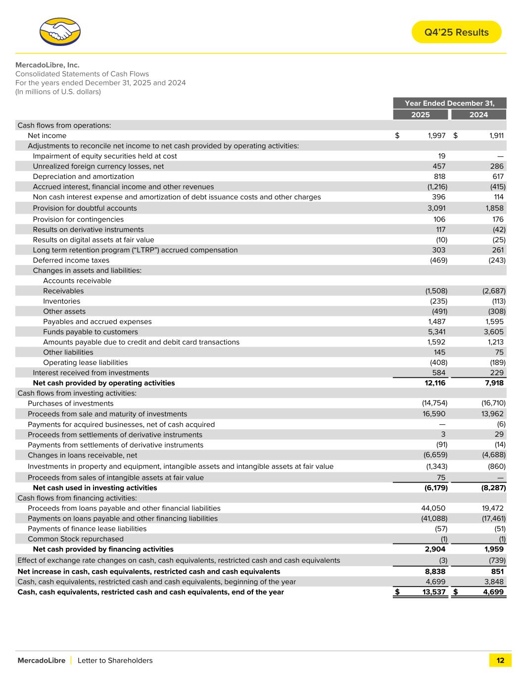 MercadoLibre, Inc. Consolidated Statements of Cash Flows For the years ended December 31, 2025 and 2024 (In millions of U.S. dollars) Year Ended December 31, 2025 2024 Cash flows from operations: Net income $ 1,997 $ 1,911 Adjustments to reconcile net income to net cash provided by operating activities: Impairment of equity securities held at cost 19 — Unrealized foreign currency losses, net 457 286 Depreciation and amortization 818 617 Accrued interest, financial income and other revenues (1,216) (415) Non cash interest expense and amortization of debt issuance costs and other charges 396 114 Provision for doubtful accounts 3,091 1,858 Provision for contingencies 106 176 Results on derivative instruments 117 (42) Results on digital assets at fair value (10) (25) Long term retention program (“LTRP”) accrued compensation 303 261 Deferred income taxes (469) (243) Changes in assets and liabilities: Accounts receivable Receivables (1,508) (2,687) Inventories (235) (113) Other assets (491) (308) Payables and accrued expenses 1,487 1,595 Funds payable to customers 5,341 3,605 Amounts payable due to credit and debit card transactions 1,592 1,213 Other liabilities 145 75 Operating lease liabilities (408) (189) Interest received from investments 584 229 Net cash provided by operating activities 12,116 7,918 Cash flows from investing activities: Purchases of investments (14,754) (16,710) Proceeds from sale and maturity of investments 16,590 13,962 Payments for acquired businesses, net of cash acquired — (6) Proceeds from settlements of derivative instruments 3 29 Payments from settlements of derivative instruments (91) (14) Changes in loans receivable, net (6,659) (4,688) Investments in property and equipment, intangible assets and intangible assets at fair value (1,343) (860) Proceeds from sales of intangible assets at fair value 75 — Net cash used in investing activities (6,179) (8,287) Cash flows from financing activities: Proceeds from loans payable and other financial liabilities 44,050 19,472 Payments on loans payable and other financing liabilities (41,088) (17,461) Payments of finance lease liabilities (57) (51) Common Stock repurchased (1) (1) Net cash provided by financing activities 2,904 1,959 Effect of exchange rate changes on cash, cash equivalents, restricted cash and cash equivalents (3) (739) Net increase in cash, cash equivalents, restricted cash and cash equivalents 8,838 851 Cash, cash equivalents, restricted cash and cash equivalents, beginning of the year 4,699 3,848 Cash, cash equivalents, restricted cash and cash equivalents, end of the year $ 13,537 $ 4,699 MercadoLibre Letter to Shareholders 12 Q4’25 Results
