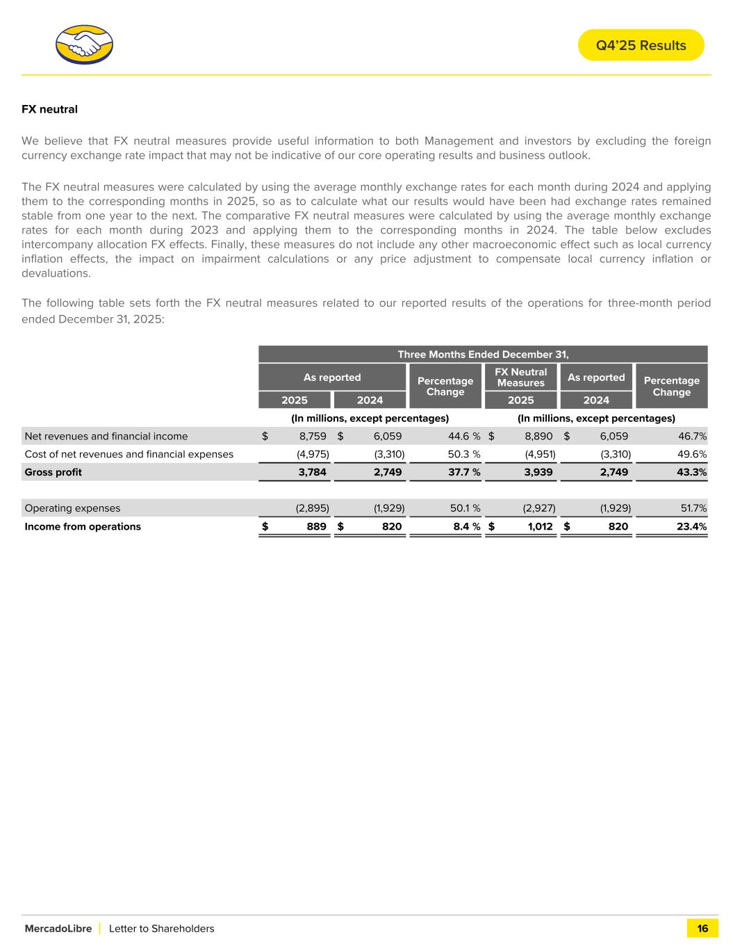 FX neutral We believe that FX neutral measures provide useful information to both Management and investors by excluding the foreign currency exchange rate impact that may not be indicative of our core operating results and business outlook. The FX neutral measures were calculated by using the average monthly exchange rates for each month during 2024 and applying them to the corresponding months in 2025, so as to calculate what our results would have been had exchange rates remained stable from one year to the next. The comparative FX neutral measures were calculated by using the average monthly exchange rates for each month during 2023 and applying them to the corresponding months in 2024. The table below excludes intercompany allocation FX effects. Finally, these measures do not include any other macroeconomic effect such as local currency inflation effects, the impact on impairment calculations or any price adjustment to compensate local currency inflation or devaluations. The following table sets forth the FX neutral measures related to our reported results of the operations for three-month period ended December 31, 2025: Three Months Ended December 31, As reported Percentage Change FX Neutral Measures As reported Percentage Change 2025 2024 2025 2024 (In millions, except percentages) (In millions, except percentages) Net revenues and financial income $ 8,759 $ 6,059 44.6 % $ 8,890 $ 6,059 46.7 % Cost of net revenues and financial expenses (4,975) (3,310) 50.3 % (4,951) (3,310) 49.6 % Gross profit 3,784 2,749 37.7 % 3,939 2,749 43.3 % Operating expenses (2,895) (1,929) 50.1 % (2,927) (1,929) 51.7 % Income from operations $ 889 $ 820 8.4 % $ 1,012 $ 820 23.4 % MercadoLibre Letter to Shareholders 16 Q4’25 Results