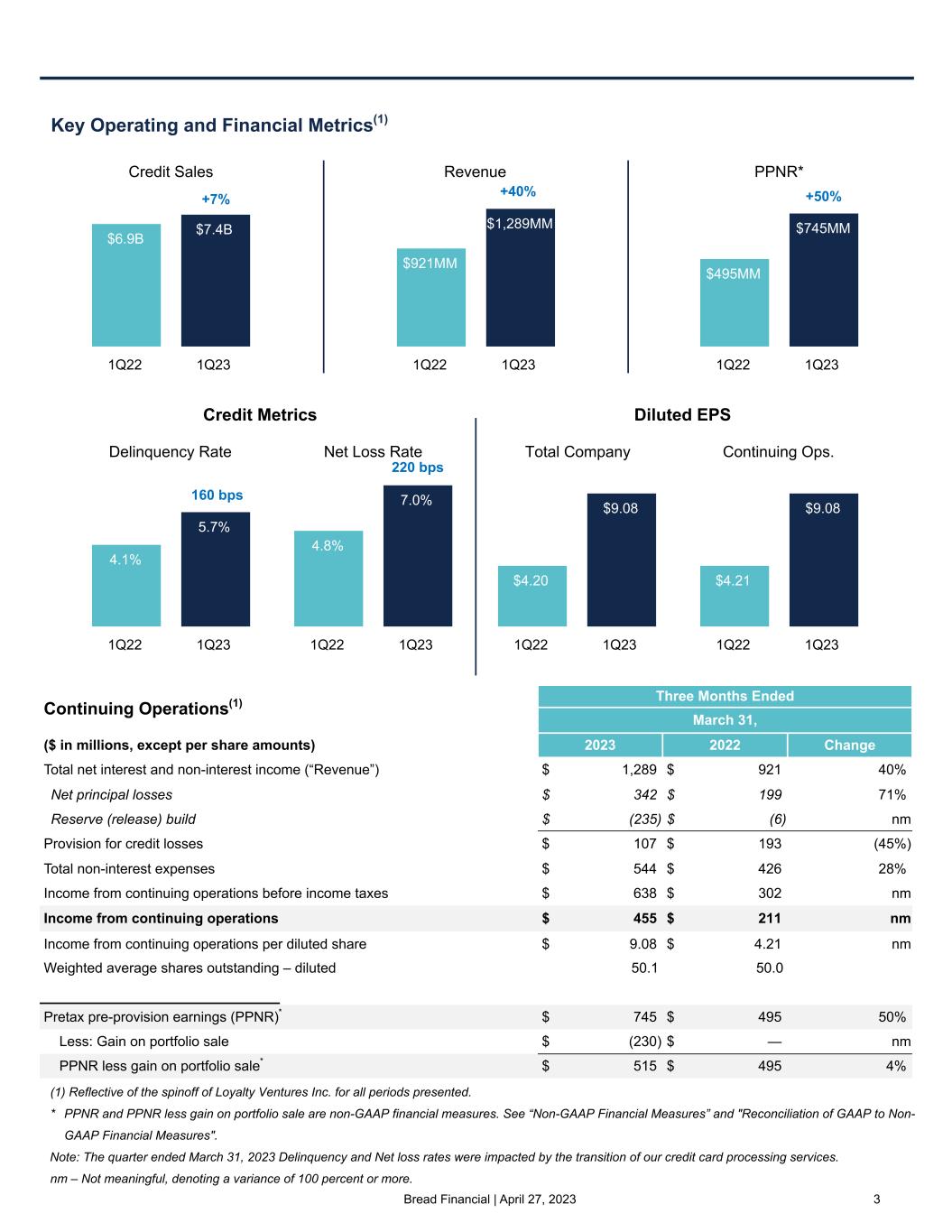 Bread Financial | April 27, 2023 2 2023 Full Year Outlook • Our 2023 full year outlook remains unchanged from our guidance provided in January 2023. • Macroeconomic Assumptions: “Our outlook assumes a more challenging macroeconomic landscape with continued inflationary pressures and an unemployment rate gradually moving to the mid-to-upper 4% range by year-end 2023. Our outlook continues to assume that interest rate increases by the Federal Reserve will result in a nominal benefit to total net interest income. • Average Loan Growth: “Based on our new and renewed brand partner announcements, visibility into our pipeline, and the current economic outlook, we expect full year 2023 average credit card and other loans to grow at a mid-single digit rate relative to 2022. • Total Revenue: “Total revenue growth for 2023, excluding the gain on portfolio sale, is anticipated to align with average loan growth, with a full year net interest margin similar to 2022. • Total Expenses: “As a result of ongoing investments in technology modernization, marketing, and product innovation, along with continued portfolio growth, we anticipate an increase in total full year expenses versus 2022, although the pace of growth is projected to decelerate versus the 2022 rate. We remain focused on delivering positive operating leverage for the full year as we manage the pace and timing of our investments to align with our full year revenue and growth outlook. • Net Loss Rate: “We expect a net loss rate of approximately 7% for 2023, inclusive of impacts from the 2022 transition of our credit card processing services, as well as continued pressure on consumers’ ability to pay due to persistent inflation. We remain confident in our long-term guidance of a through-the-cycle average net loss rate below our historical average of 6%. • Effective Tax Rate: “We expect our full year normalized effective tax rate to be in the range of 25% to 26%, with quarter-over-quarter variability due to the timing of certain discrete items.” CFO COMMENTARY “Our first quarter financial results reflected continued strong momentum, including 40% year-over-year revenue growth driven by the $230 million gain on portfolio sale and 17% average loan growth. Credit sales grew 7% in the quarter benefiting from the addition of brand partners like AAA and the NFL, as well as growth across brand partners. “For the eighth consecutive quarter, PPNR (excluding gains on portfolio sales) grew year-over-year, reflecting our ability to deliver quality growth. As expected, first quarter expenses slightly decreased versus the fourth quarter of 2022. However, we continued to invest in technology modernization, digital advancement, marketing, and product innovation, consistent with our focus areas. “During the quarter, we made significant progress growing our retail direct-to-consumer deposits and strengthening our capital position. The stability of our deposits was evident during the market volatility in March and we believe remains a strategic advantage for our company. The sale of the BJ's portfolio in the first quarter meaningfully enhanced our capital levels resulting in a 21% year-over-year improvement in our tangible book value per common share, to over $38. “From a credit perspective, our first quarter results were in line with our expectations as persistent inflation continues to broadly impact consumers, and losses were impacted by timing-related effects of the customer accommodations made in third quarter 2022 following the transition of our credit card processing services. While the second quarter net loss rate will be elevated due to related customer accommodations from the fourth quarter 2022, we expect a lower net loss rate in the second half of the year as we move past the impacts of the customer accommodations. As we previously indicated, our credit loss absorption capacity increased during the quarter, with our reserve rate up 80 basis points from the fourth quarter of 2022 predominantly due to seasonality and the BJ's portfolio sale. We continued to maintain conservative economic scenario weightings in our credit reserve modeling. We believe that given our conservative model assumptions, our loan loss reserve provides protection should we enter a more challenging macroeconomic environment. “We remain confident in our ability to enhance our balance sheet and deliver on our 2023 financial outlook." - Perry Beberman, executive vice president and chief financial officer