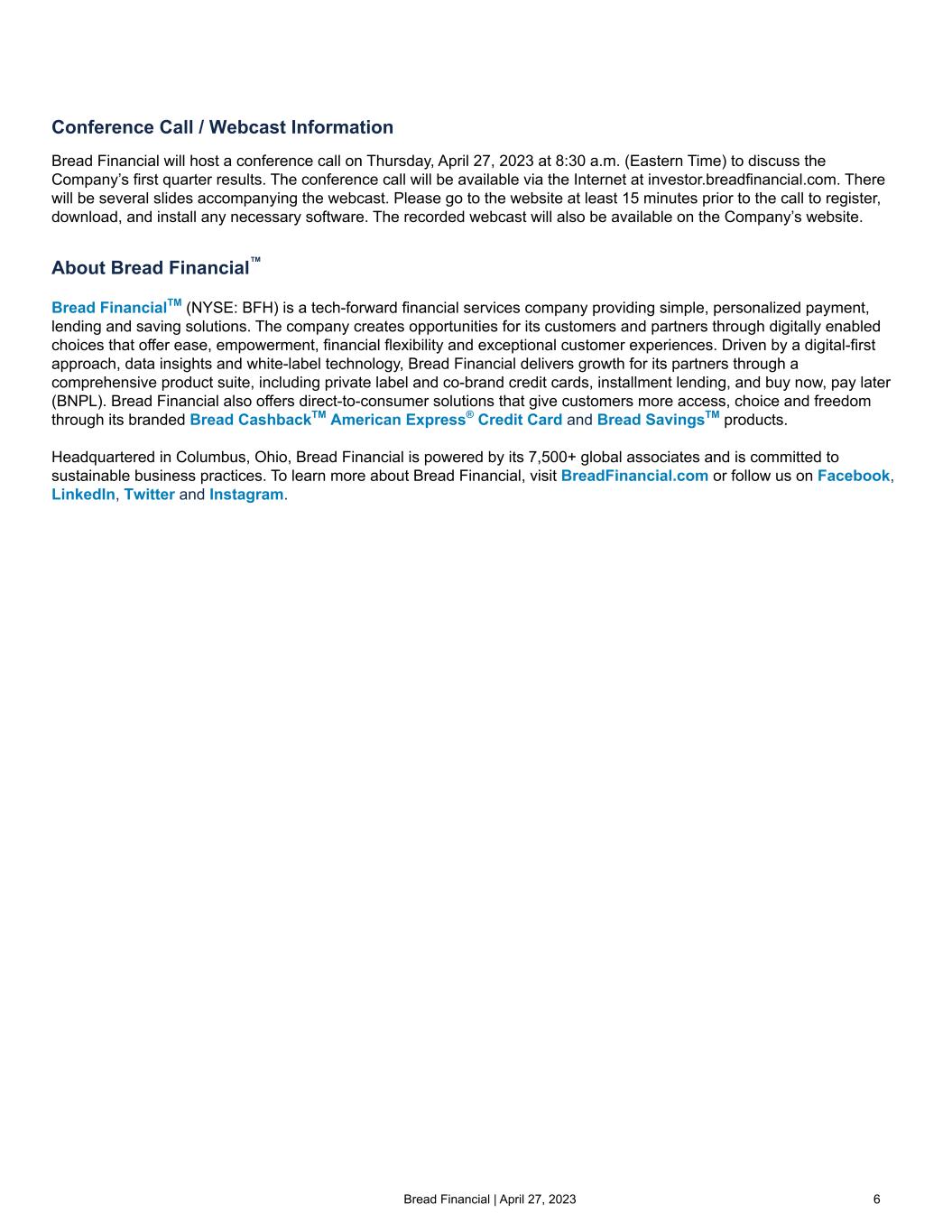 Bread Financial | April 27, 2023 6 Conference Call / Webcast Information Bread Financial will host a conference call on Thursday, April 27, 2023 at 8:30 a.m. (Eastern Time) to discuss the Company’s first quarter results. The conference call will be available via the Internet at investor.breadfinancial.com. There will be several slides accompanying the webcast. Please go to the website at least 15 minutes prior to the call to register, download, and install any necessary software. The recorded webcast will also be available on the Company’s website. About Bread Financial™ Bread FinancialTM (NYSE: BFH) is a tech-forward financial services company providing simple, personalized payment, lending and saving solutions. The company creates opportunities for its customers and partners through digitally enabled choices that offer ease, empowerment, financial flexibility and exceptional customer experiences. Driven by a digital-first approach, data insights and white-label technology, Bread Financial delivers growth for its partners through a comprehensive product suite, including private label and co-brand credit cards, installment lending, and buy now, pay later (BNPL). Bread Financial also offers direct-to-consumer solutions that give customers more access, choice and freedom through its branded Bread CashbackTM American Express® Credit Card and Bread SavingsTM products. Headquartered in Columbus, Ohio, Bread Financial is powered by its 7,500+ global associates and is committed to sustainable business practices. To learn more about Bread Financial, visit BreadFinancial.com or follow us on Facebook, LinkedIn, Twitter and Instagram.